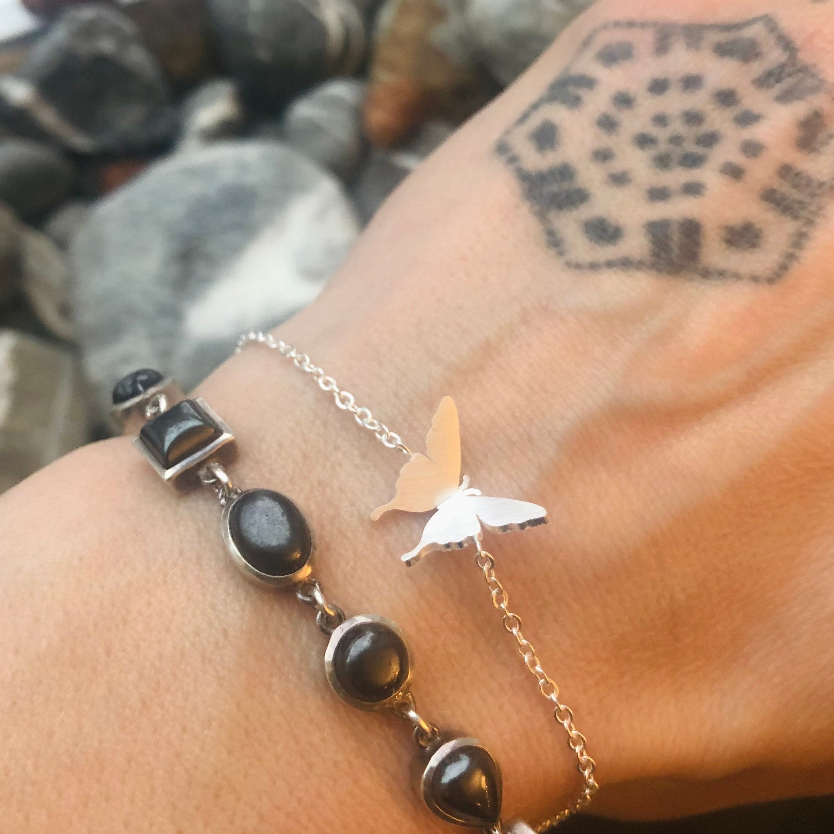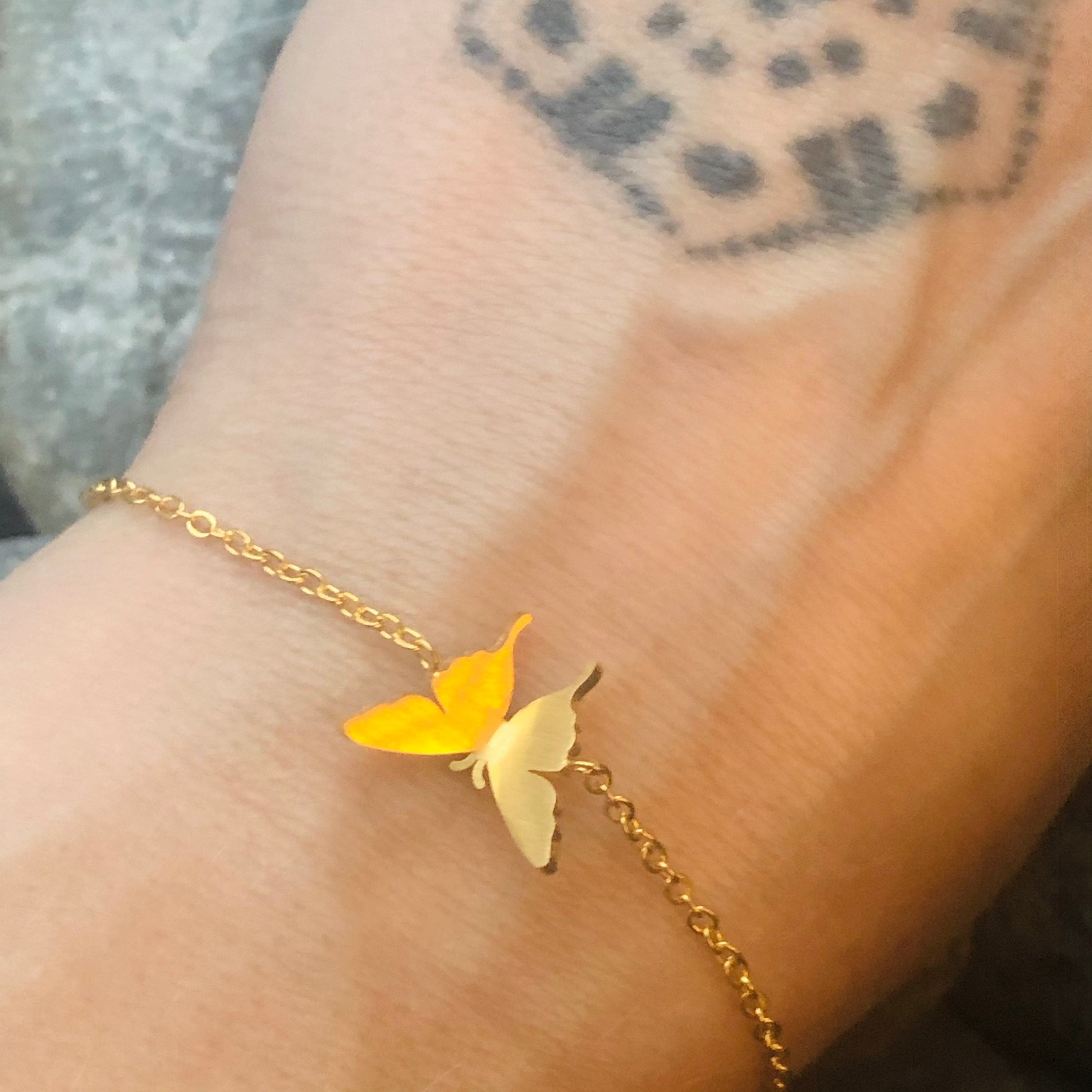 Spring butterflies 🦋 This bracelet is fully jewelry grade stainless steel so it will not tarnish, corrode, or need to be polished. It can be worn everyday in the shower, tub, hot tub, pool, or ocean. have these in silver and gold.