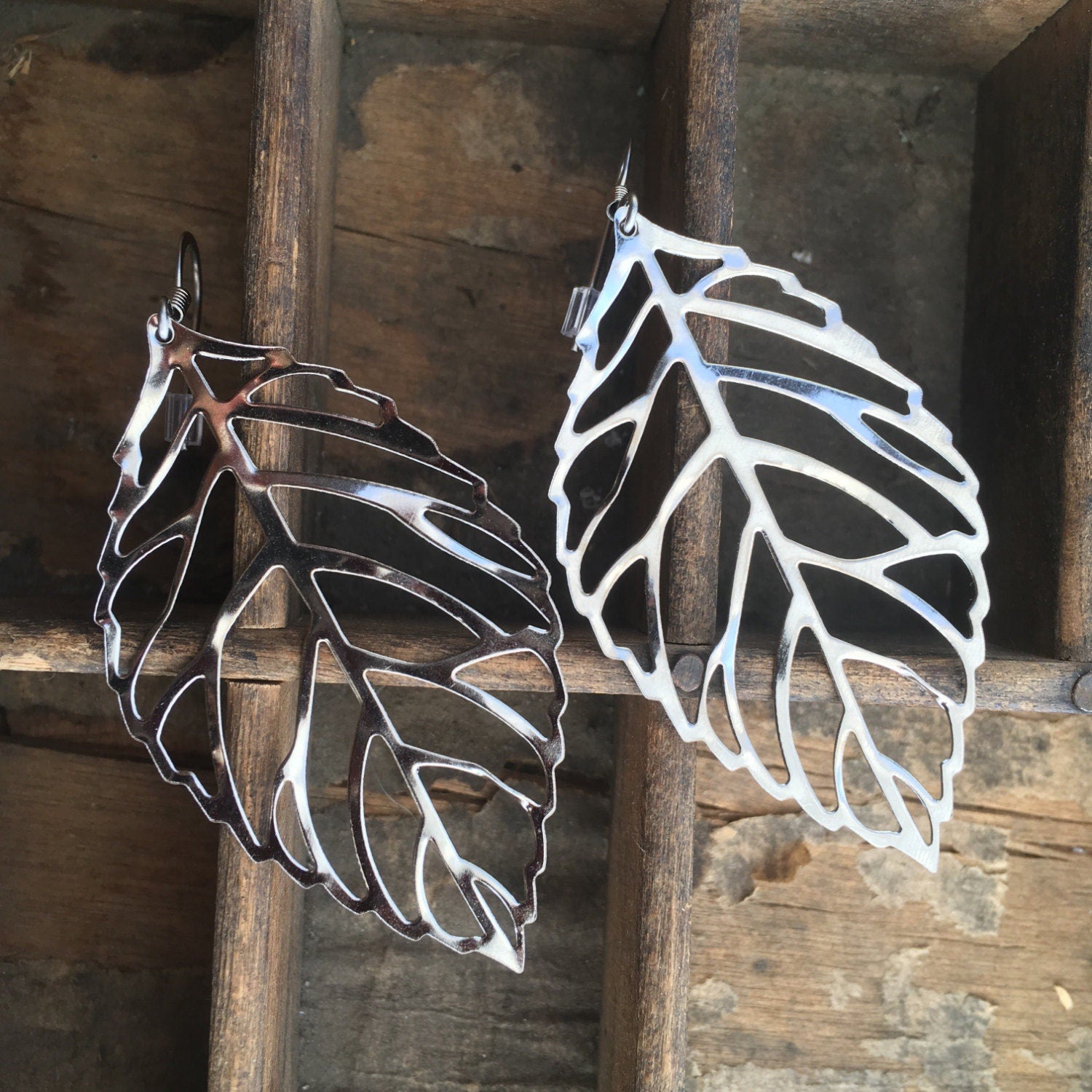 Skeleton leaf earrings in antique bronze or antique silver. Stainless steel silver pair have surgical steel hooks. Antique bronze pair have brass hooks that are lead and nickel free. The surgical steel hooks are the most hypoallergenic. I can put stainless steel hooks on the bronze leaves, just leave a comment requesting this with your order. These are 33mm x 20mm. Thank you!