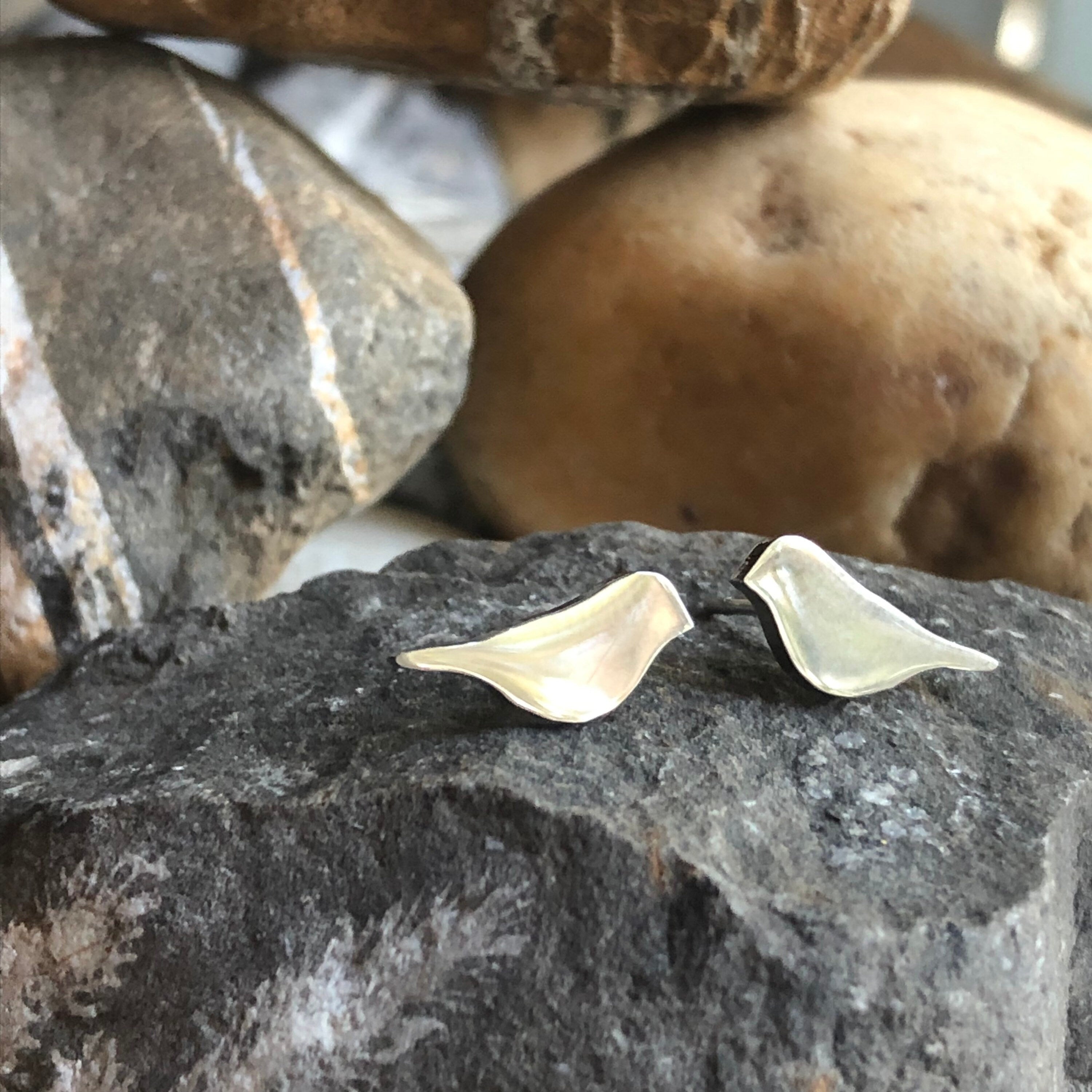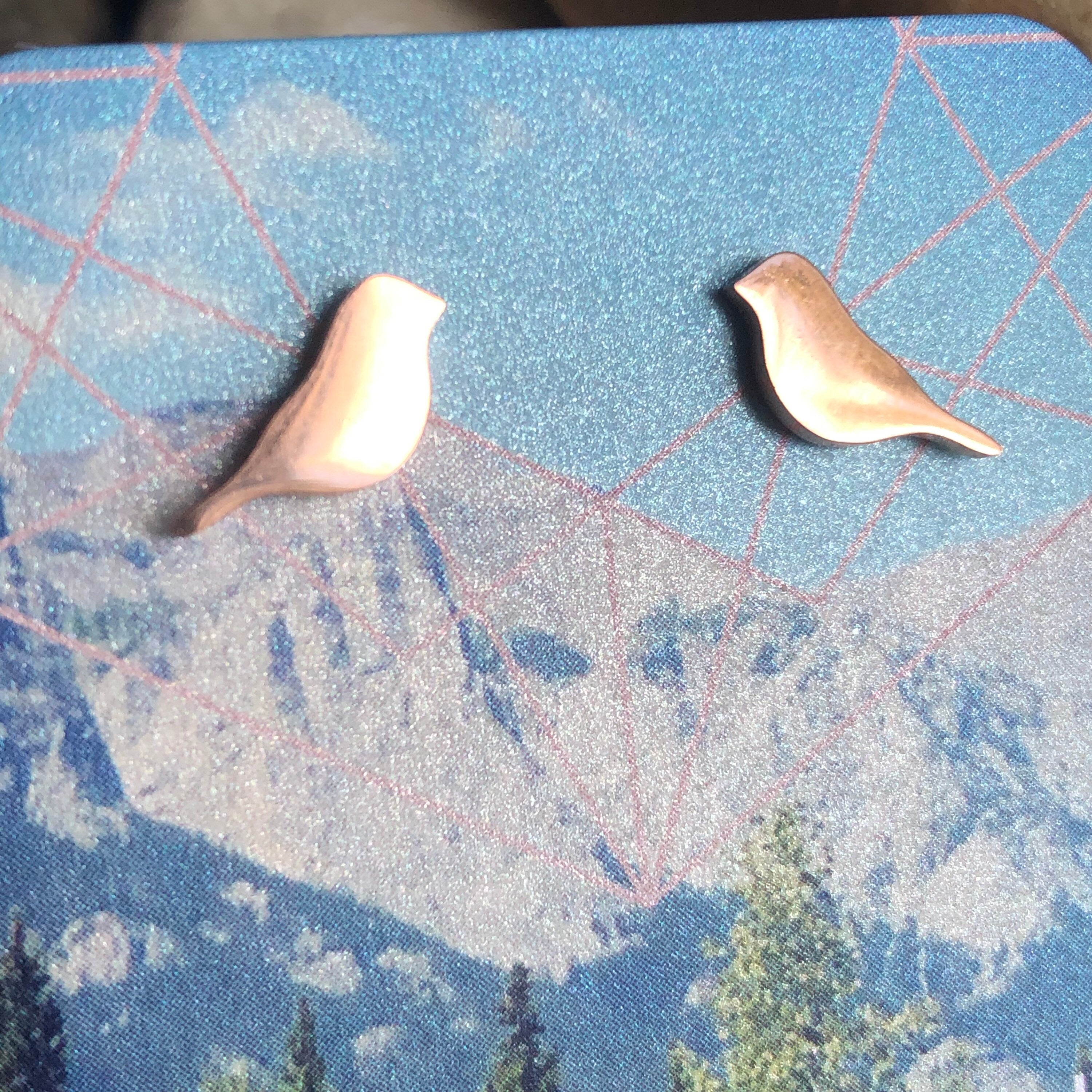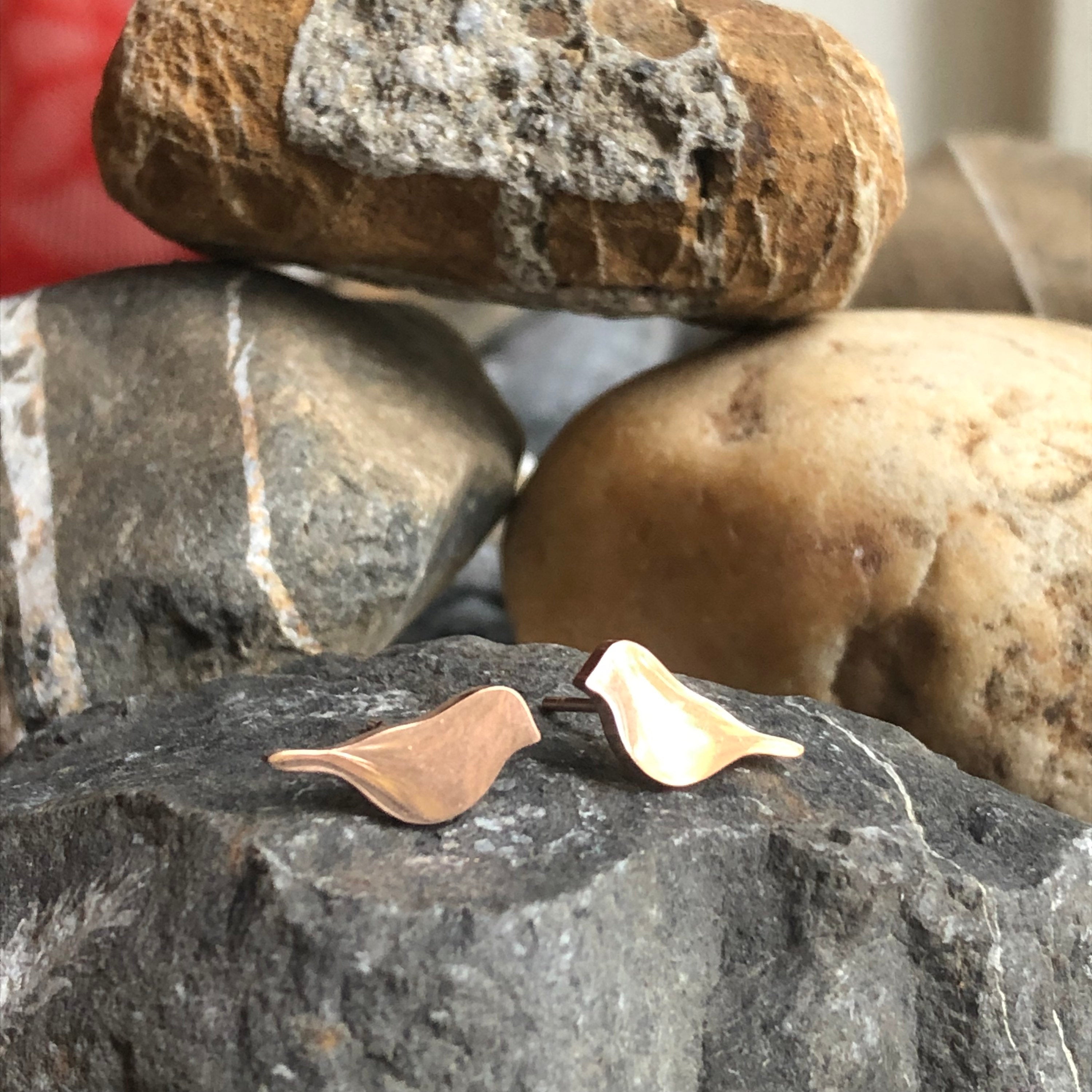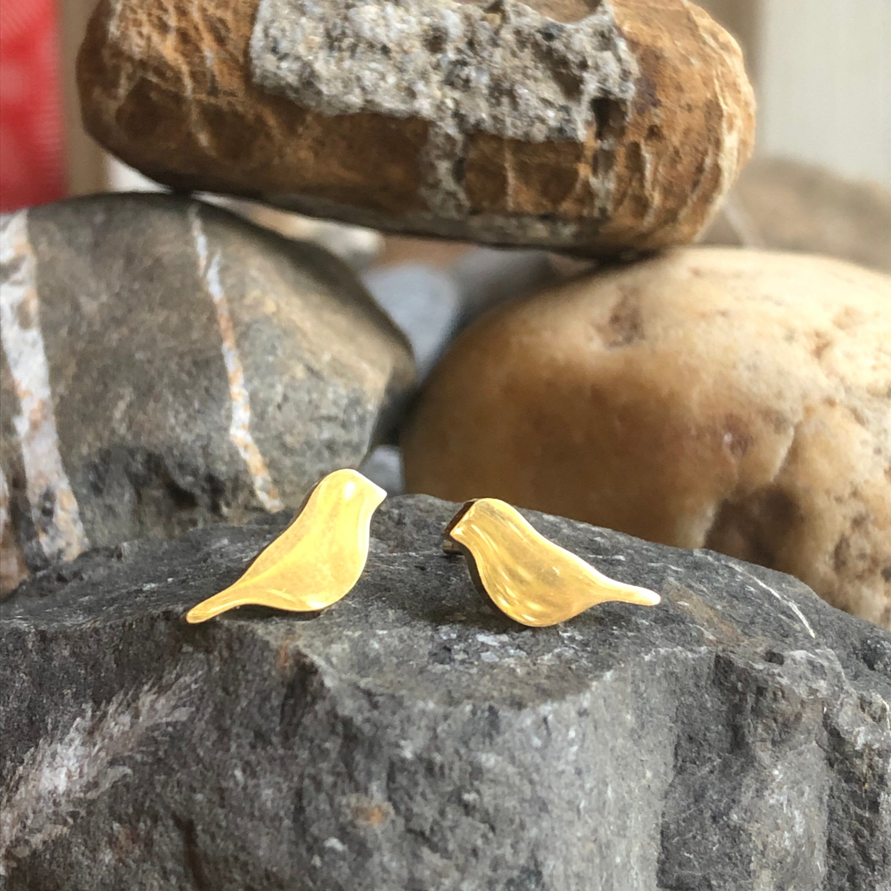 These cute little bird stud earrings are available in gold or silver. The earring, post, and back see all stainless steel. They are a good choice for everyday wear. They are non corrosive and non tarnish. They are also hypoallergenic and can be worn by most people. The birds are 9mm x 7mm.