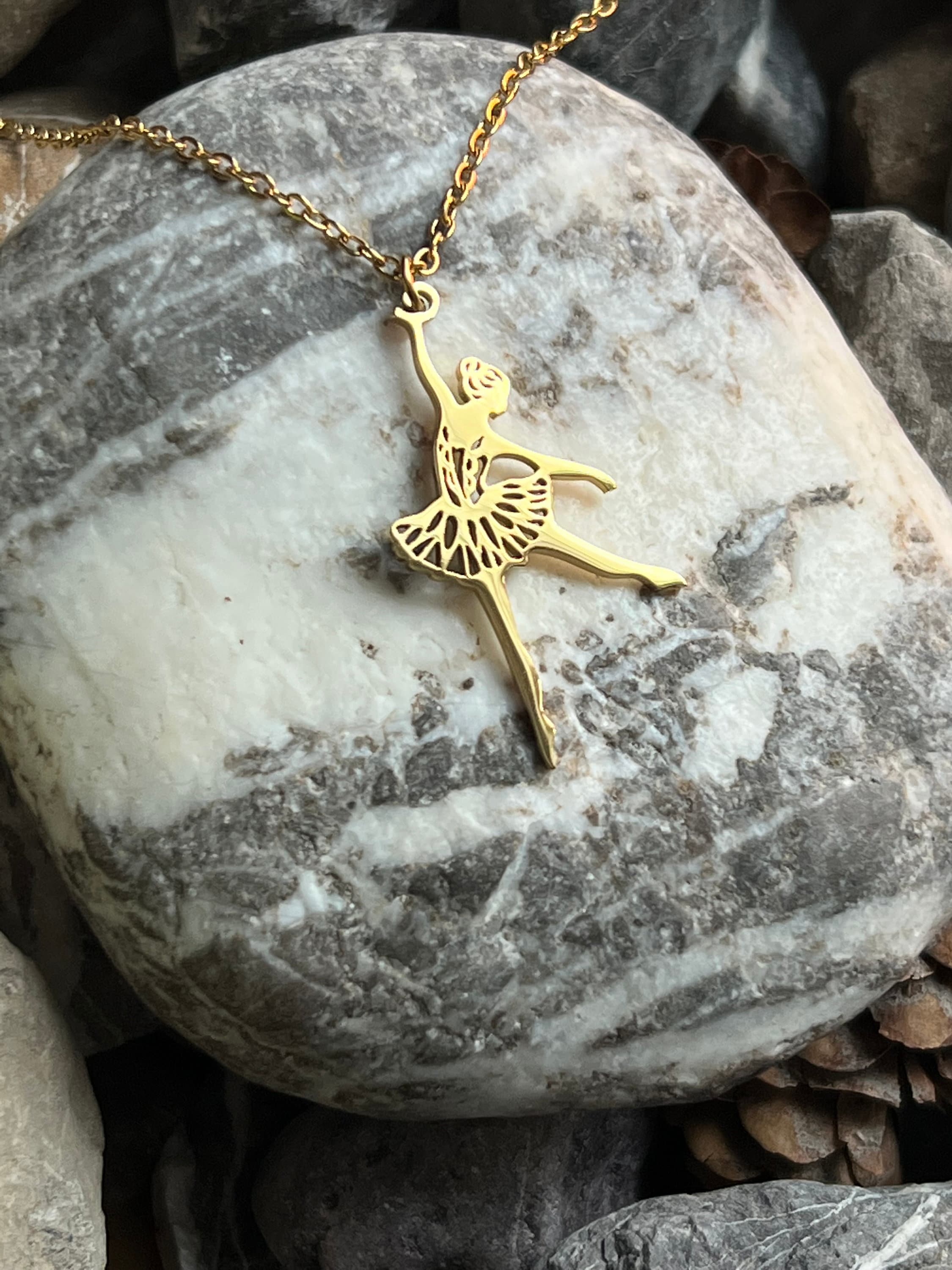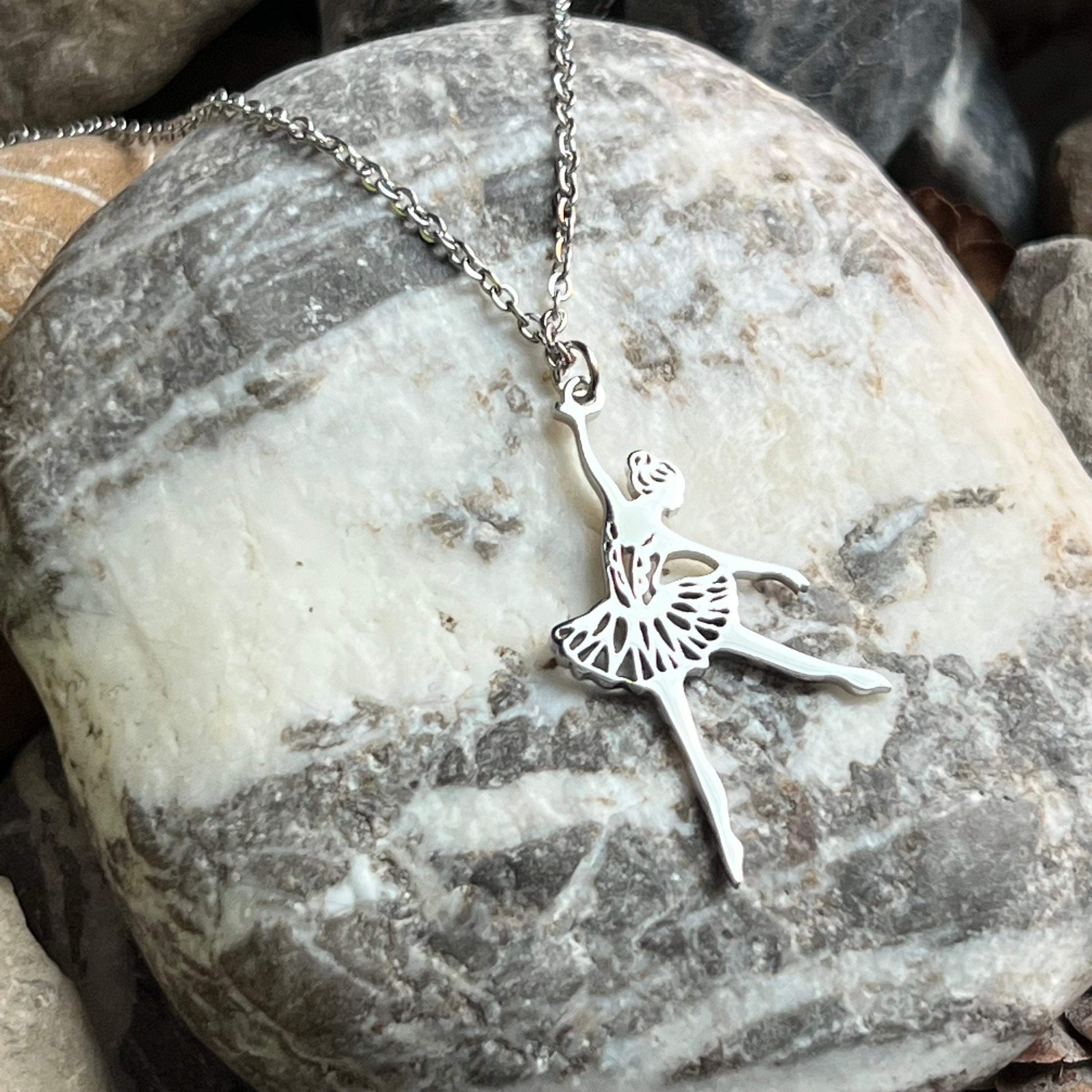 This beauty is ready for any dance lover. This is hypo allergenic and can be worn directly on the skin. It is a good everyday necklace that can go in water and doesn’t tarnish, rust, or corrode.