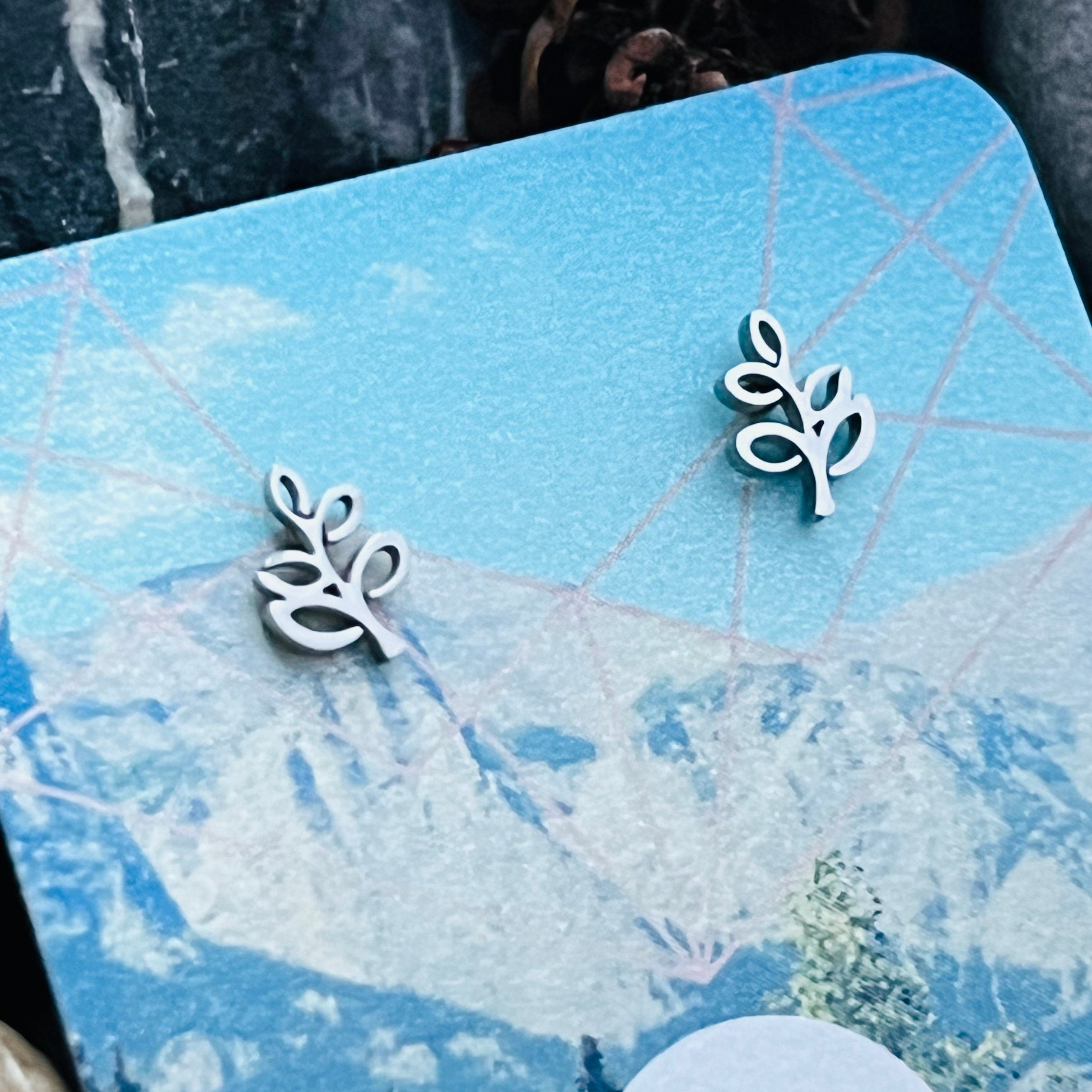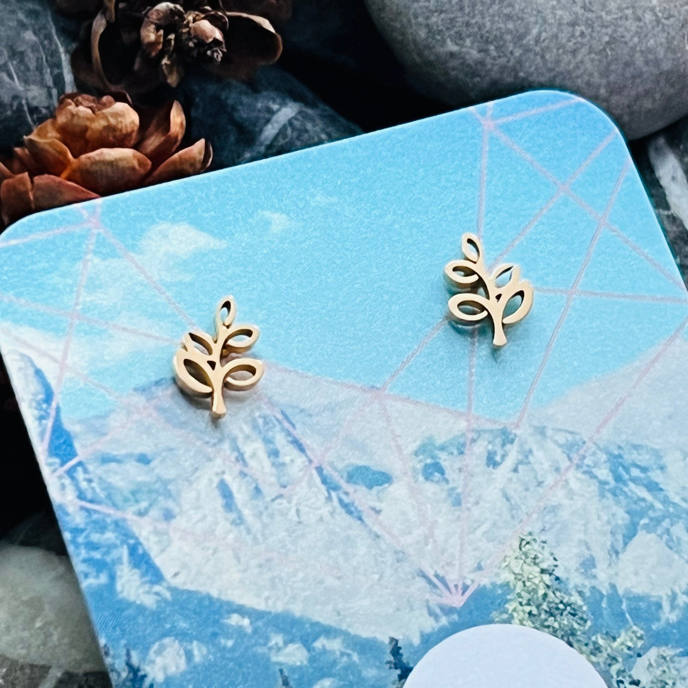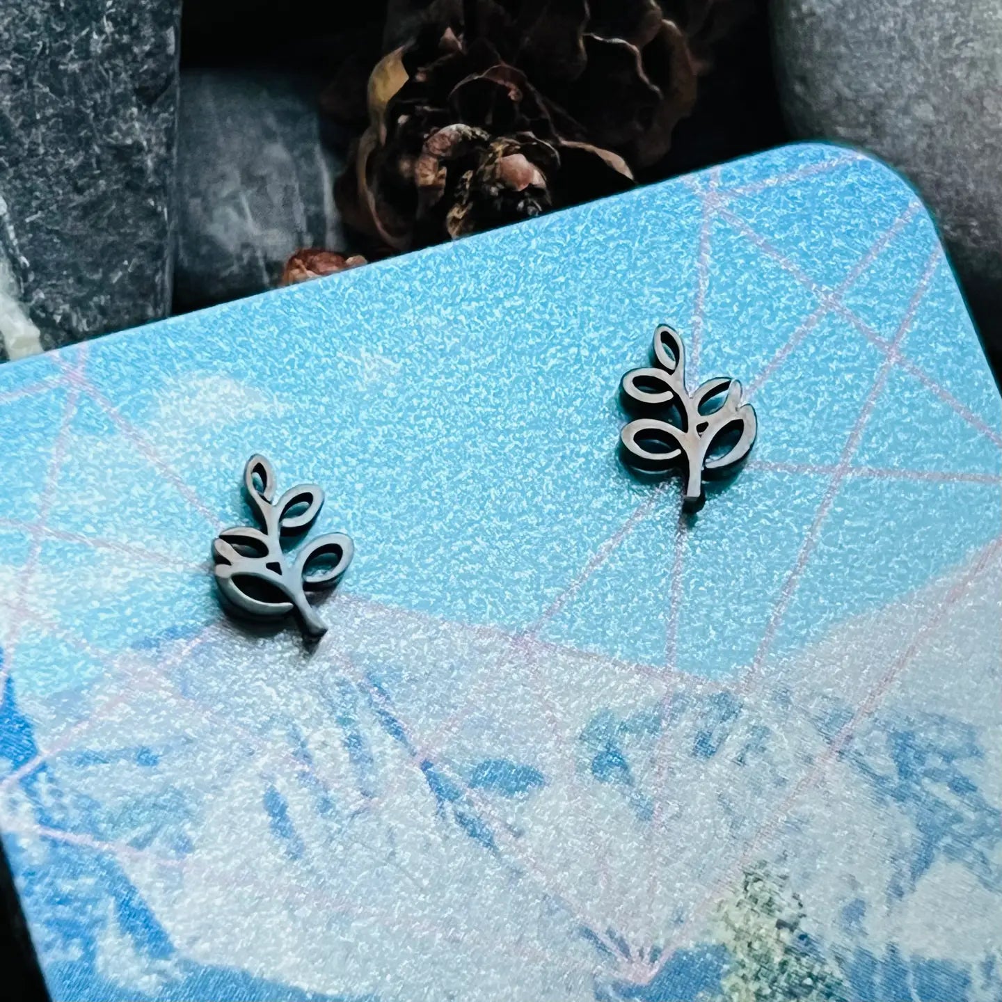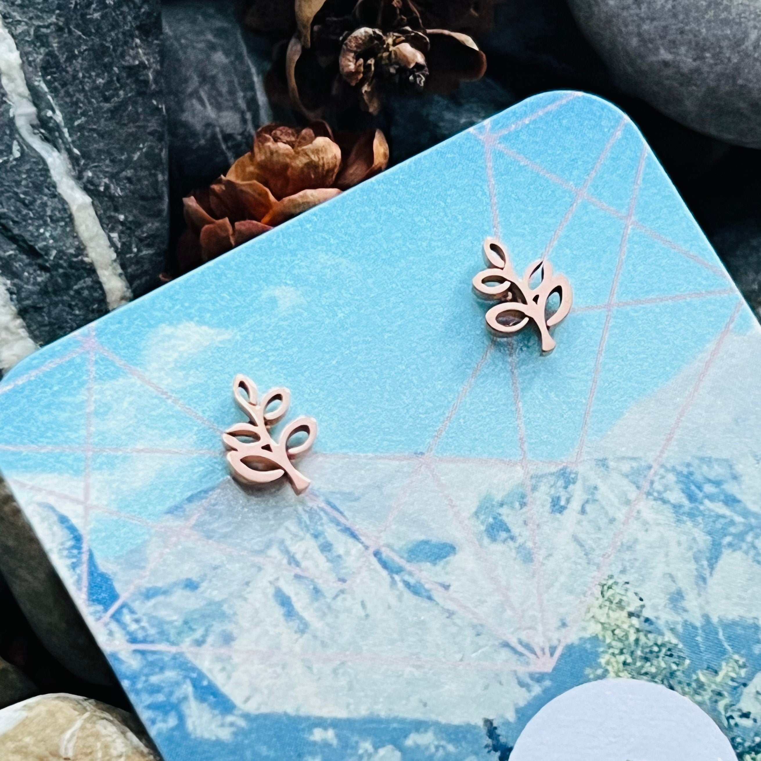 These cute little leaf stud earrings are available in gold, rose gold or silver. The earring, post, and back see all stainless steel. They are a good choice for everyday wear. They are non corrosive and non tarnish. They are also hypoallergenic and can be worn by most people.