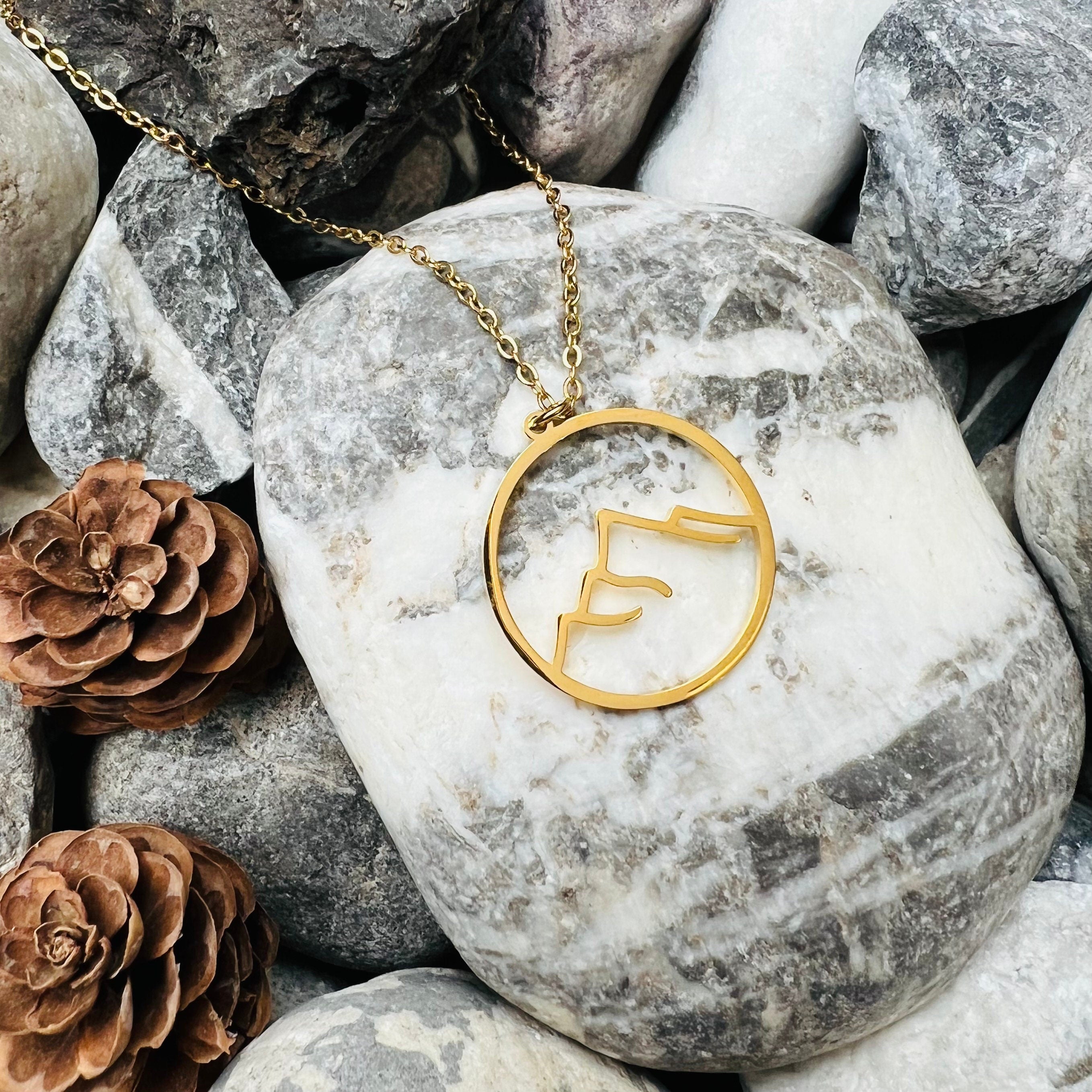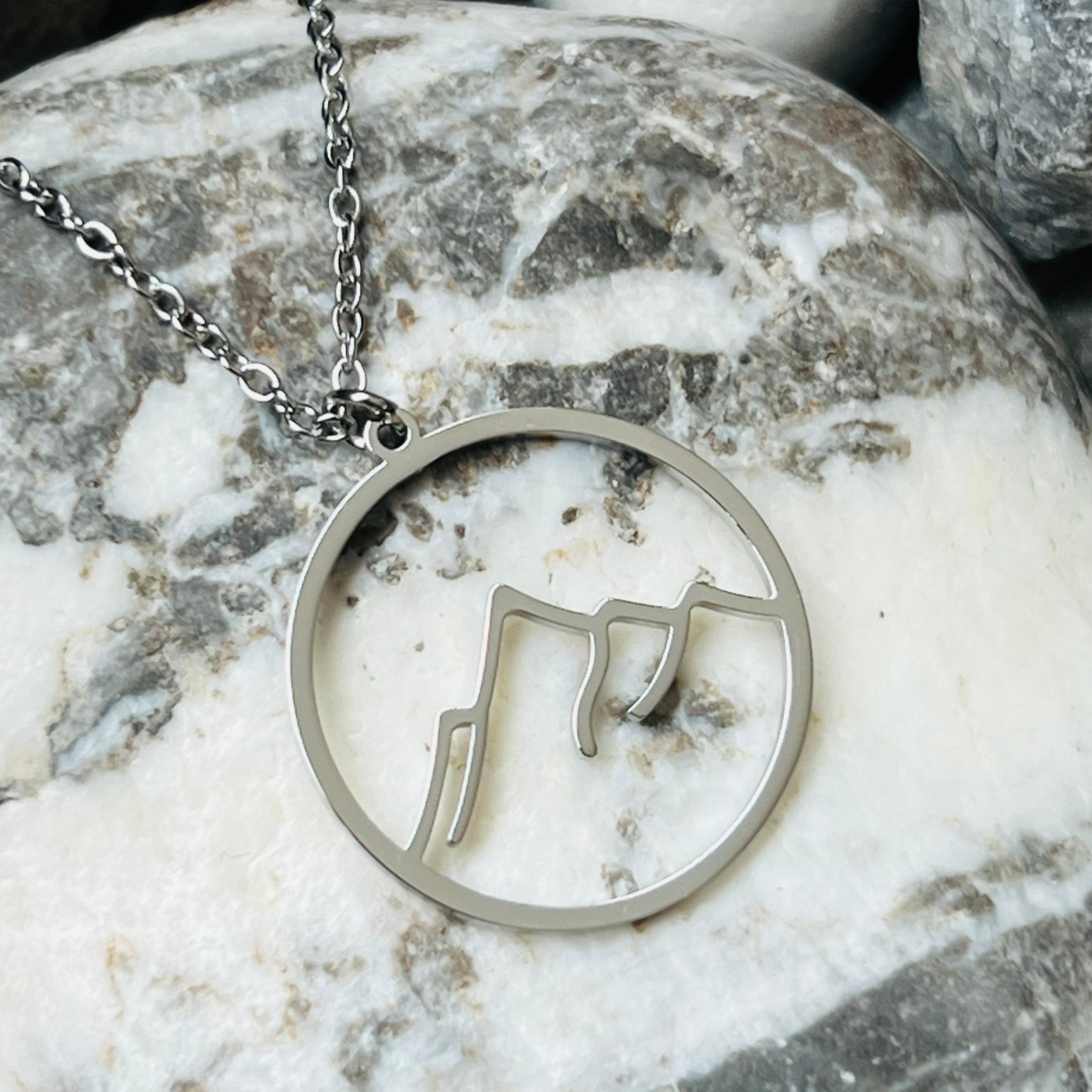 This stainless steel necklace has an 18” chain that falls mid upper chest. All the parts are hypoallergenic and can be worn in the shower, hot tub, or even the ocean and will not corrode or tarnish. The mountains are calling and I must go!