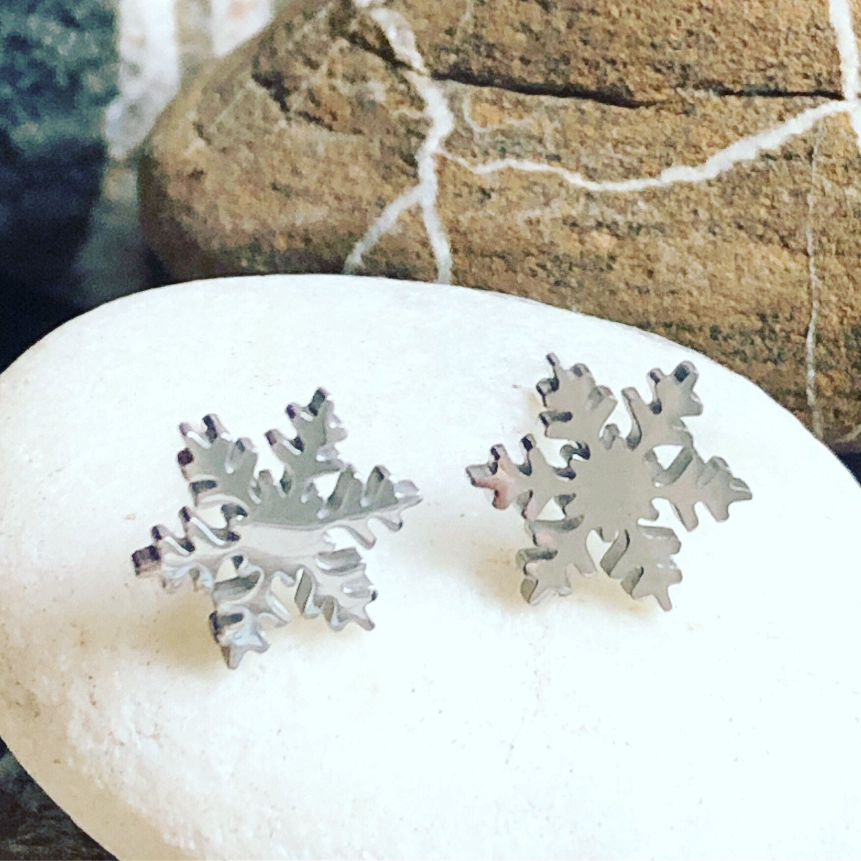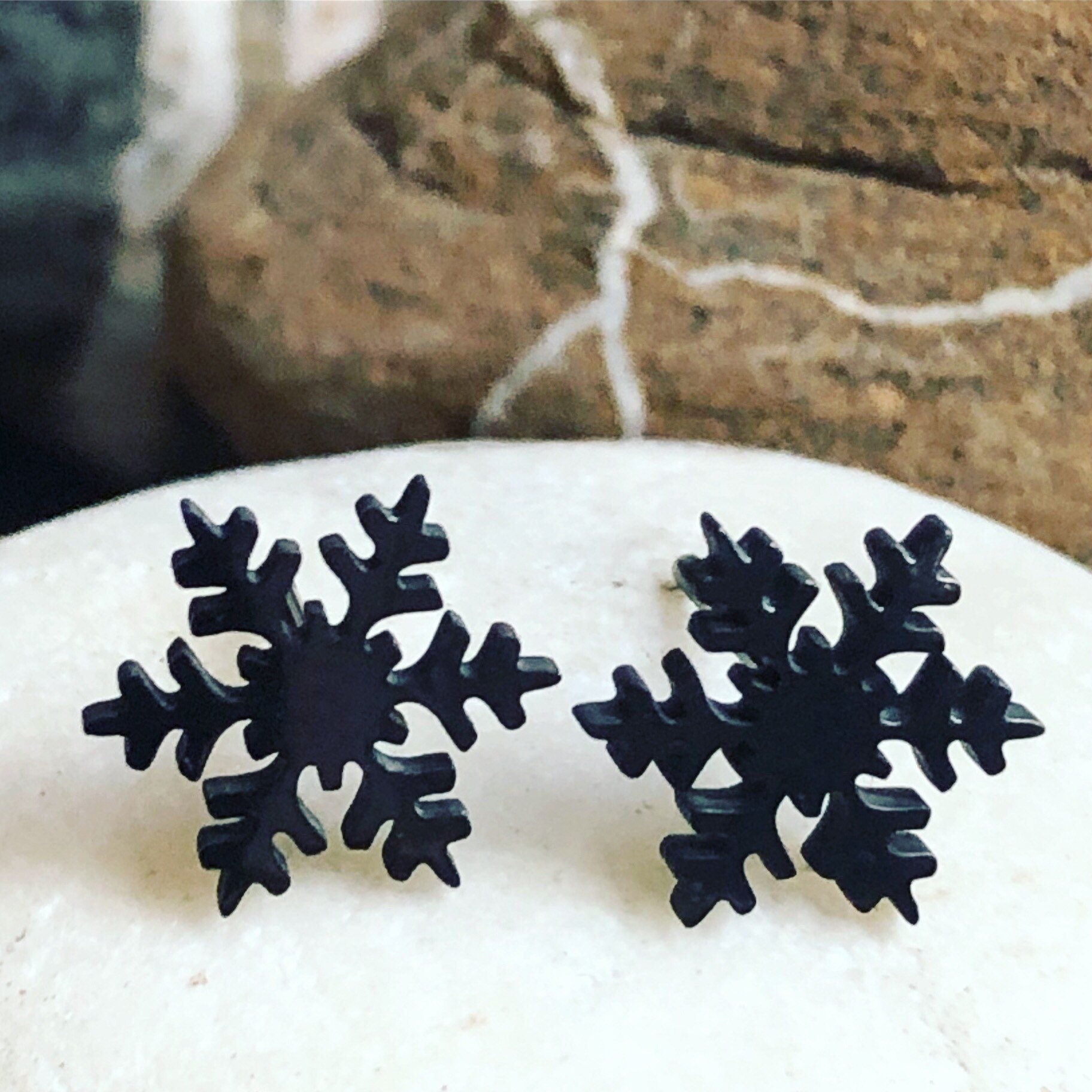 These cute snowflake stud earrings are available in rose gold, gold, black or silver. The earring, post, and back see all stainless steel. They are a good choice for everyday wear. They are non corrosive and non tarnish. They are also hypoallergenic and can be worn by most people.