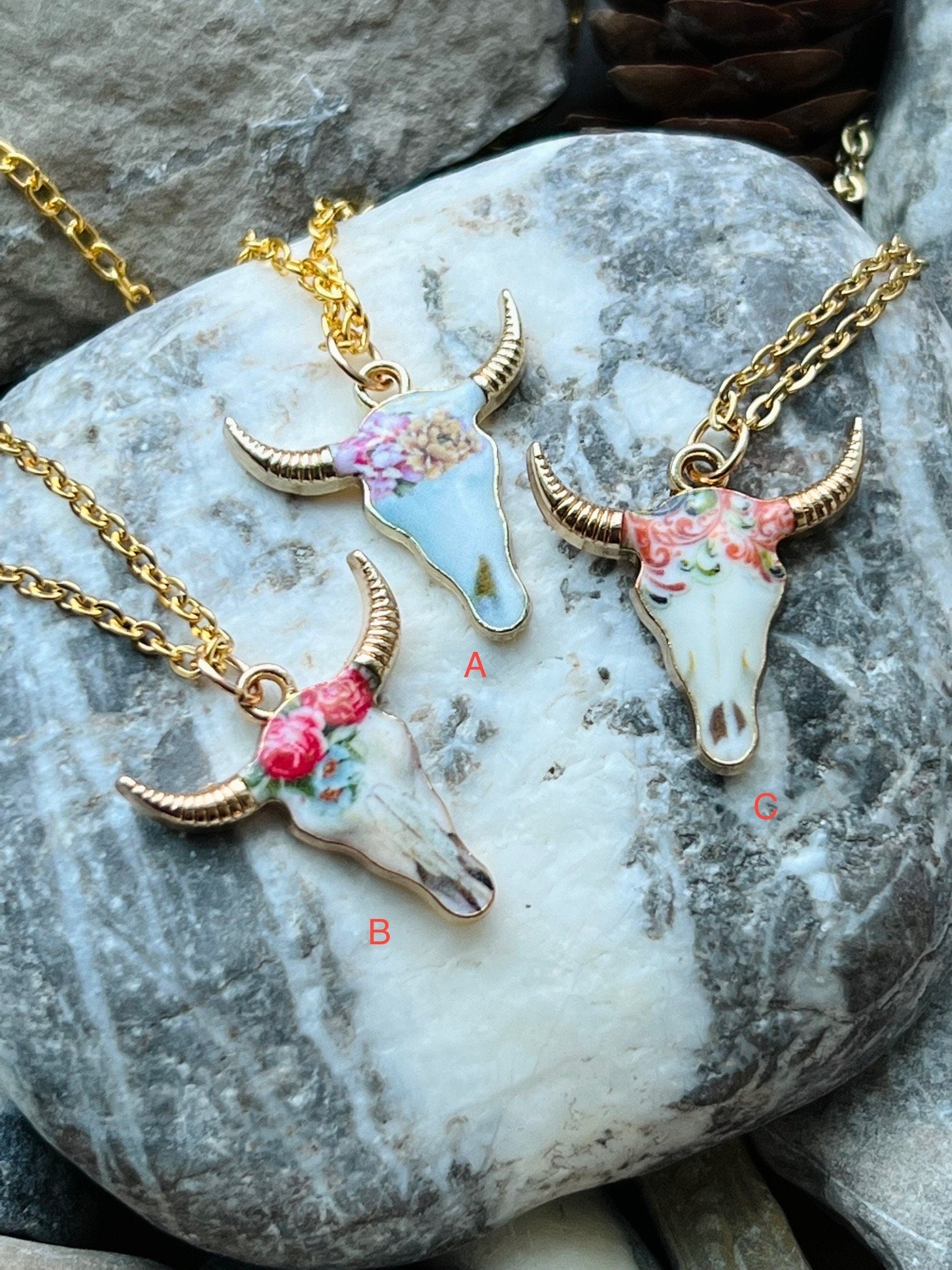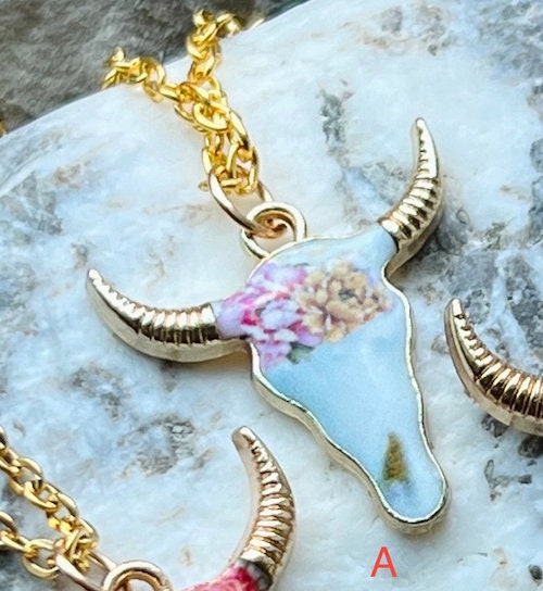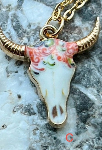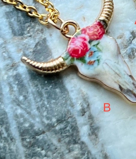 These beautiful cow skull pendants are on a 18" stainless steel gold chain. They are also hypoallergenic and can be worn by most people. The skulls are 2 cm x 2 cm. (.75” x .75”)