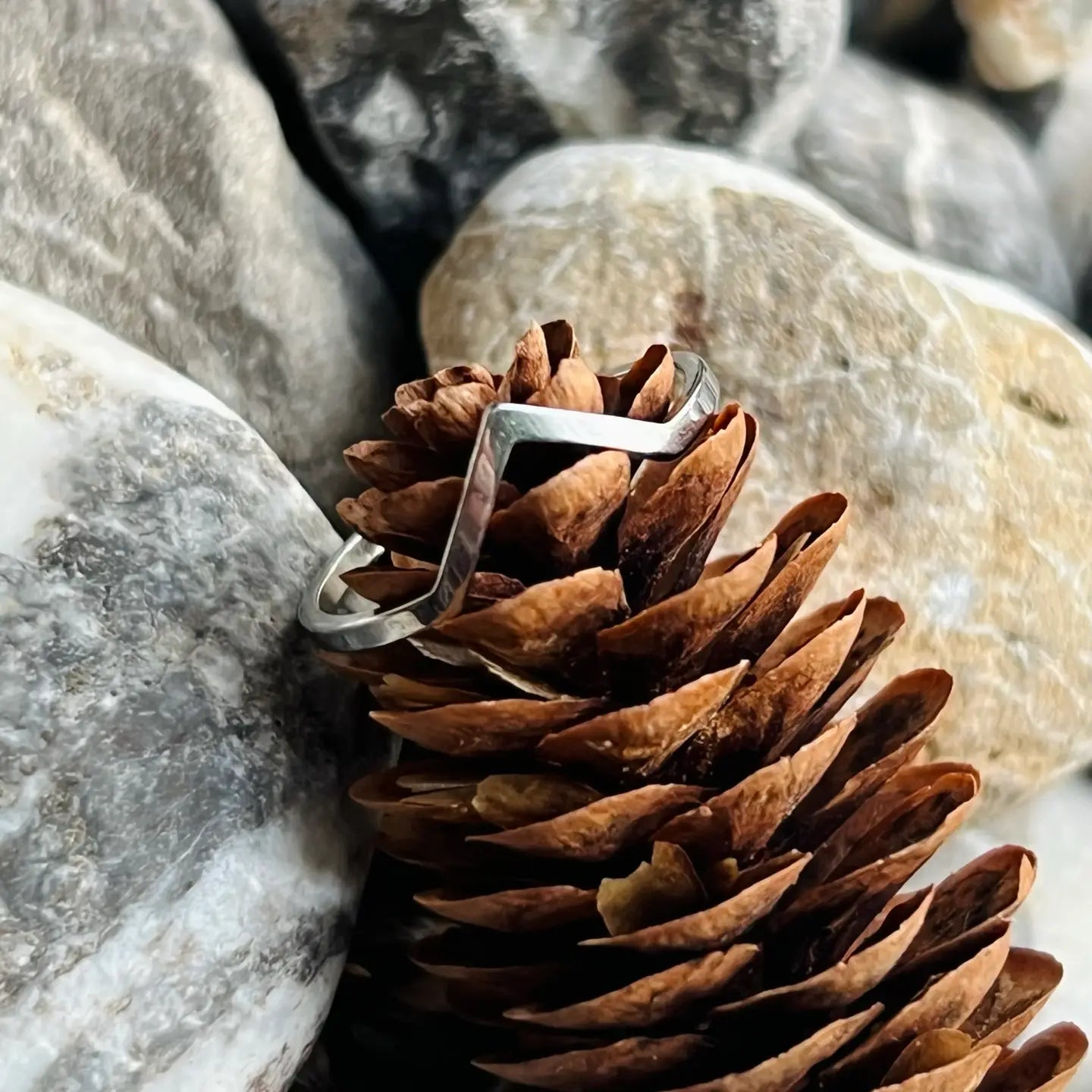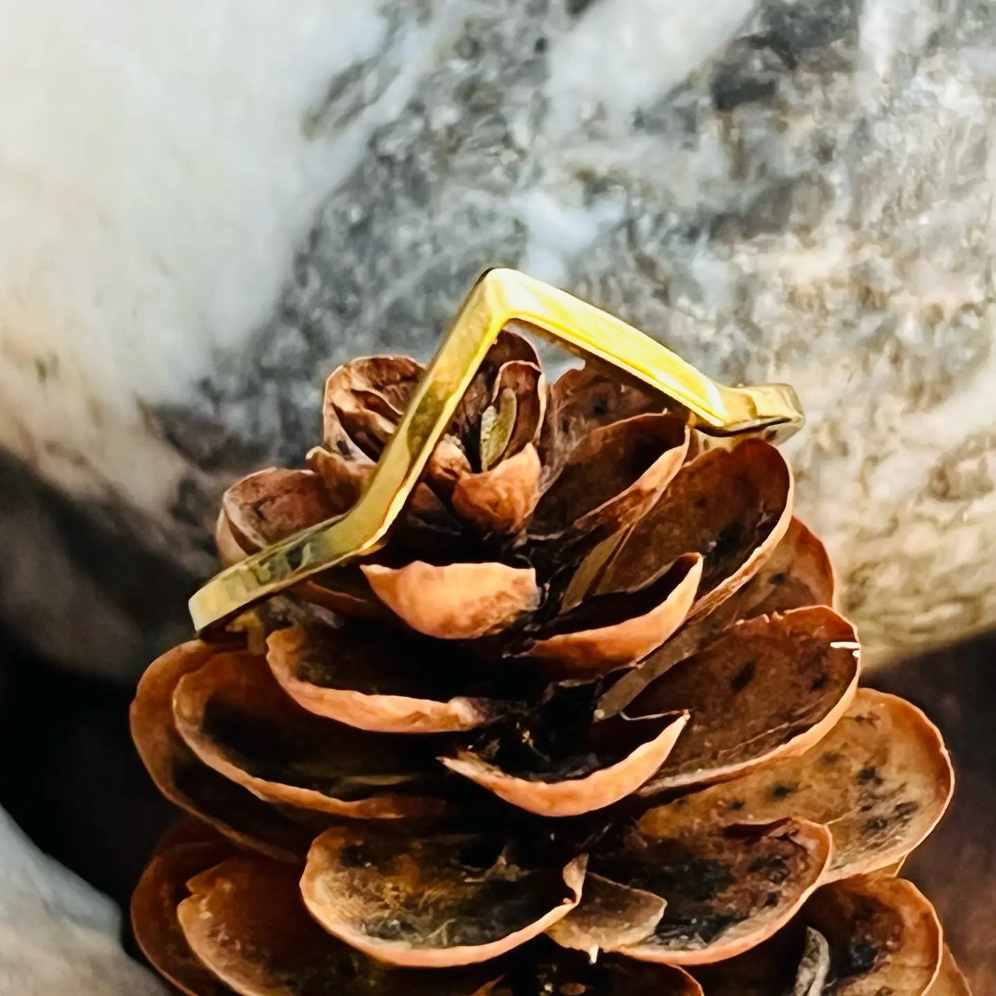 This simple stainless steel mountain band is anodized with silver or gold. It is available in sizes 6-10. It is durable yet delicate. Remove if you use hand sanitizer regularly.