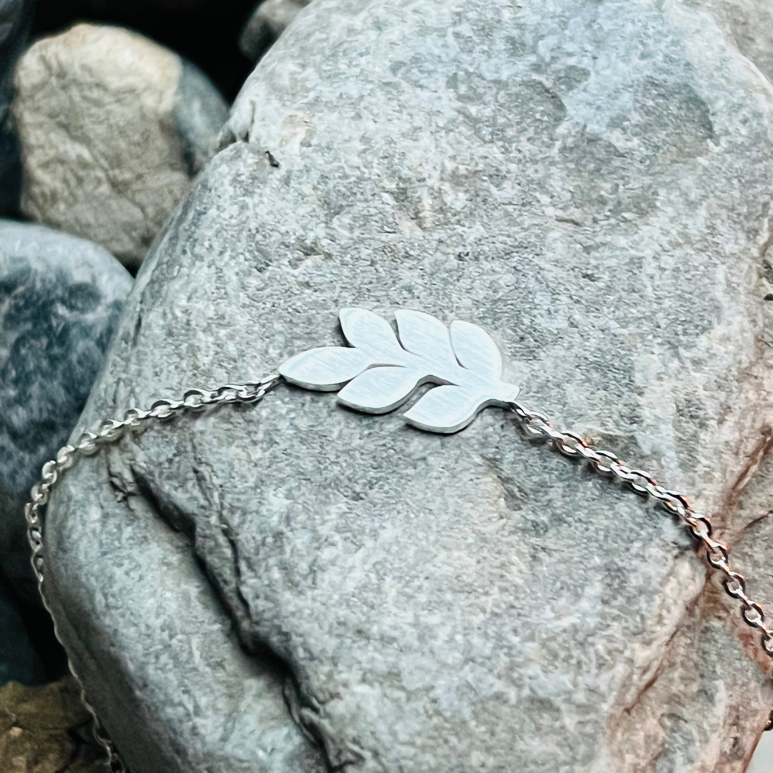 This stainless steel leaf bracelet is 16mmx18mm with an adjustable stainless steel chain.