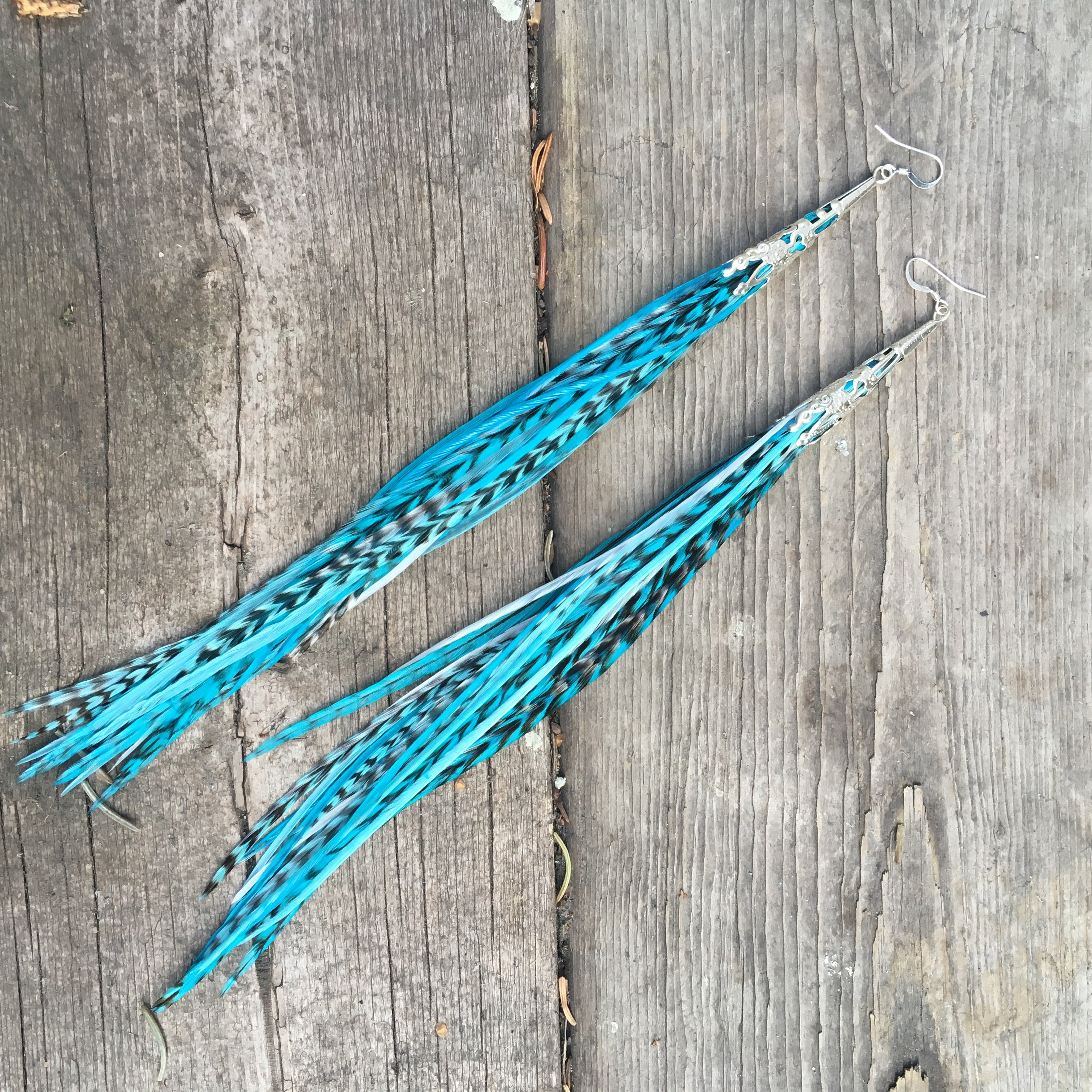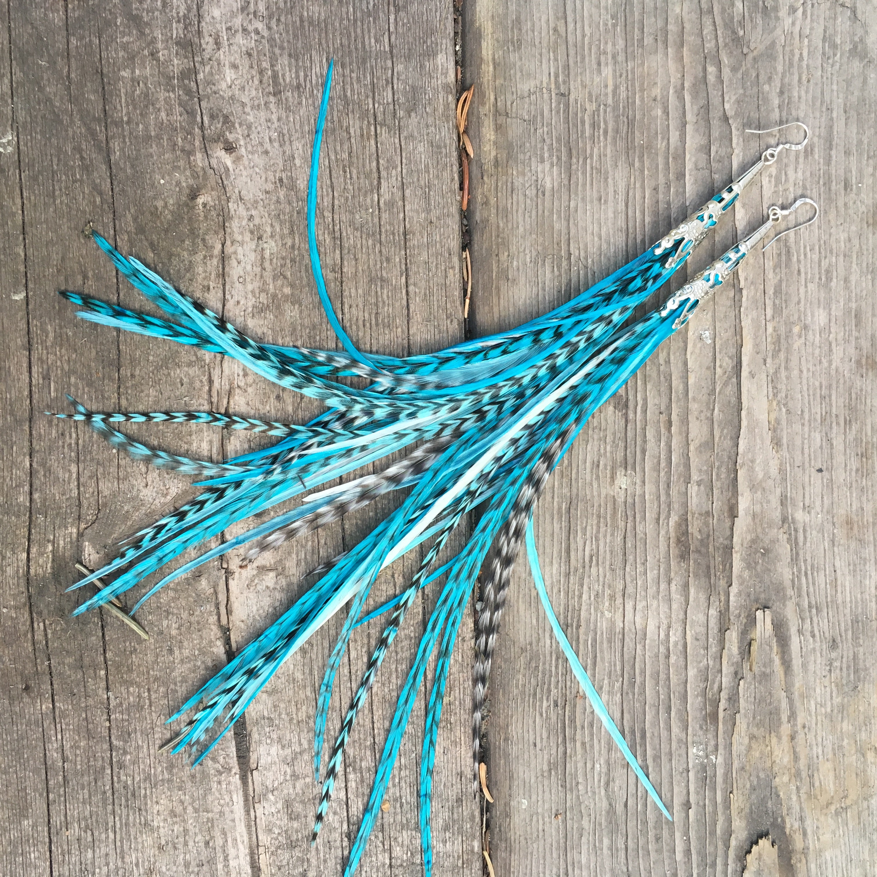 All feather earrings in this style have 40 hand dyed feathers in the pair with locking stainless steel hooks and are 9"-10" in length. You'll also receive two hair clip attachments so you can change it up and wear them in your hair!