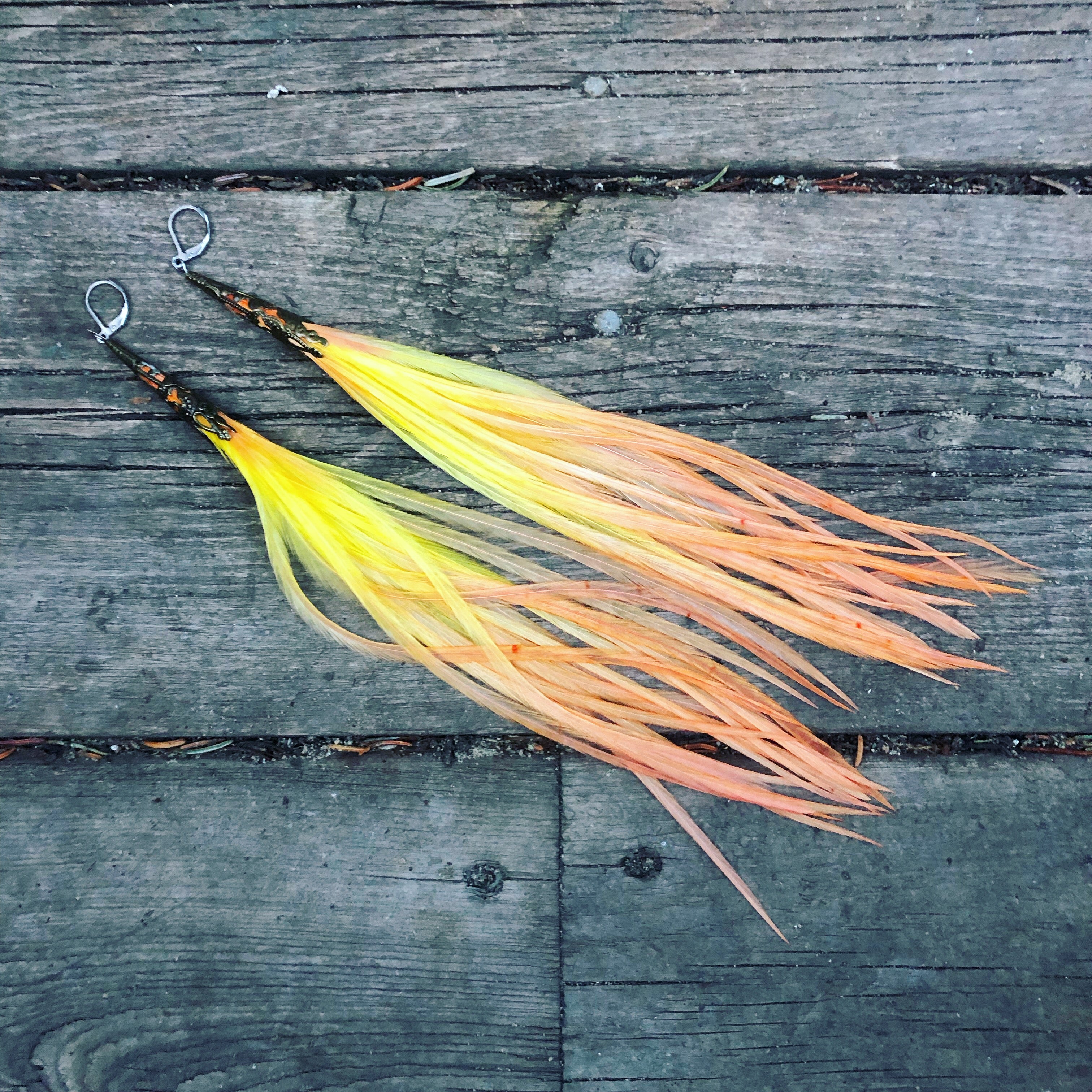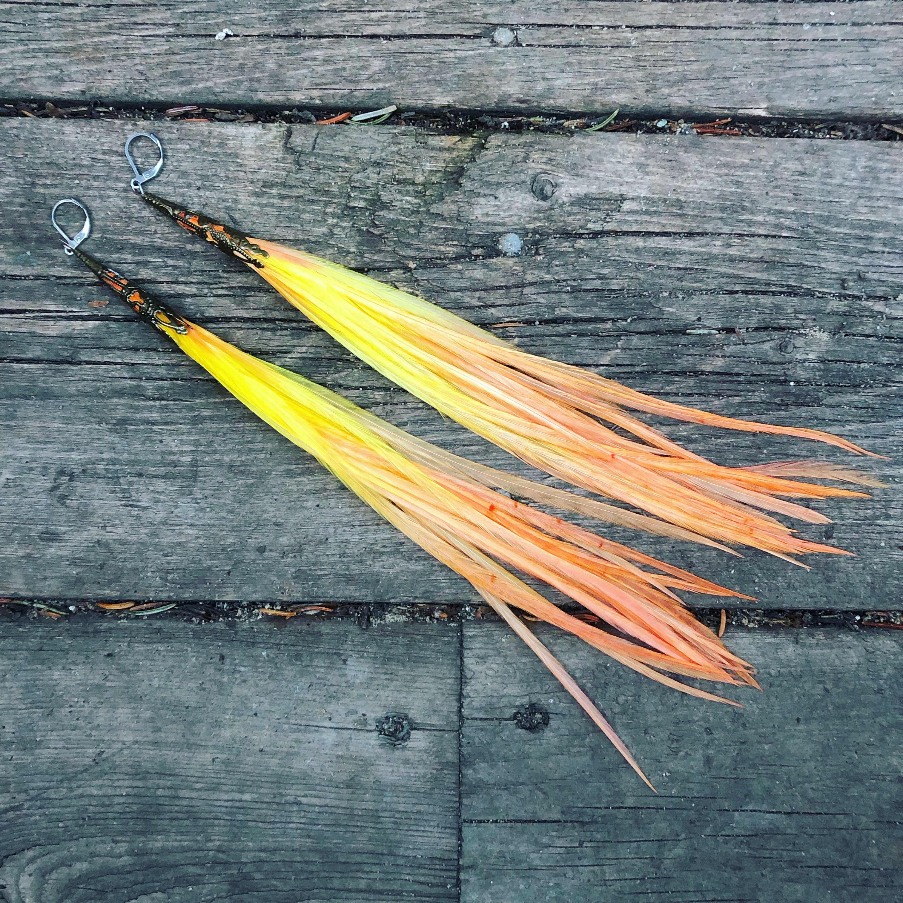 All feather earrings in this style have 40 hand dyed feathers in the pair with locking stainless steel hooks and are 9"-10" in length. You'll also receive two hair clip attachments so you can change it up and wear them in your hair!