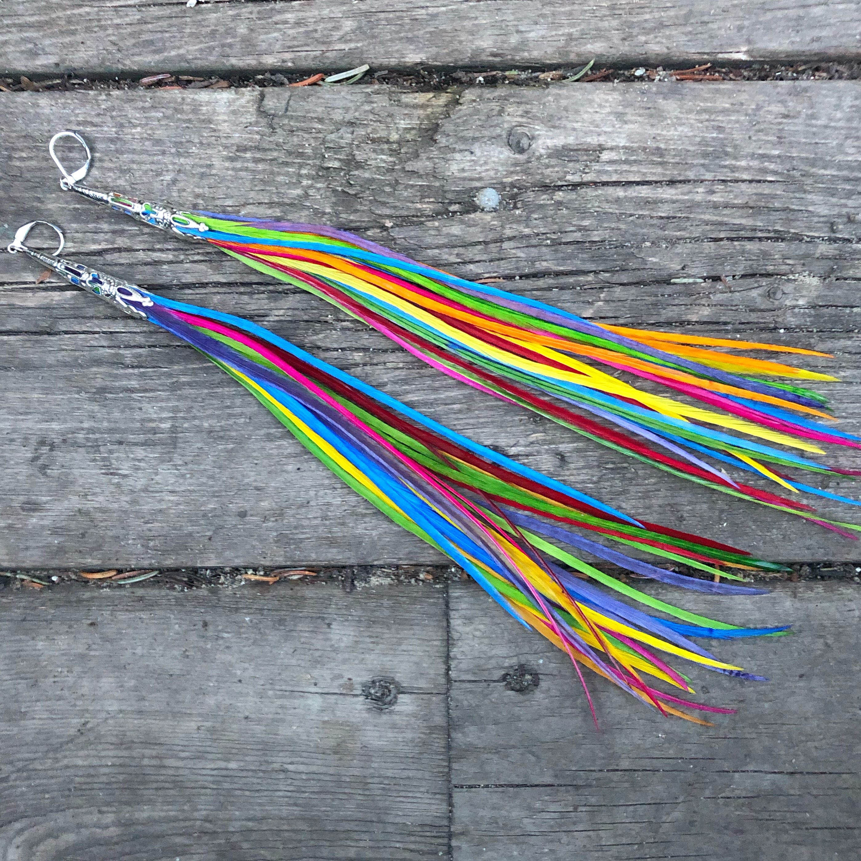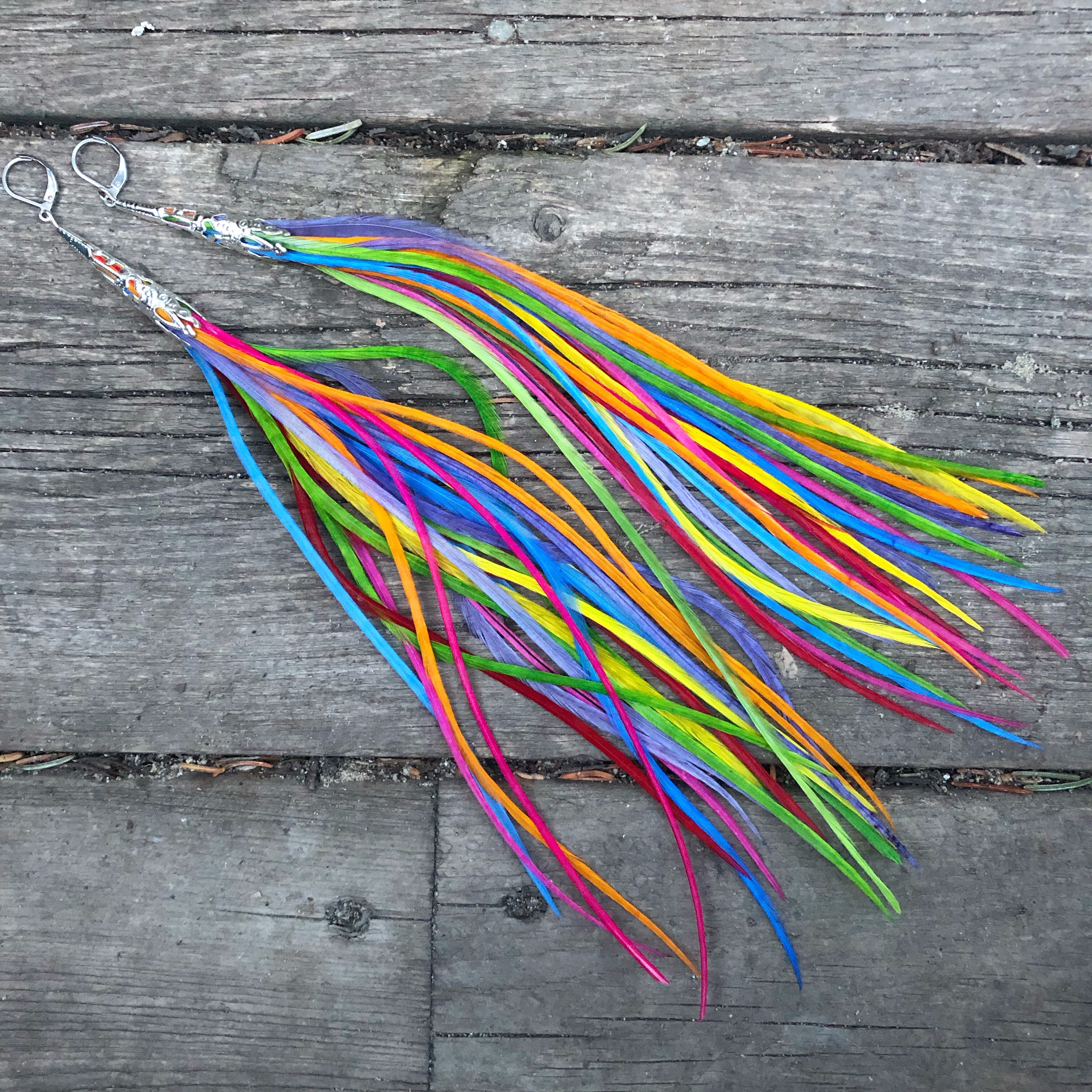 All feather earrings in this style have 40 hand dyed feathers in the pair with locking stainless steel hooks and are 9"-10" in length. You'll also receive two hair clip attachments so you can change it up and wear them in your hair!
