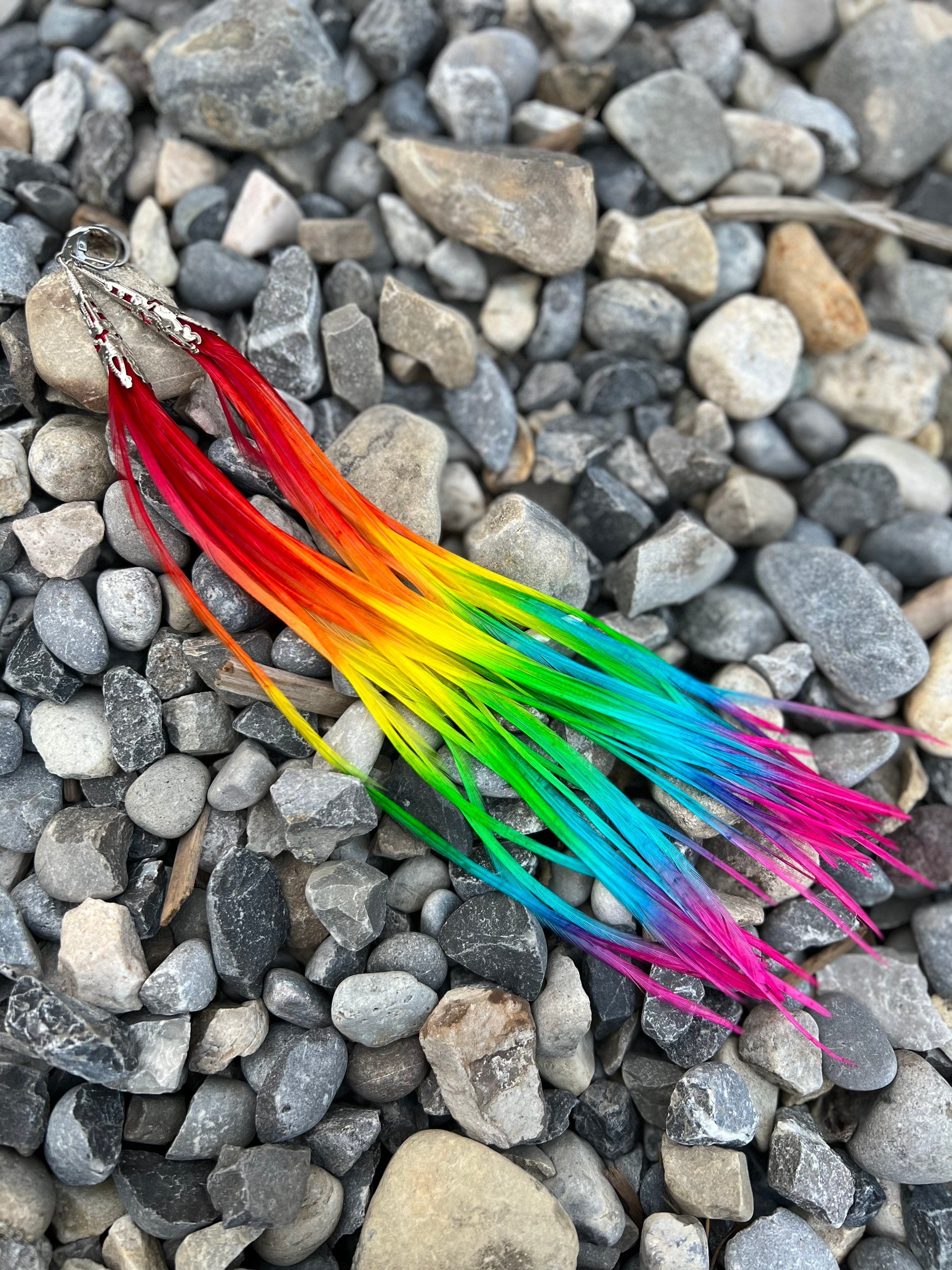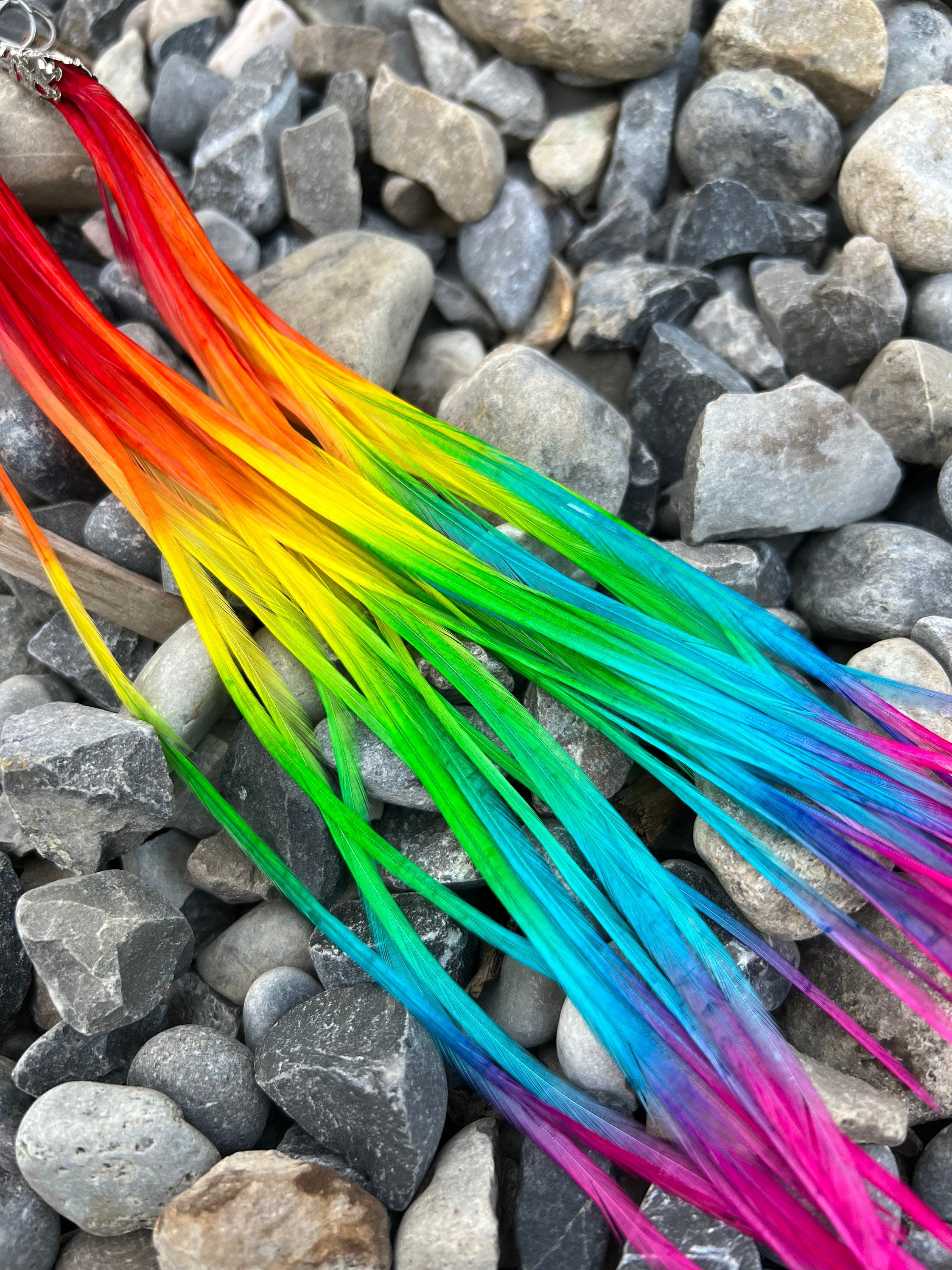 These colourful rainbow ombré long handmade feather earrings are approximately 9-10”long. They have 40 natural dyed feathers in the pair. They have silver cones and non allergenic stainless steel locking hooks. They also come with hair extensions clips so you can wear them in your hair. One of a kind. Tracked shipping