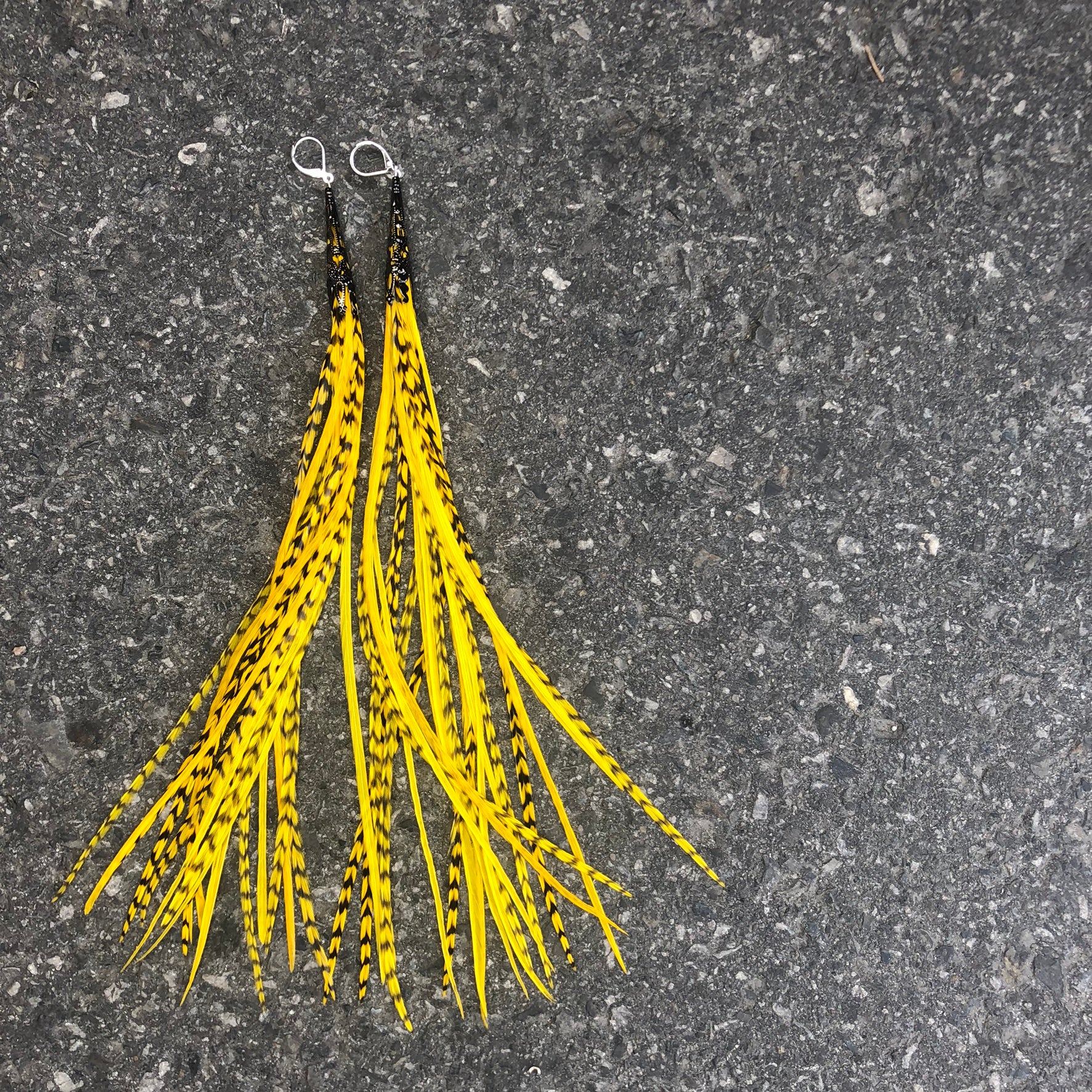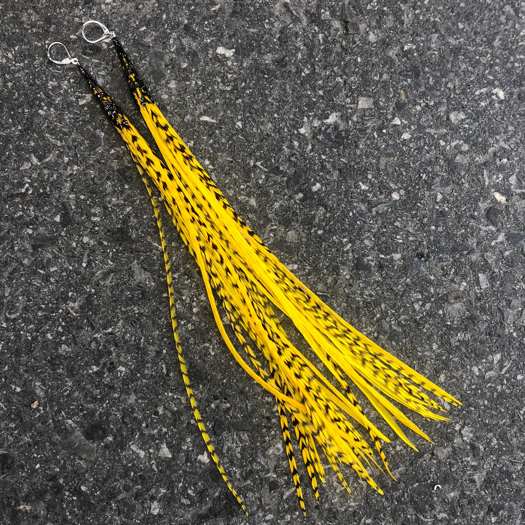 All feather earrings in this style have 40 hand dyed feathers in the pair with locking stainless steel hooks and are 9"-10" in length. You'll also receive two hair clip attachments so you can change it up and wear them in your hair!