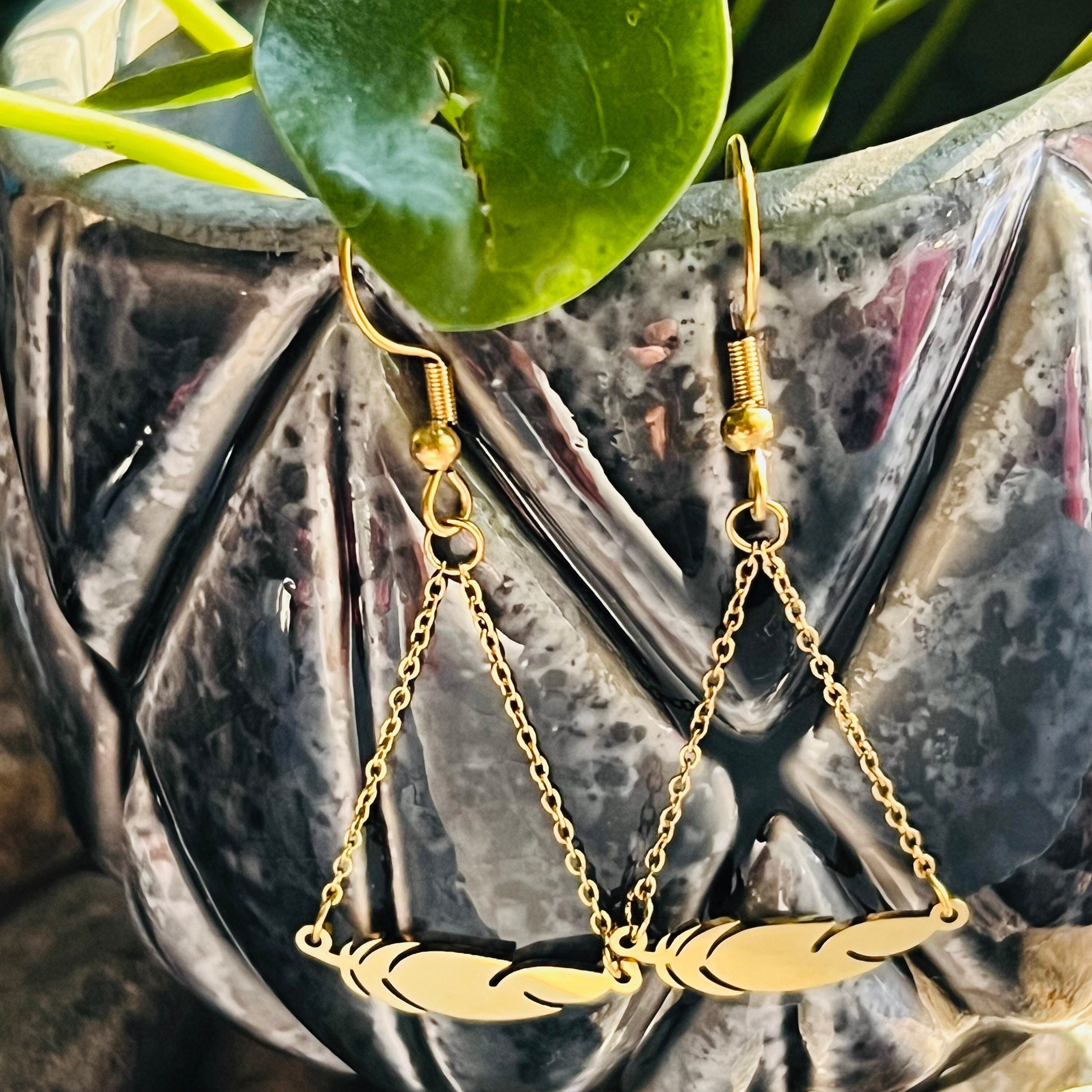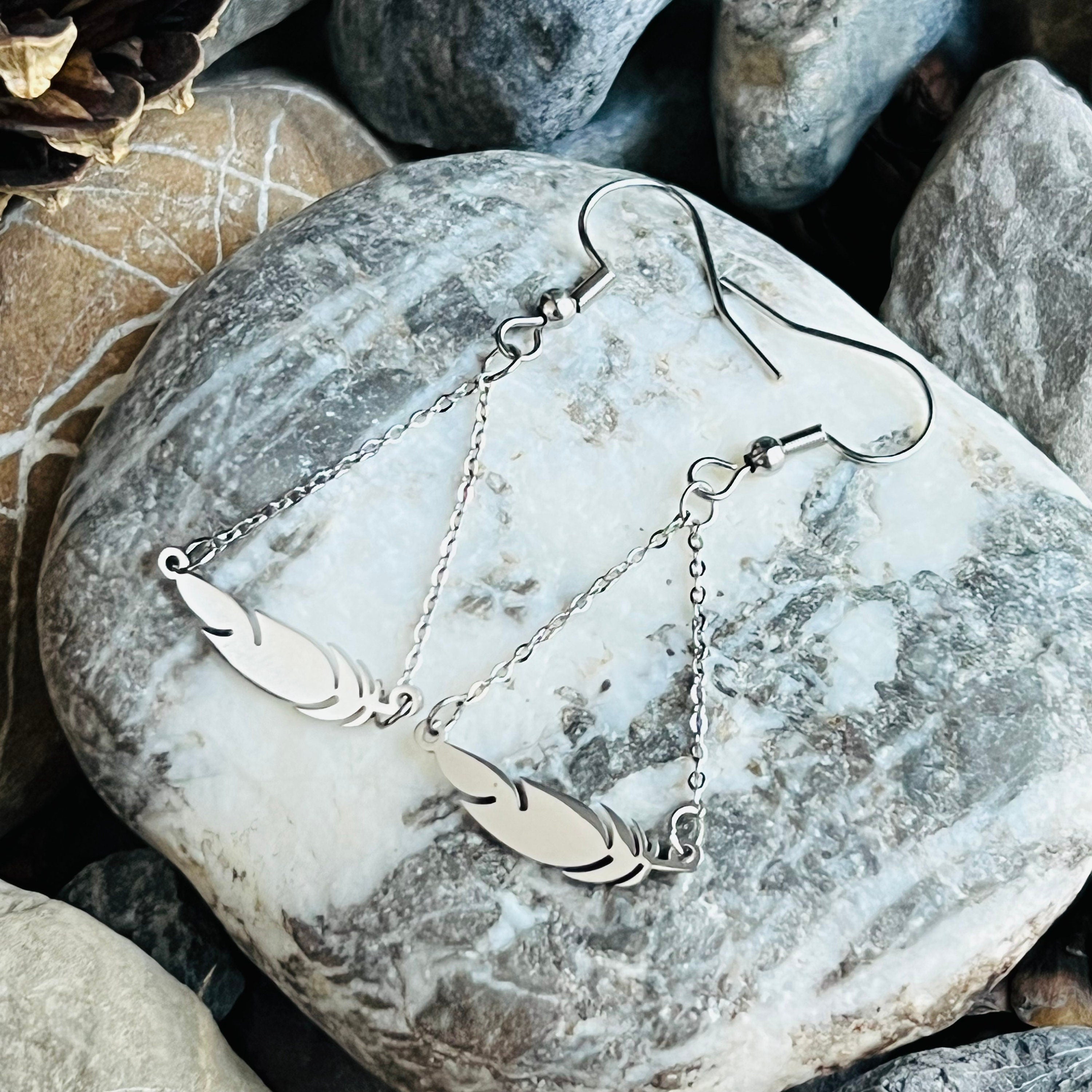 These amazing dangle feather earrings are available in gold or silver. The earring and hook are stainless steel. They are a good choice for everyday wear. They are non corrosive and non tarnish. They are also hypoallergenic and can be worn by most people. The earrings are 2' long and 3/4" across. This beautiful feather is a lovely gift for yourself or another anytime.
