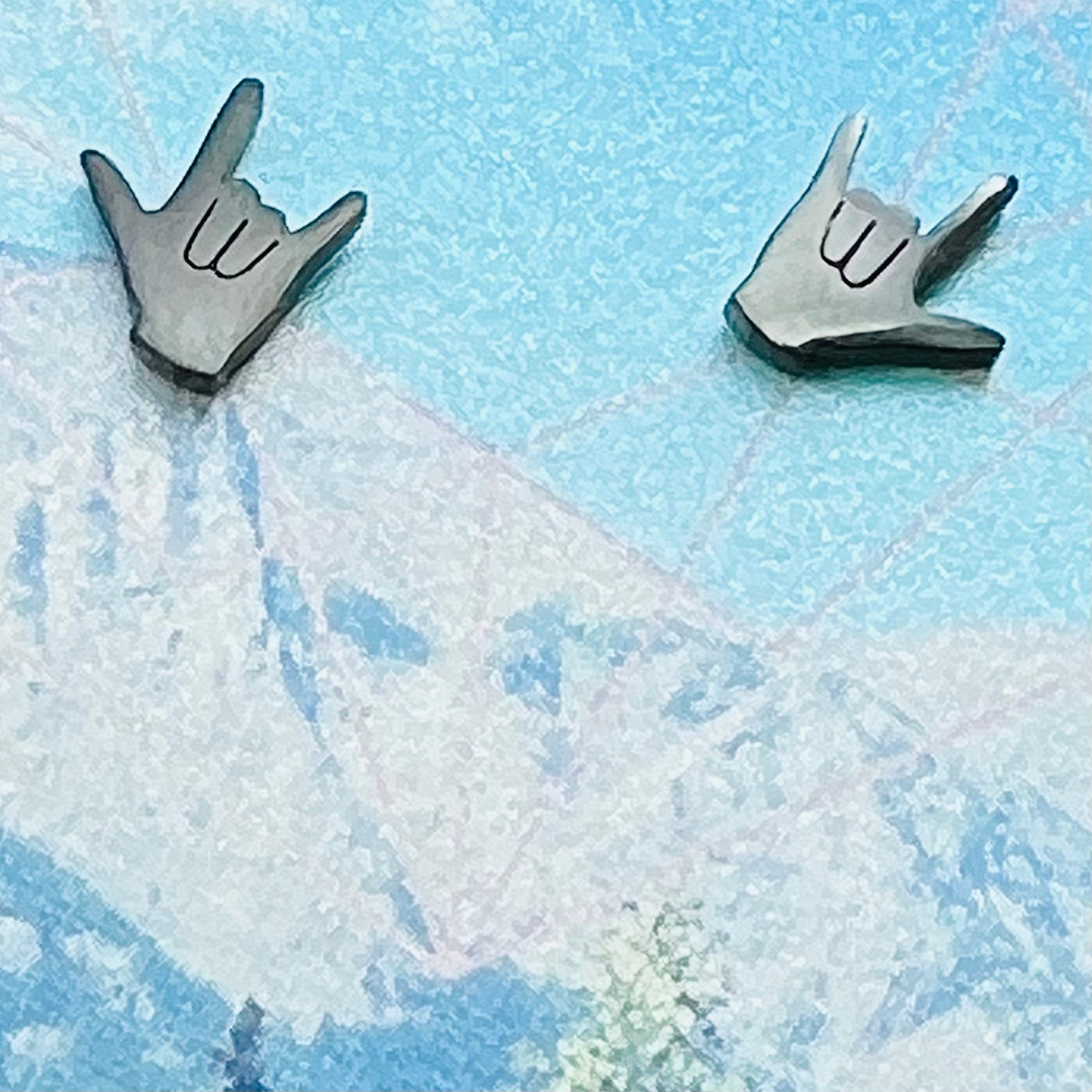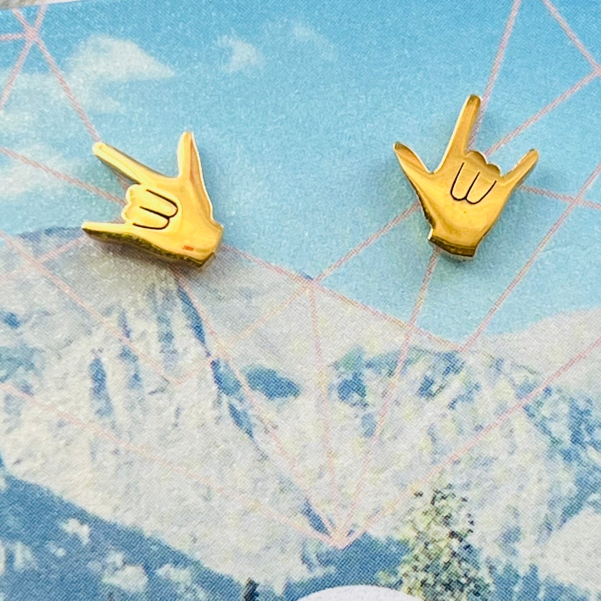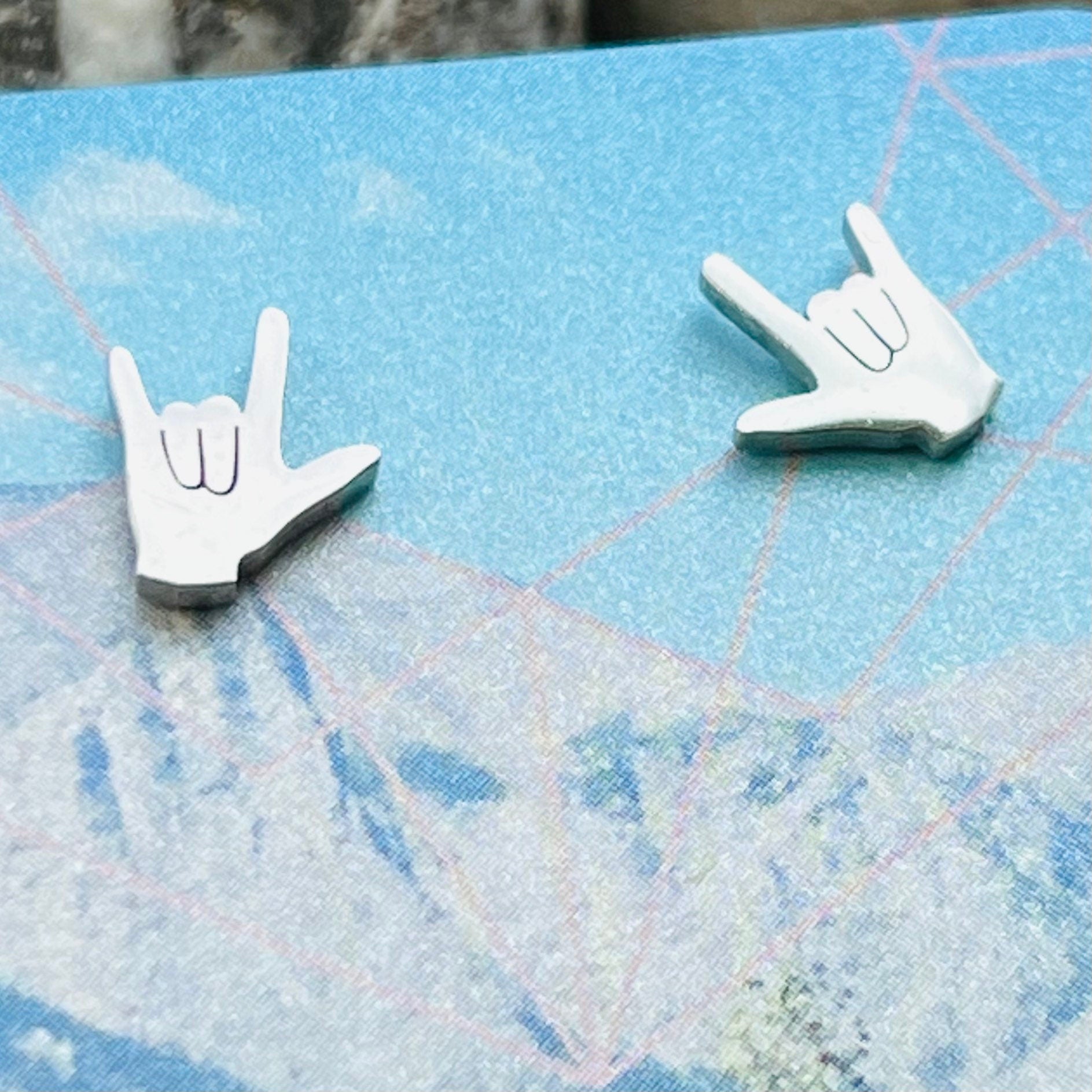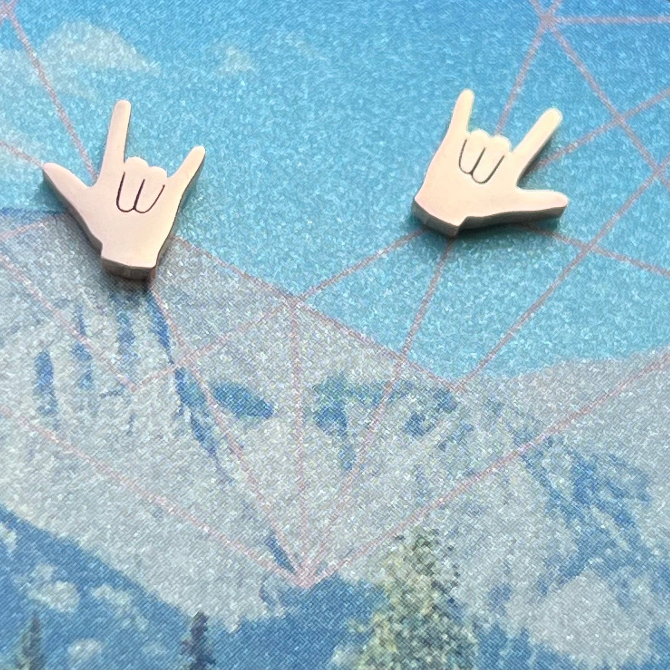 These cute little stainless steel stud earring feature tiny hands using the American Sign Language sign that says I Love You. They are available in gold, silver, black, or rose gold. They are a good choice for everyday wear. They are non corrosive and non tarnish. They are also hypoallergenic and can be worn by most people. Each earring is 8 x 10mm.