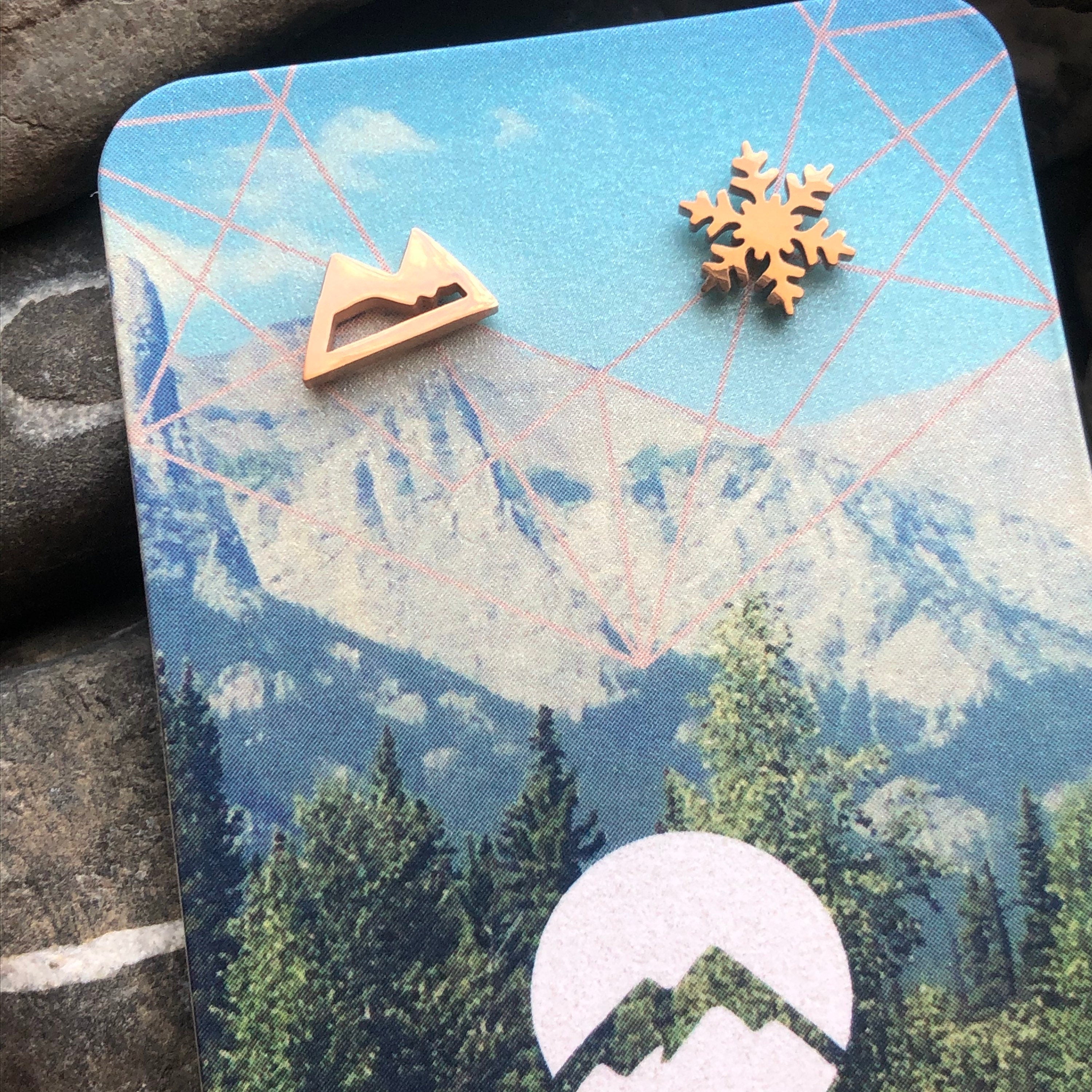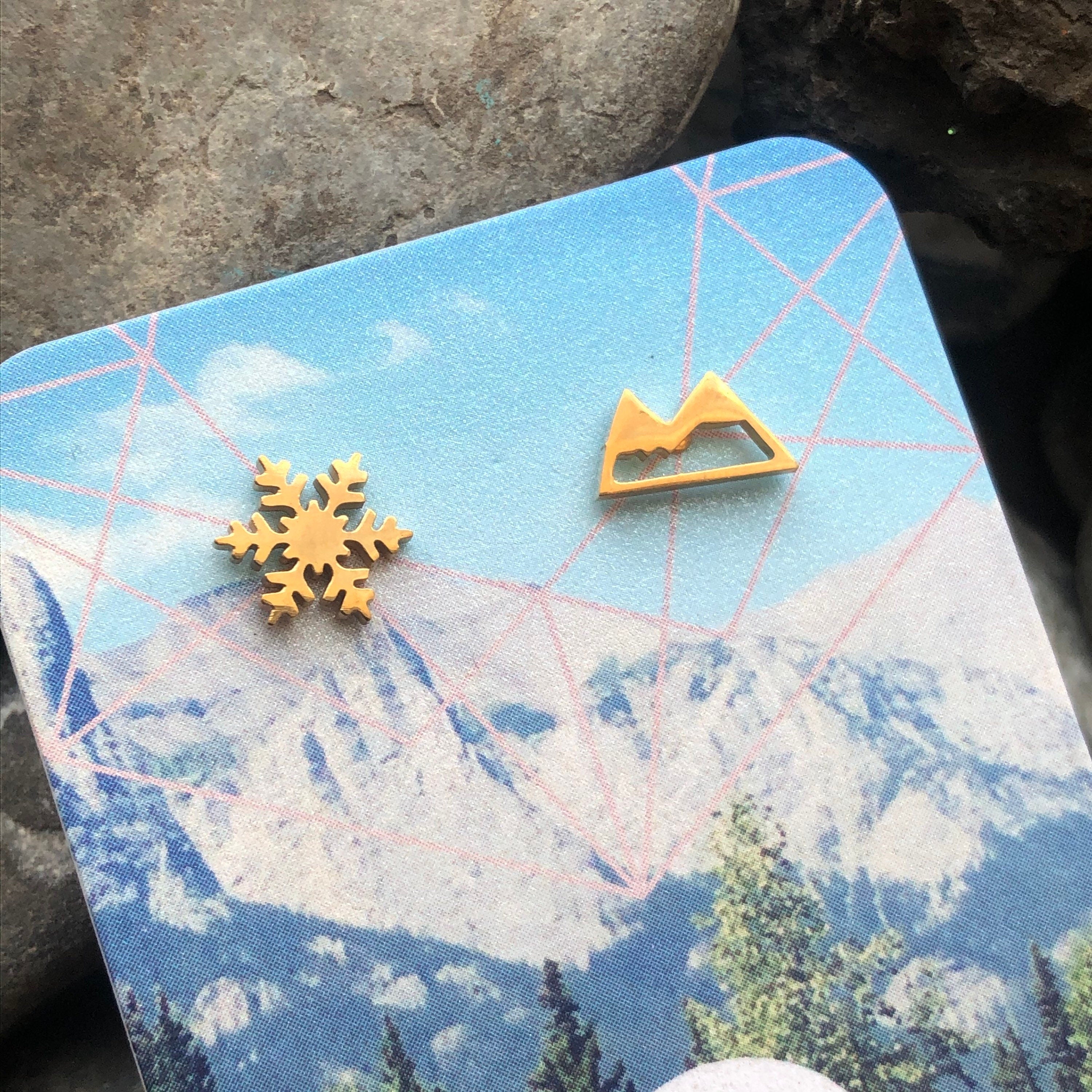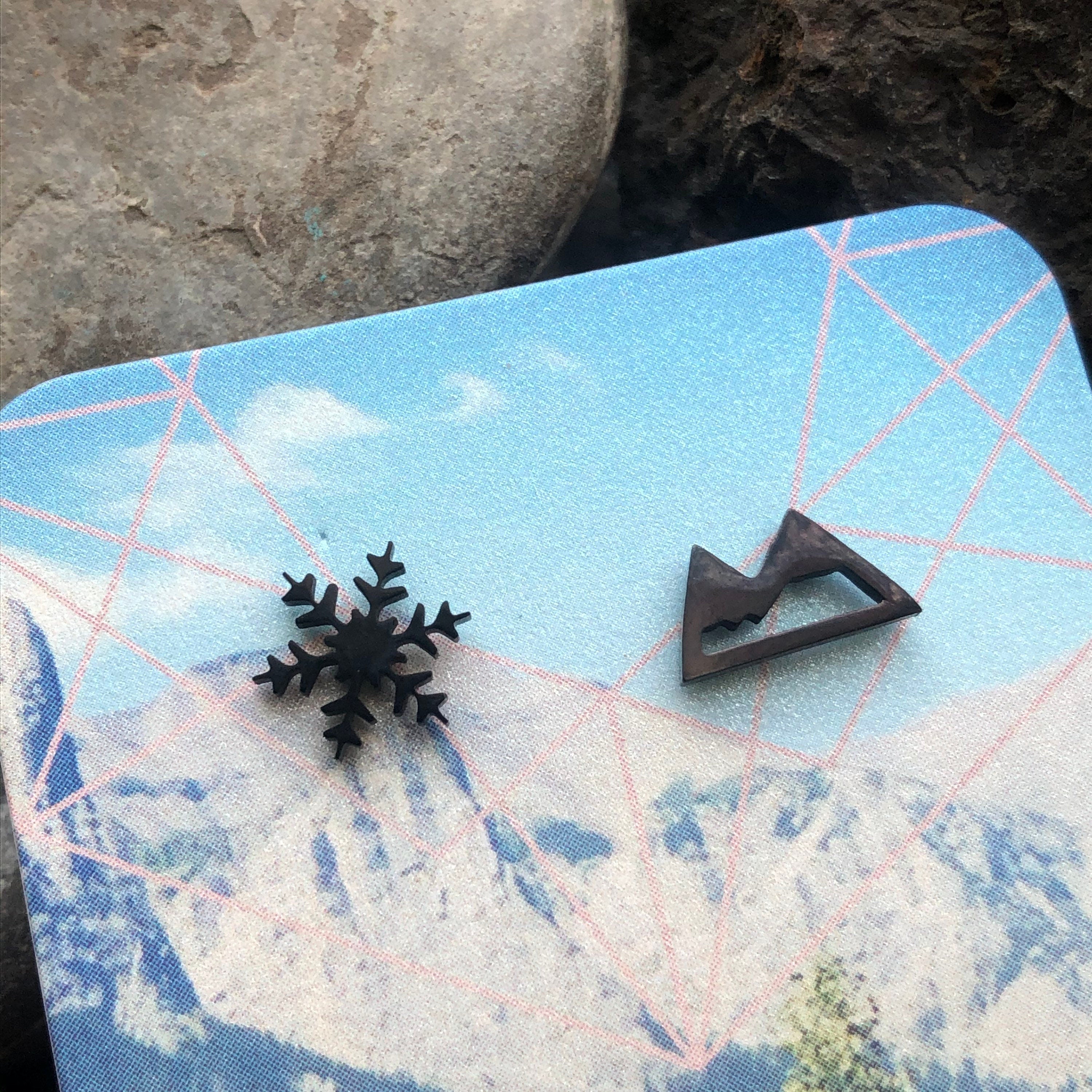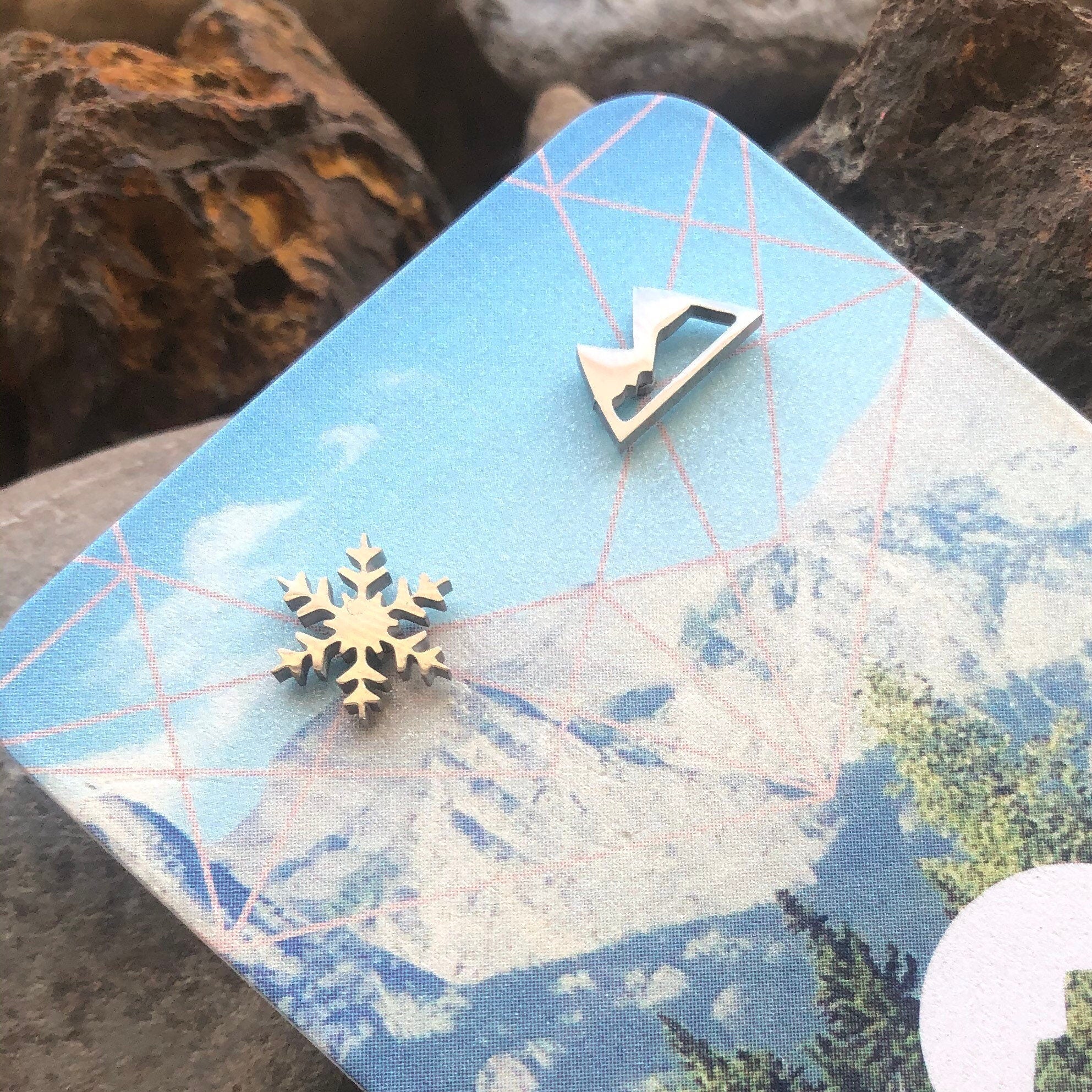 These adorable little mismatched snowflake and mountain studs are perfect for everyday. Whether for adventuring in the mountains or a gift giving, the size is perfect. Made from stainless steel they are hypoallergenic and can be worn by most people and children. These lovely little earrings are shiny, non tarnish and non rusting. Available in silver, gold, rose gold, or black finish.