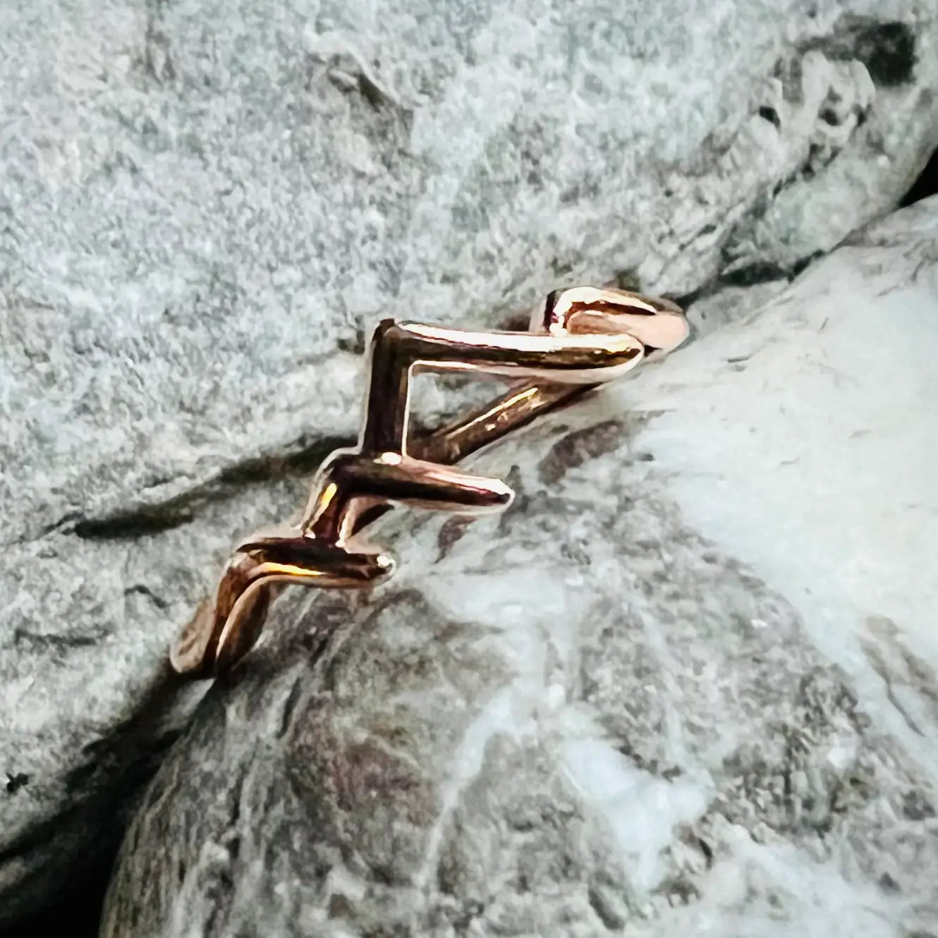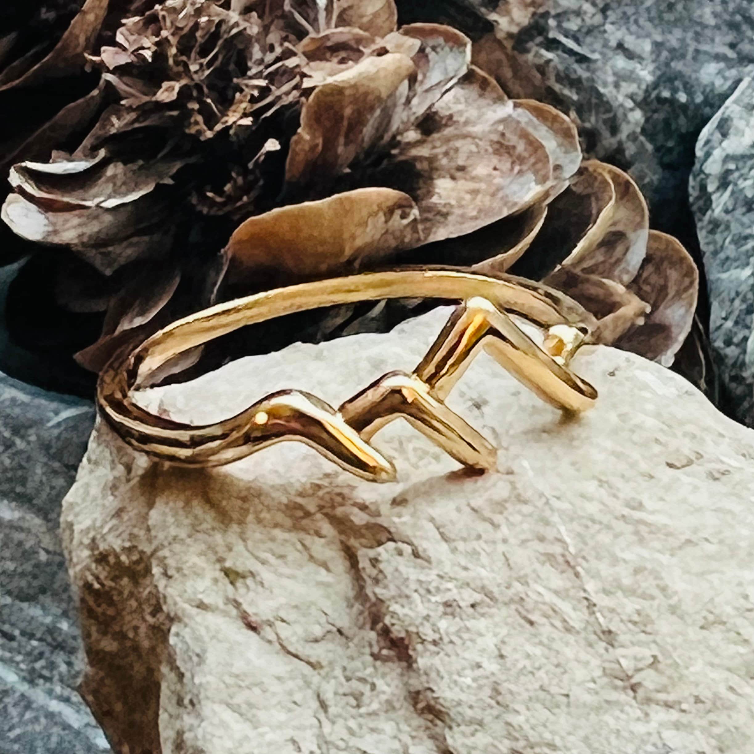 This simple stainless steel mountain band is anodized with silver or gold. It is available in sizes 5-10. It is durable yet delicate. Remove if you use hand sanitizer regularly.