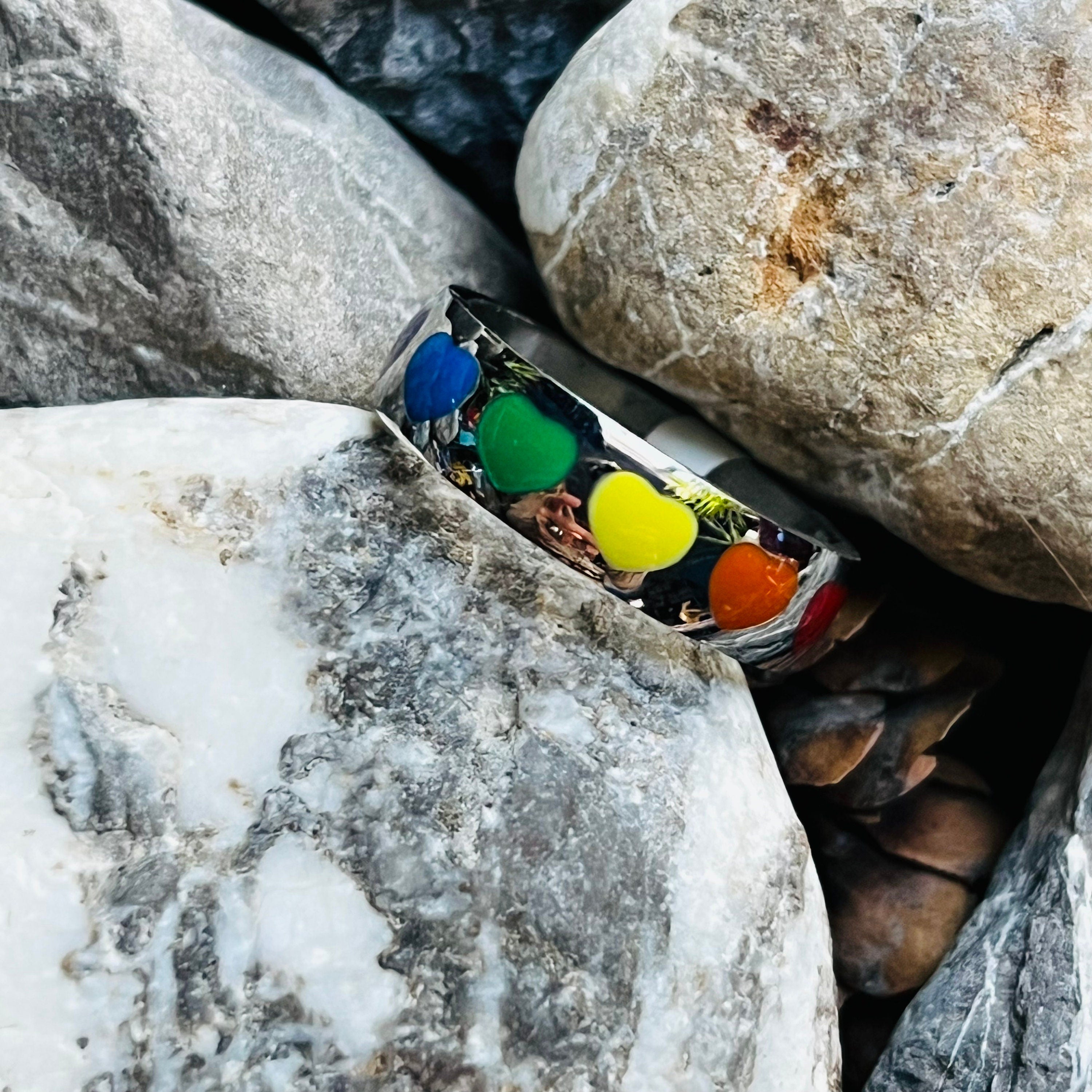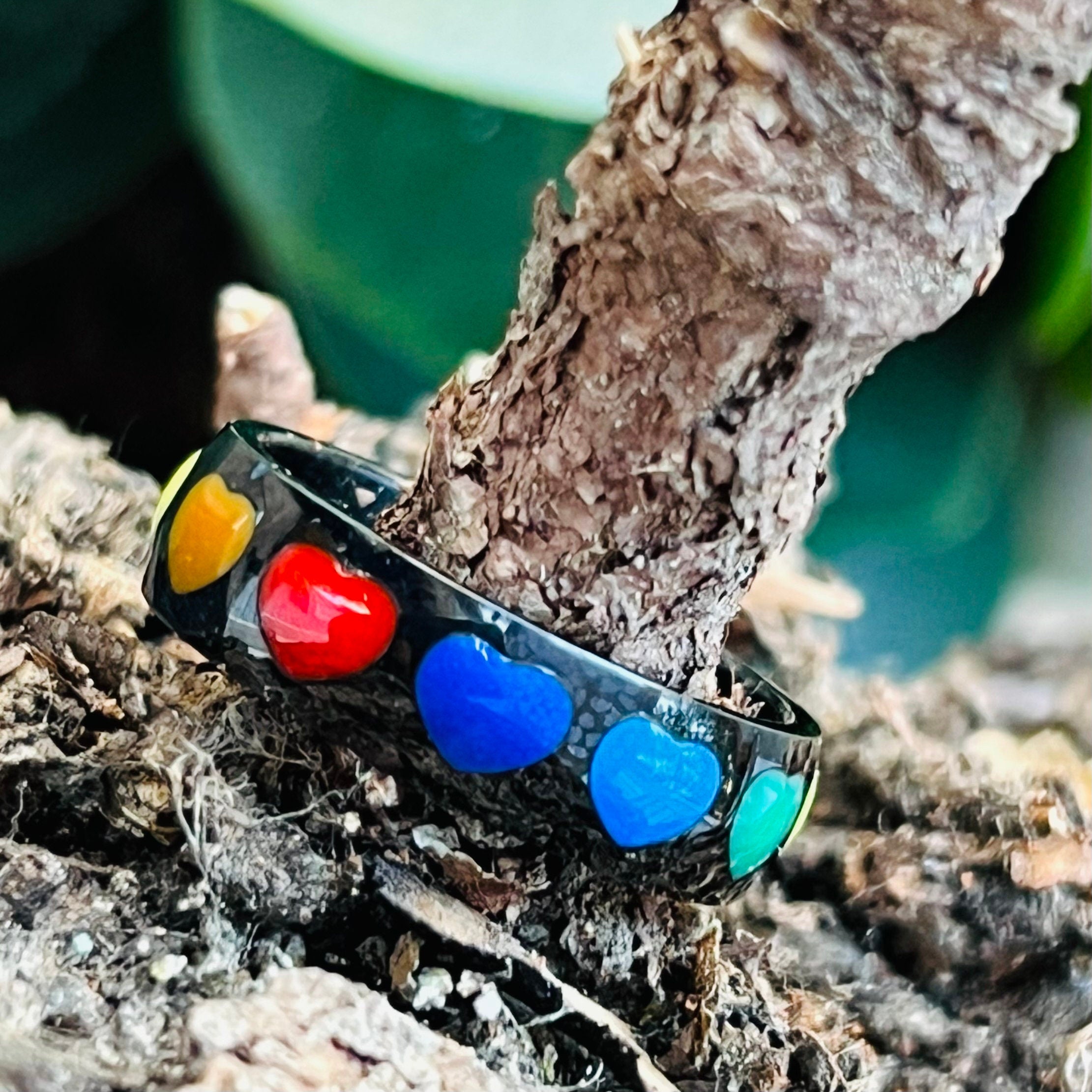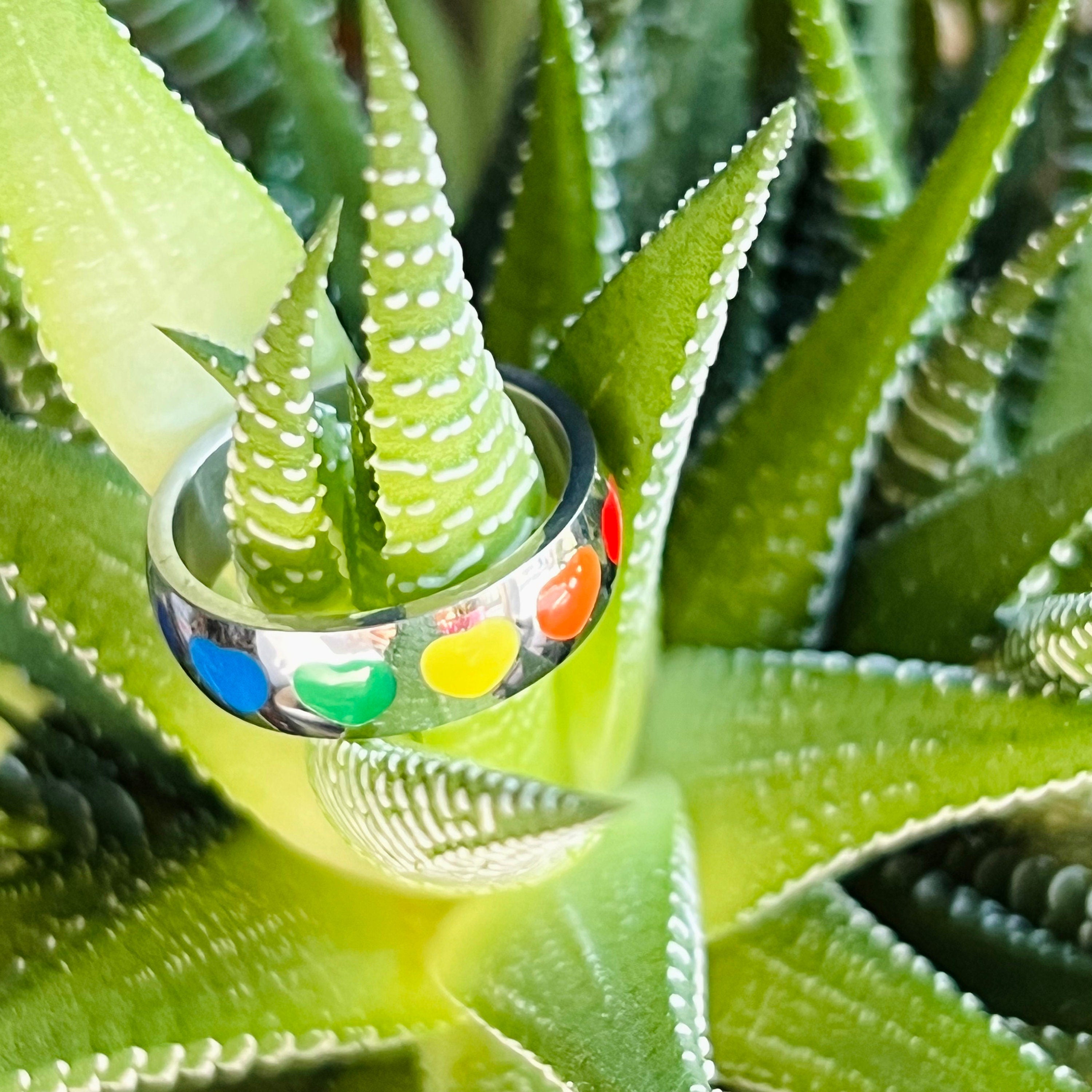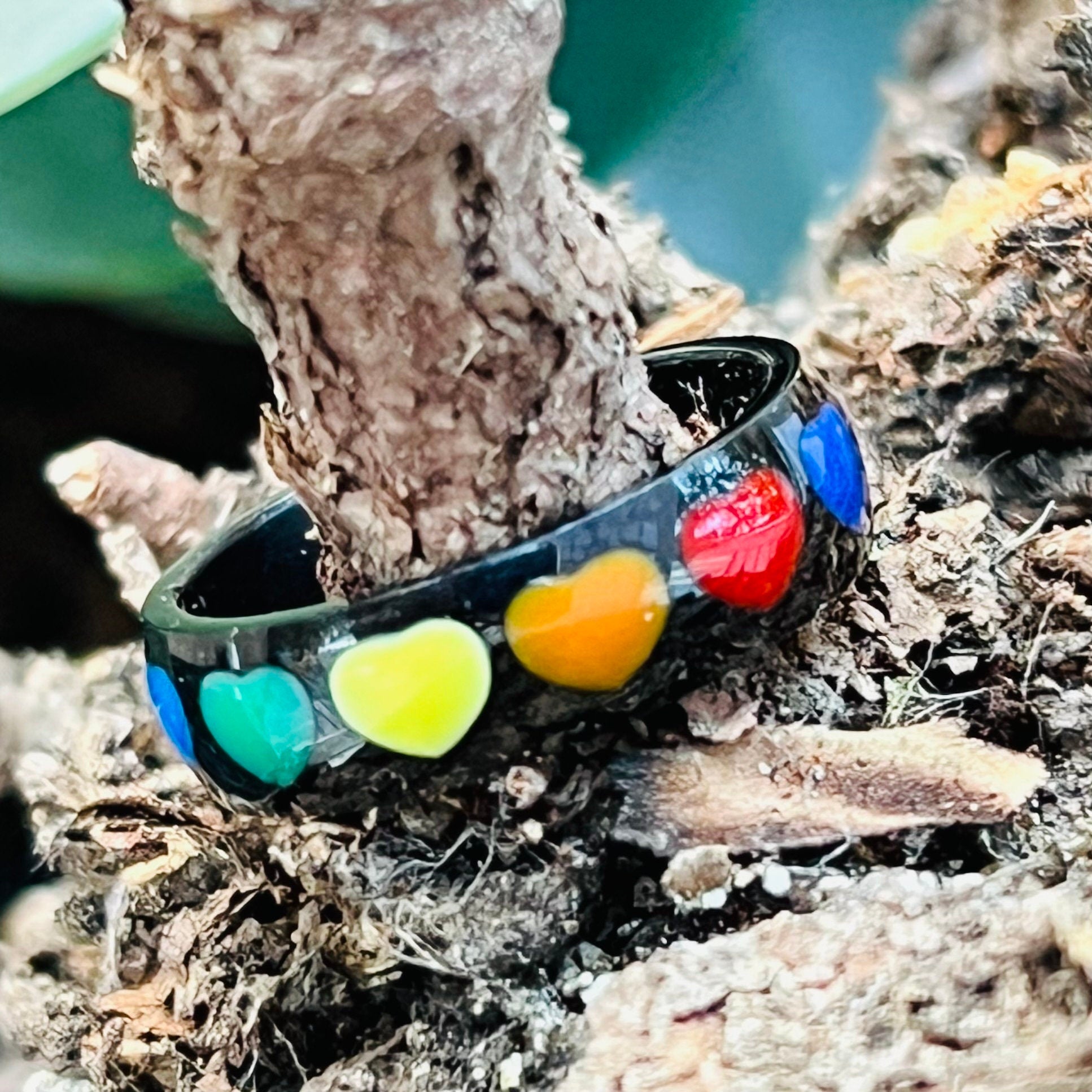 These cheery rainbow heart rings are perfect for expressing an appreciate for all things love, inclusivity, hearts and rainbows. These rings are stainless steel with enamelled hearts and are available in a variety of sizes and in both silver and black base colour.