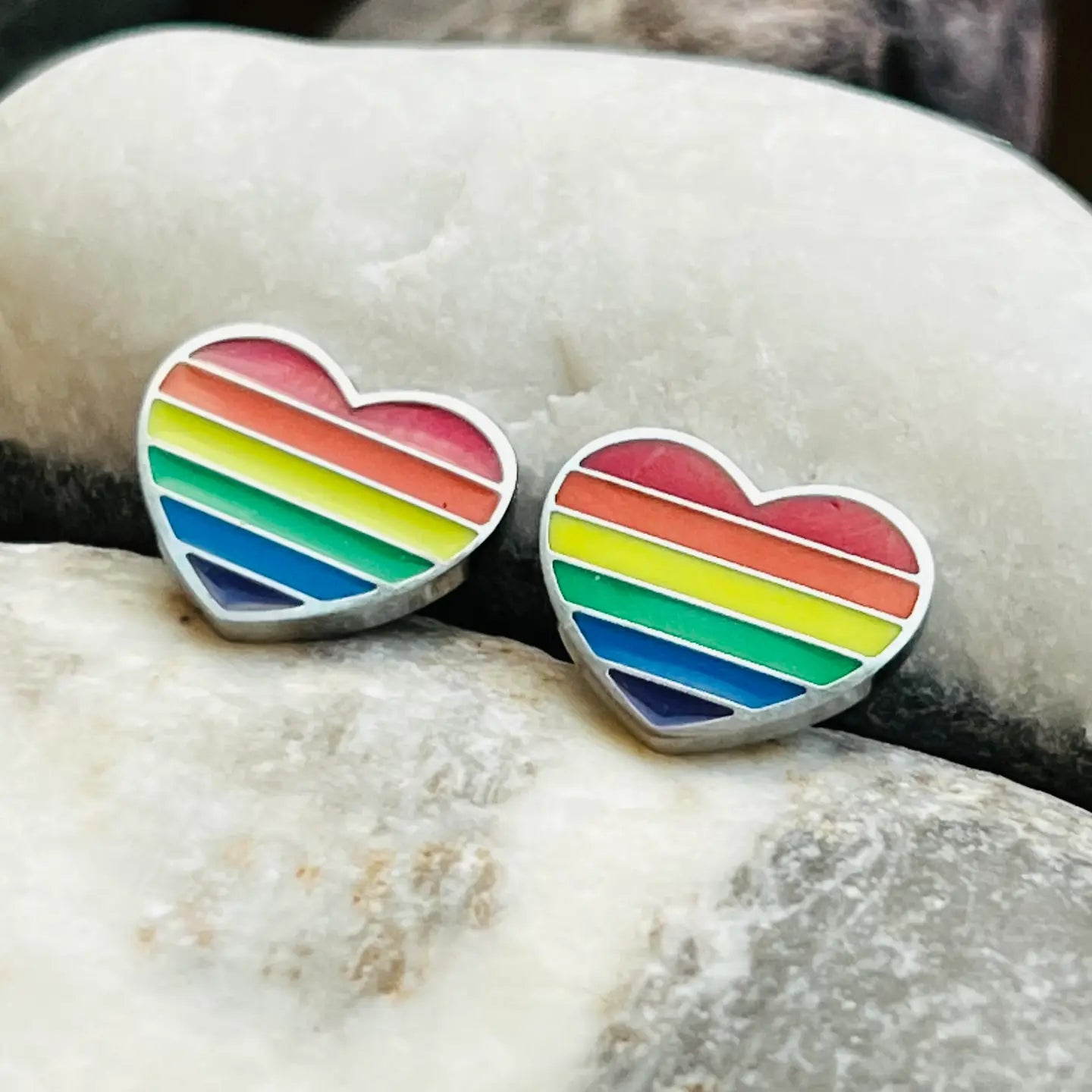 This super fun stainless steel enamelled rainbow heart studs are hypoallergenic and can go in the water. Show your pride or love for rainbows.