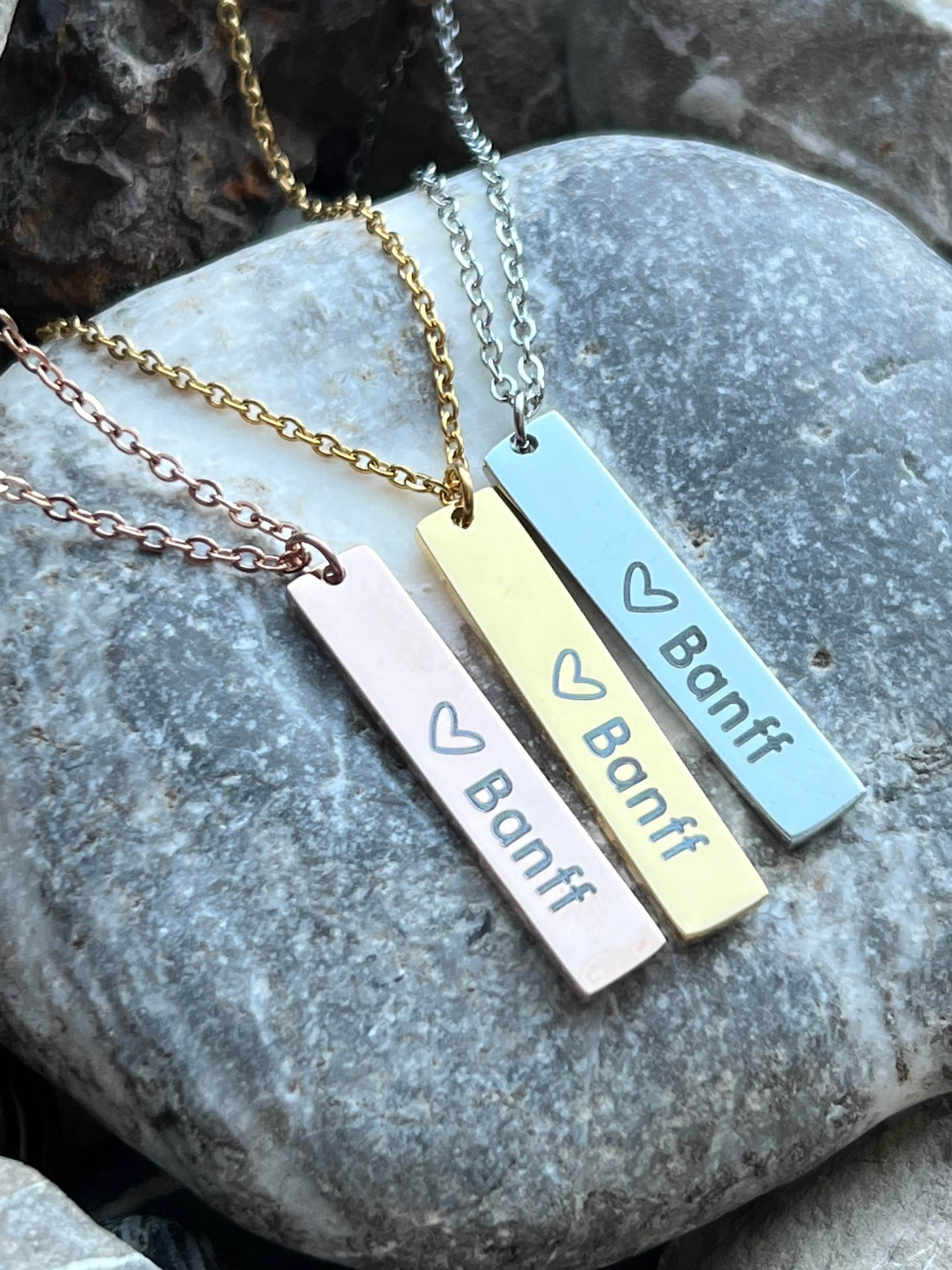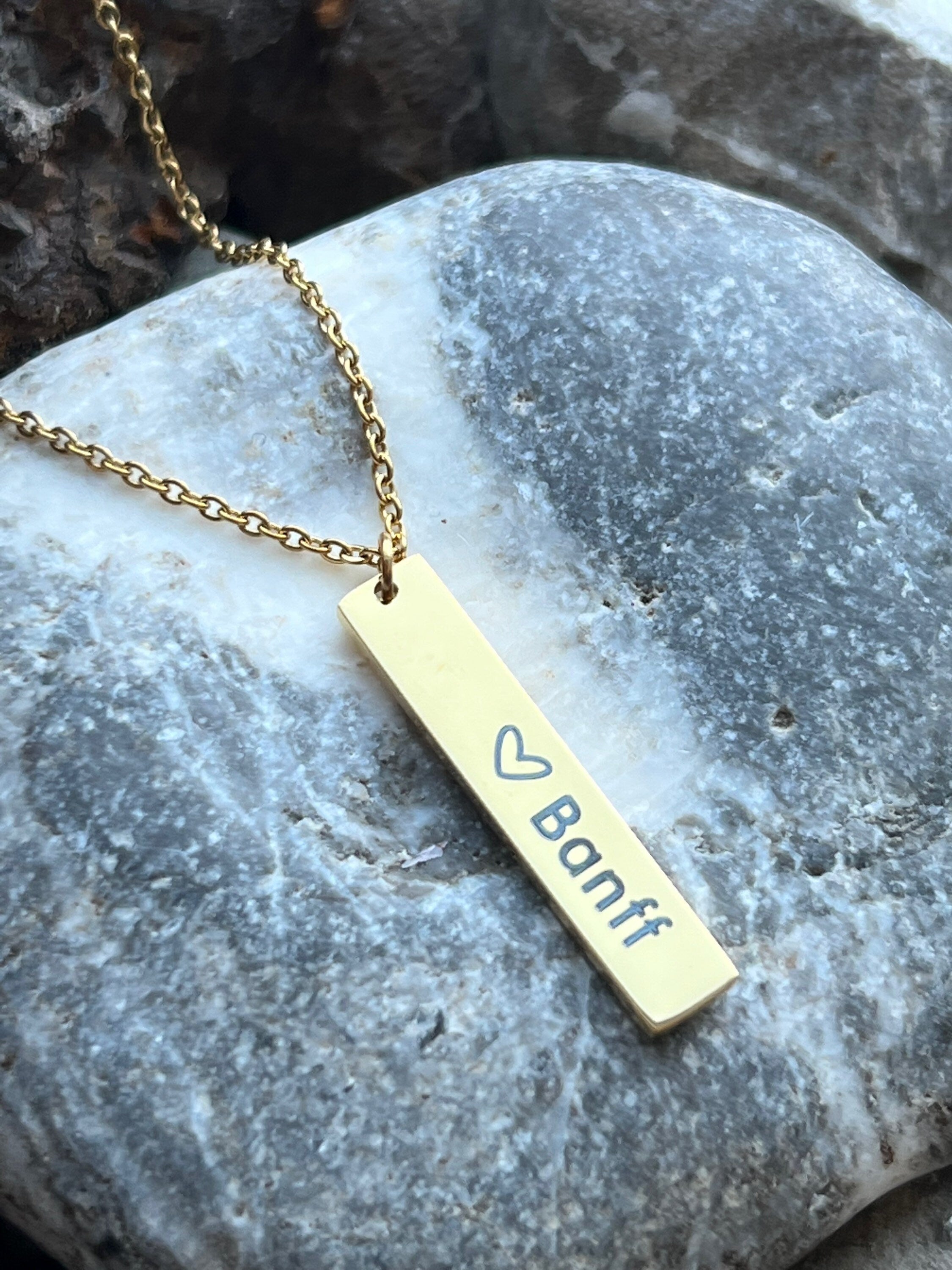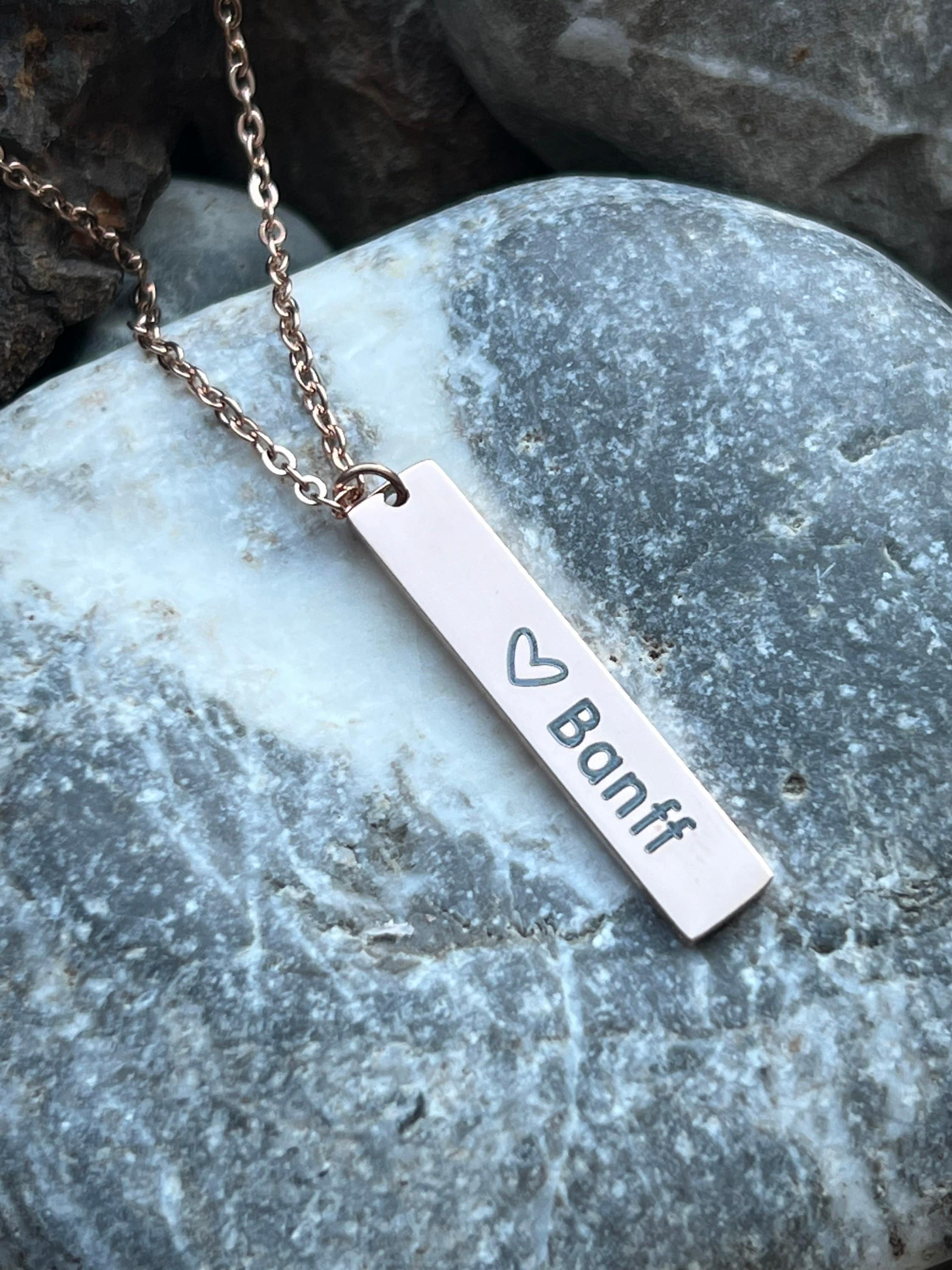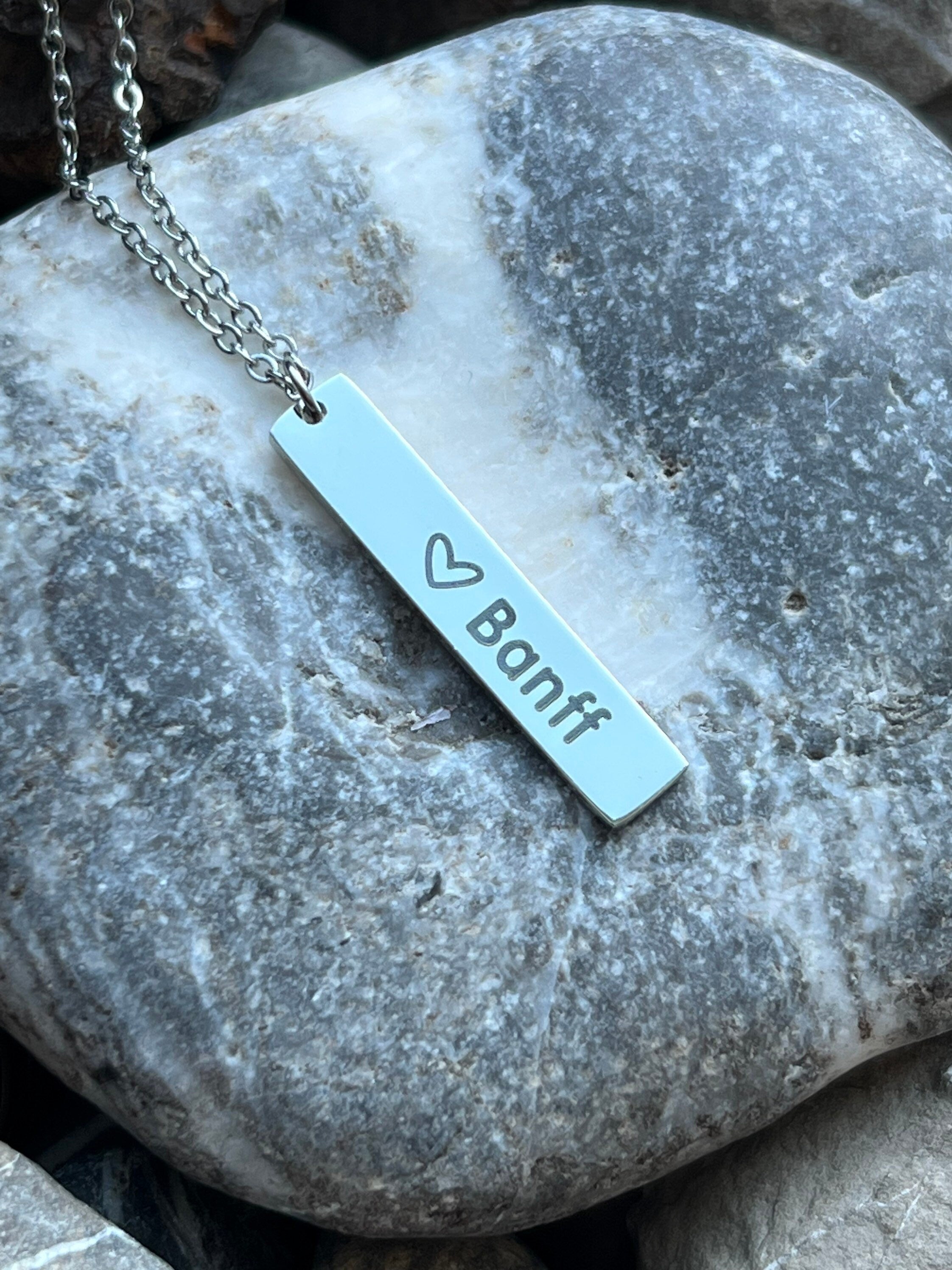 This beautiful stainless steel necklace is stamped with a heart and Banff. If your heart is in the mountains this keepsake necklace is the perfect one to help you express it. The chain comes with an adjuster so it can be worn from 15” choker length to 18” mid chest. This necklace is non tarnish and hypoallergenic. The pendant is 1.25” by .25”.