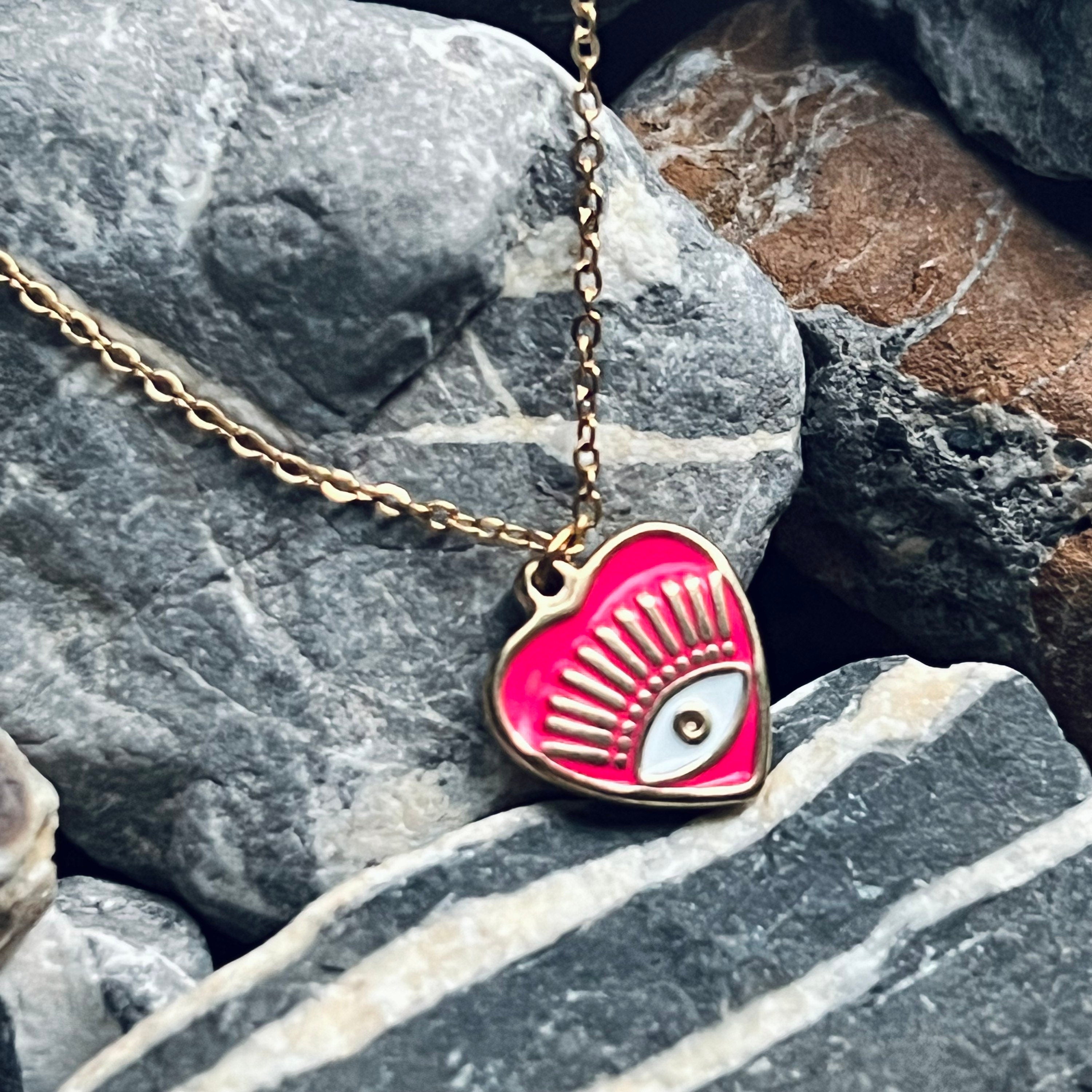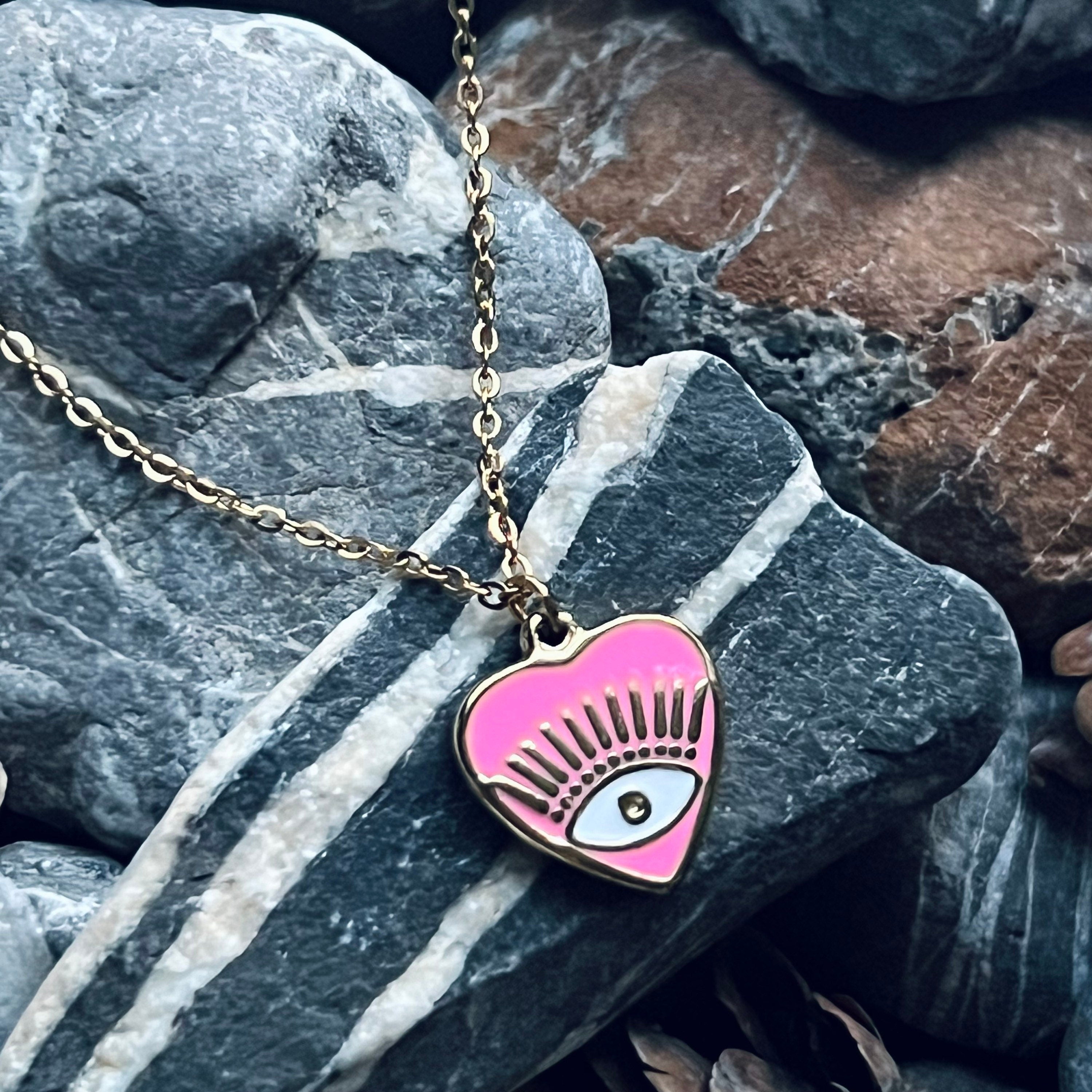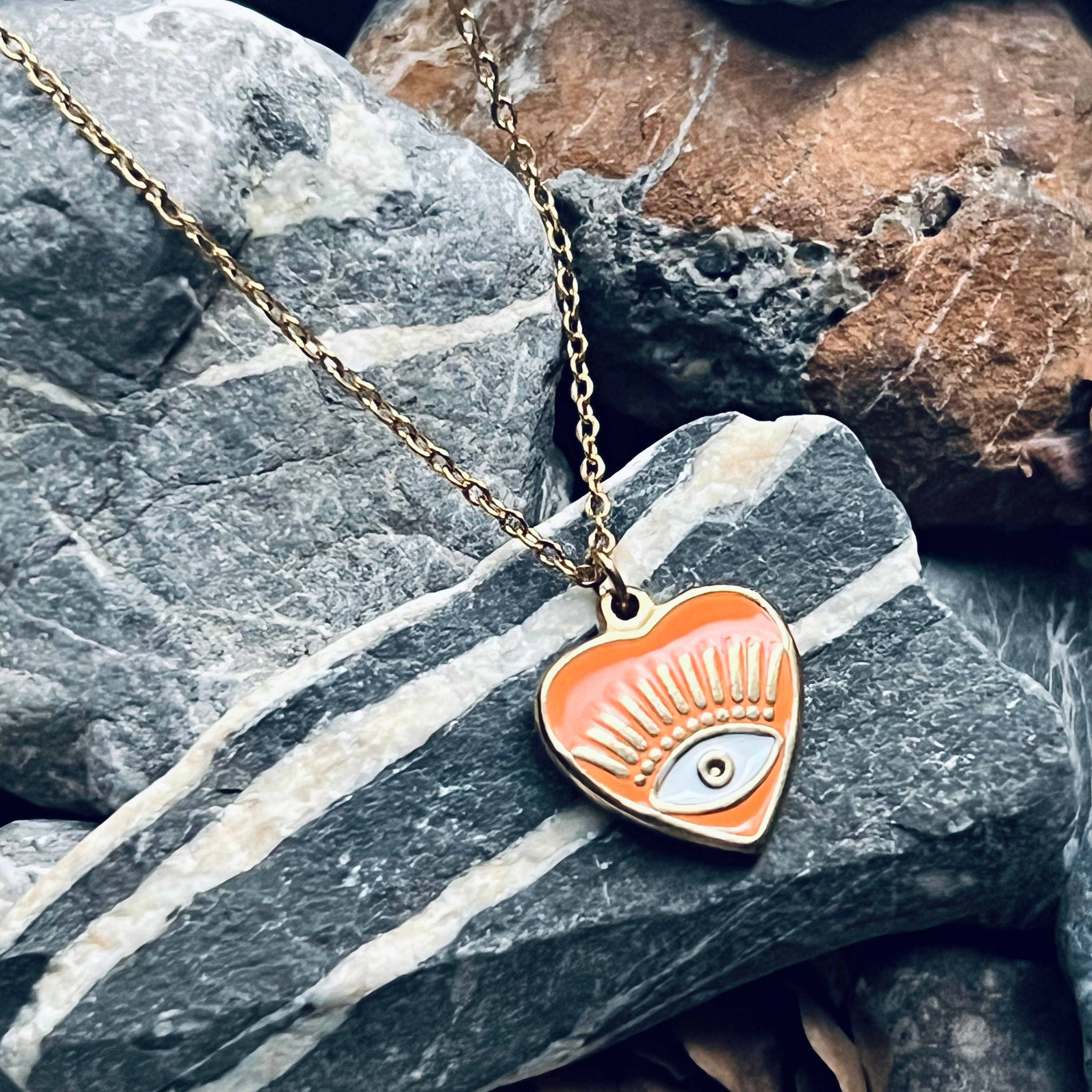 These lovely vibrant gold stainless e-bike eye heart pendants come in four colours, blue, orange, pink, and dark pink. They come with an 18” stainless steel chain that came be adjusted to be worn from 15” choker length to 18”, which falls about mid chest. These are non-fading, non-tarnish, and non allergenic. A great gift!