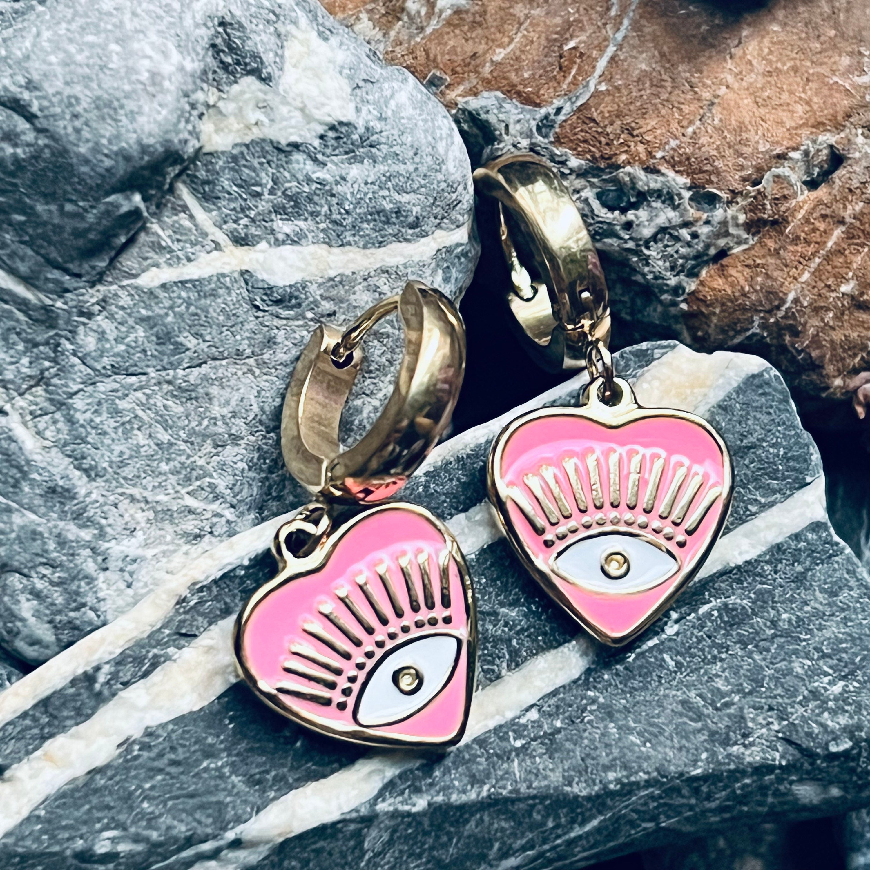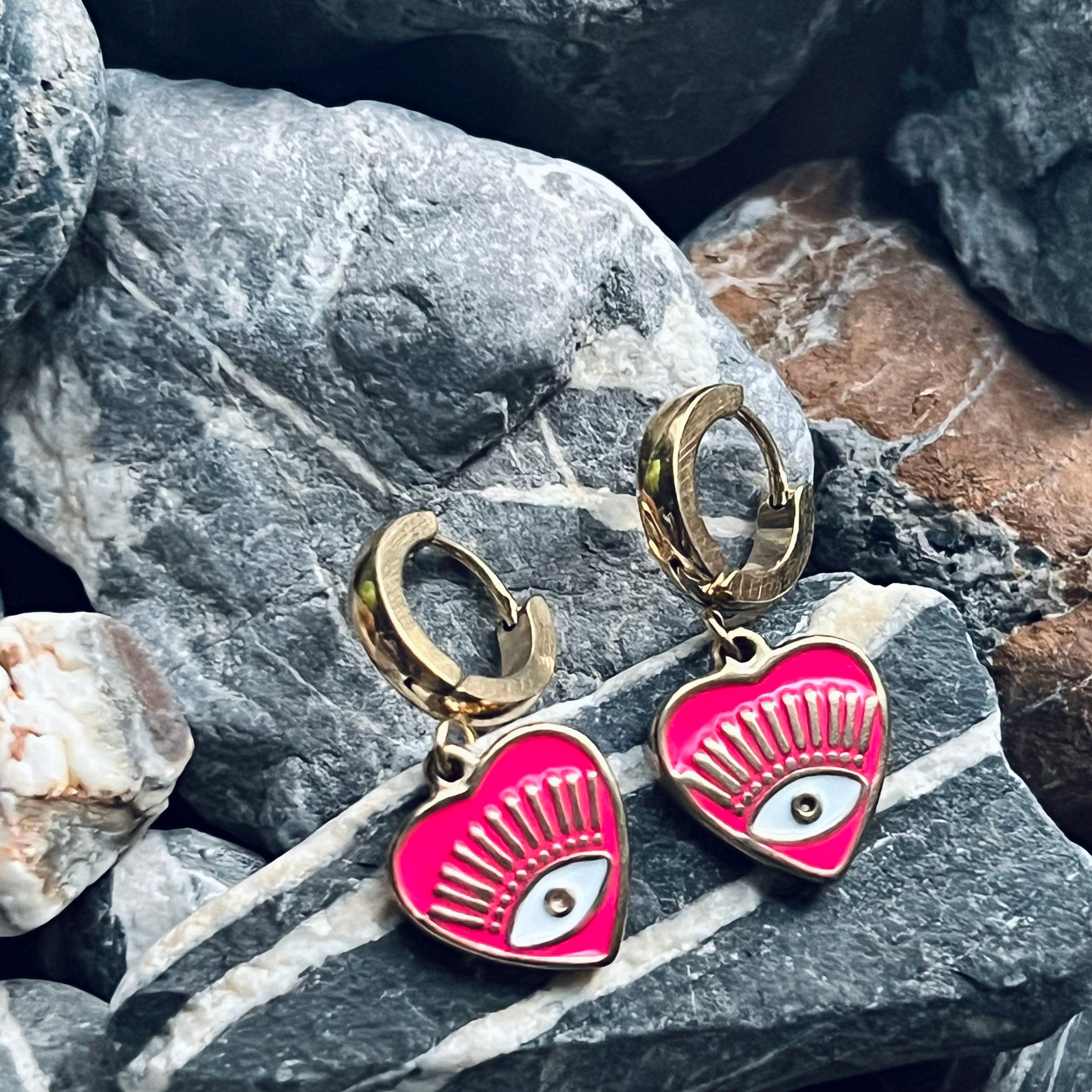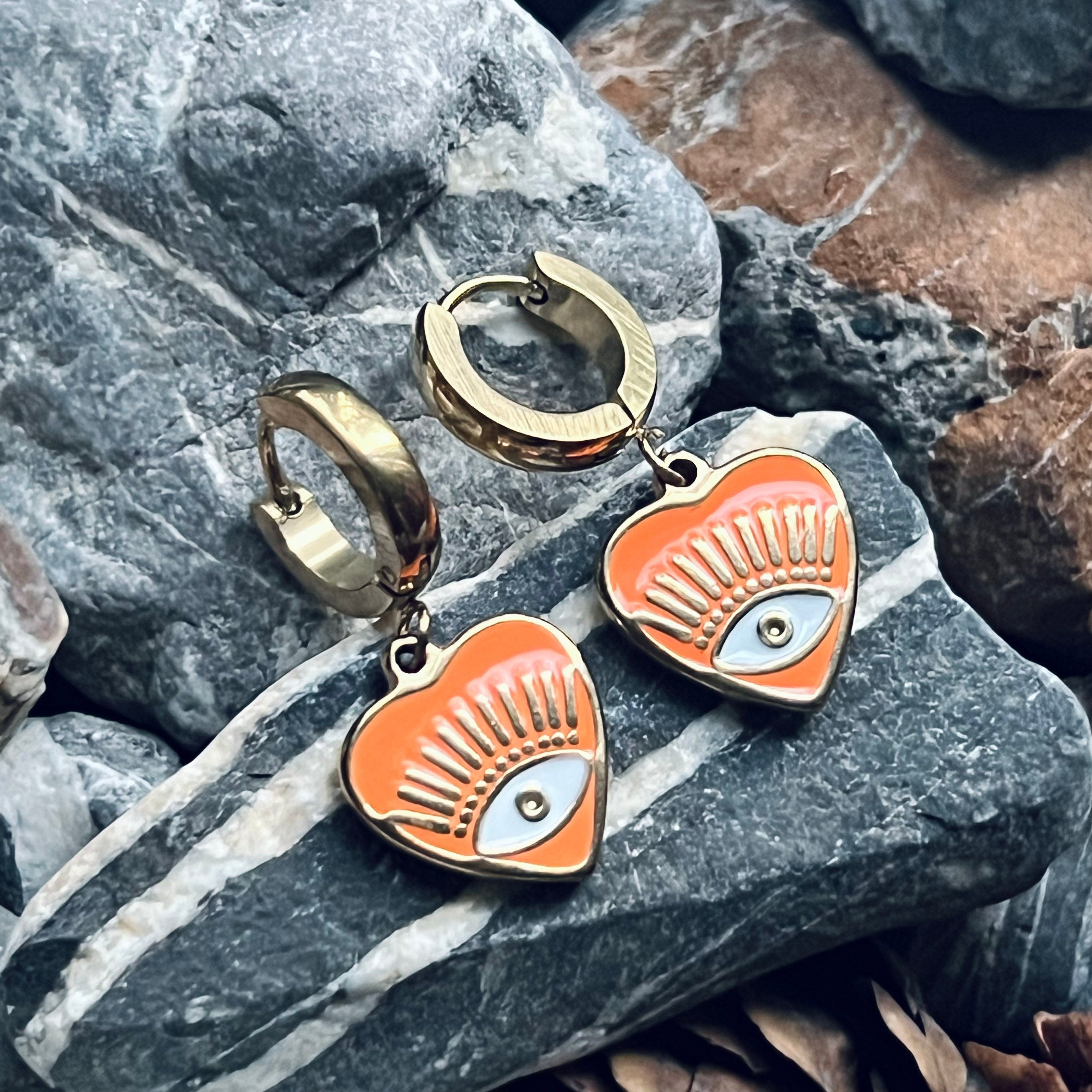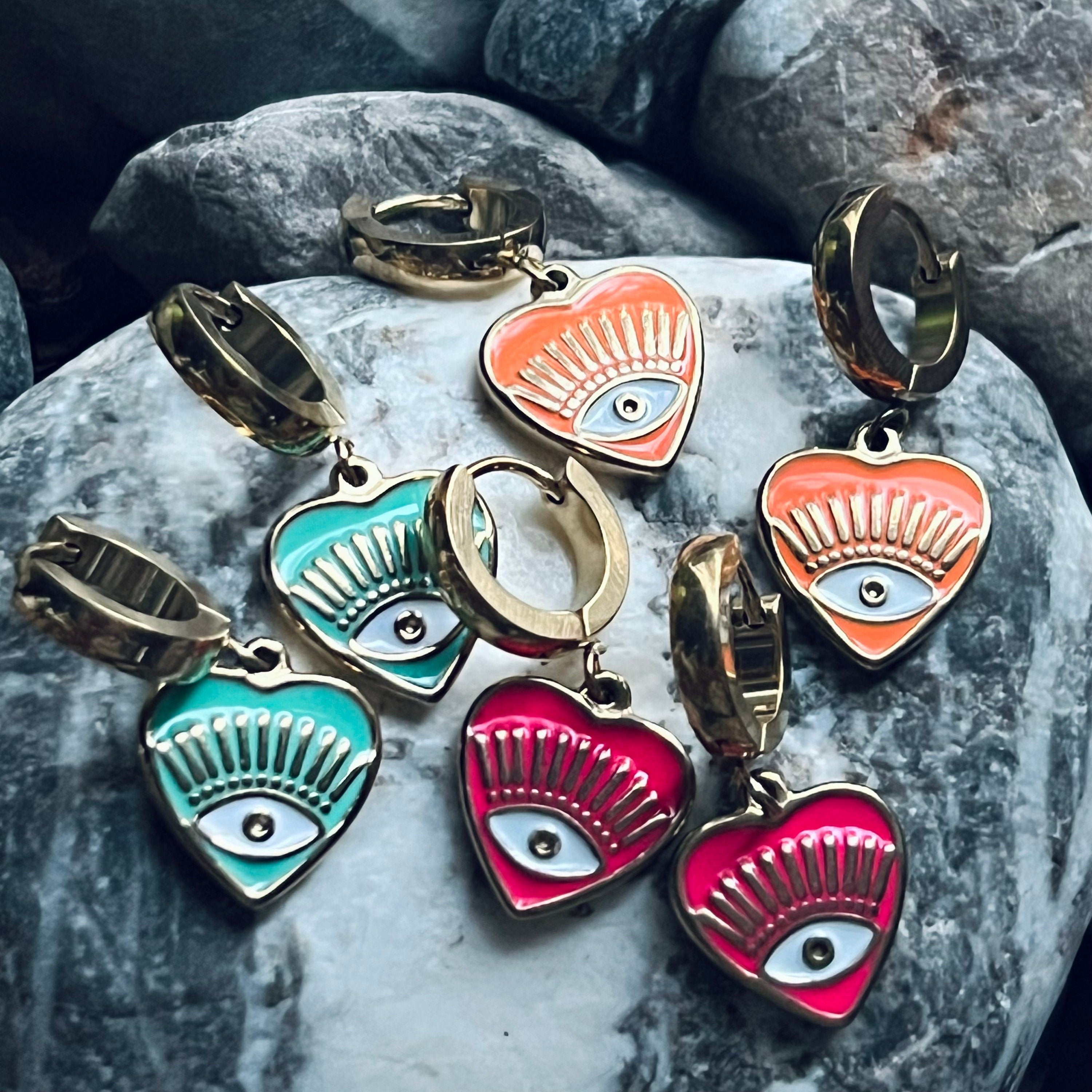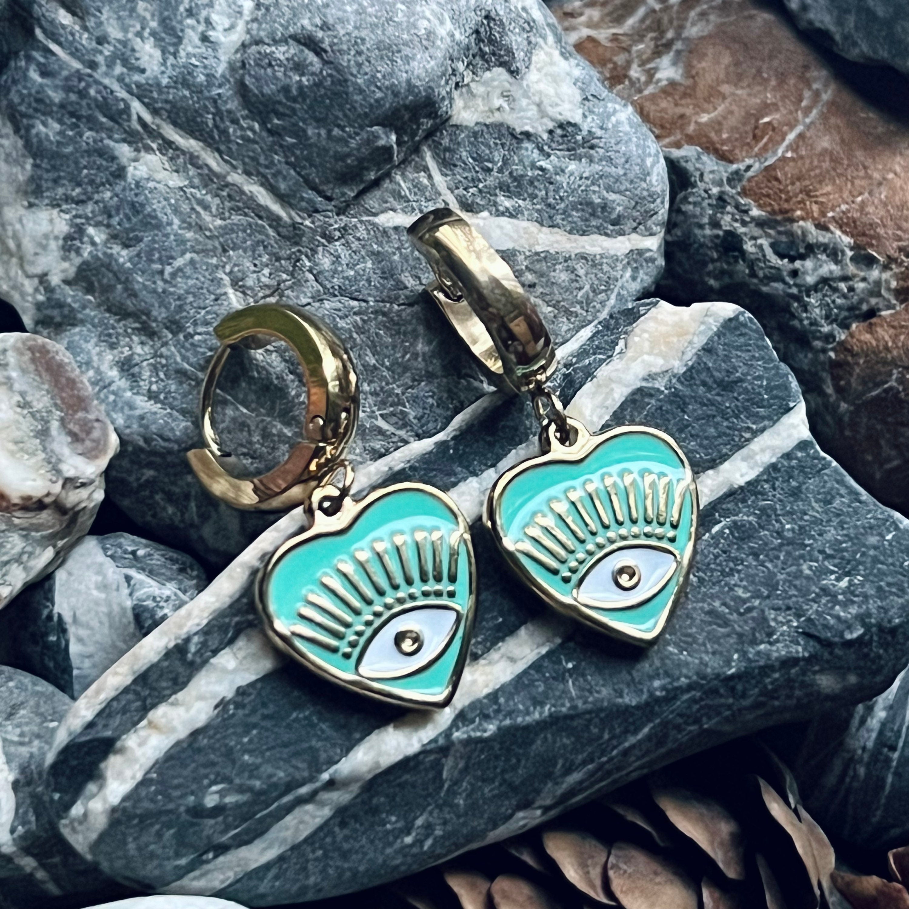 These gold stainless steel heart enamelled evil eye hoops are the perfect size for everyday comfort with lots of impact. They are 15mm hearts on 15mm snap closure thick hoops. (Thinner and larger hoops are available, just message me). These are stainless steel hoops anodized with gold so they are non-fading, non-tarnish, and non allergenic.