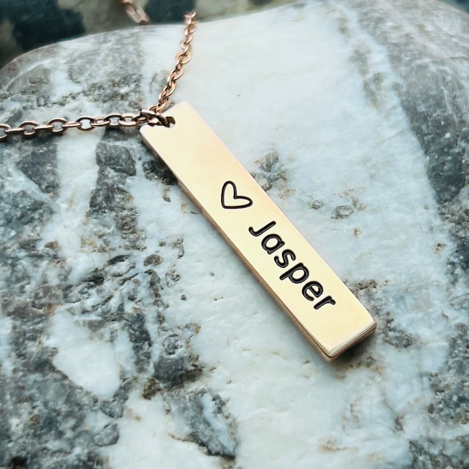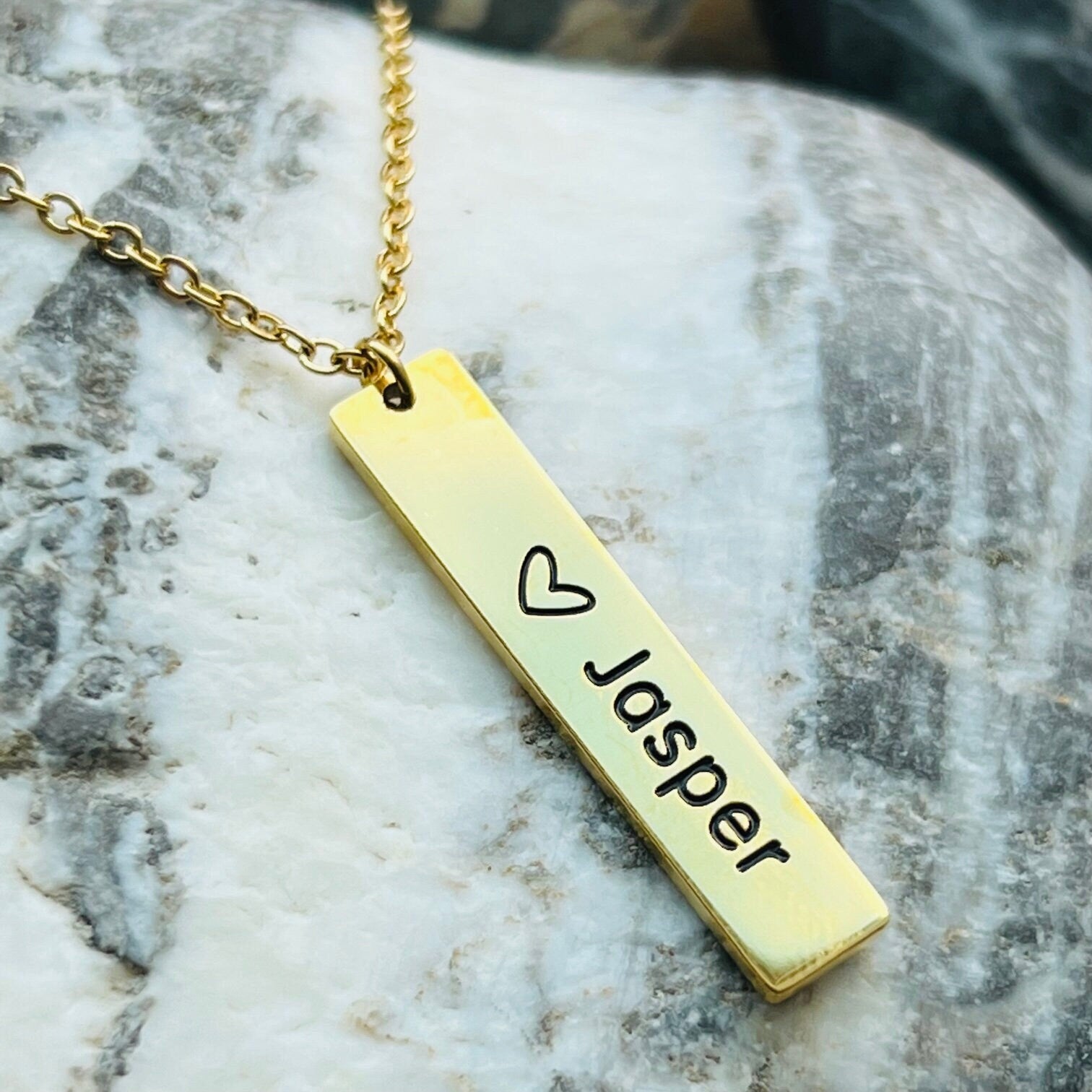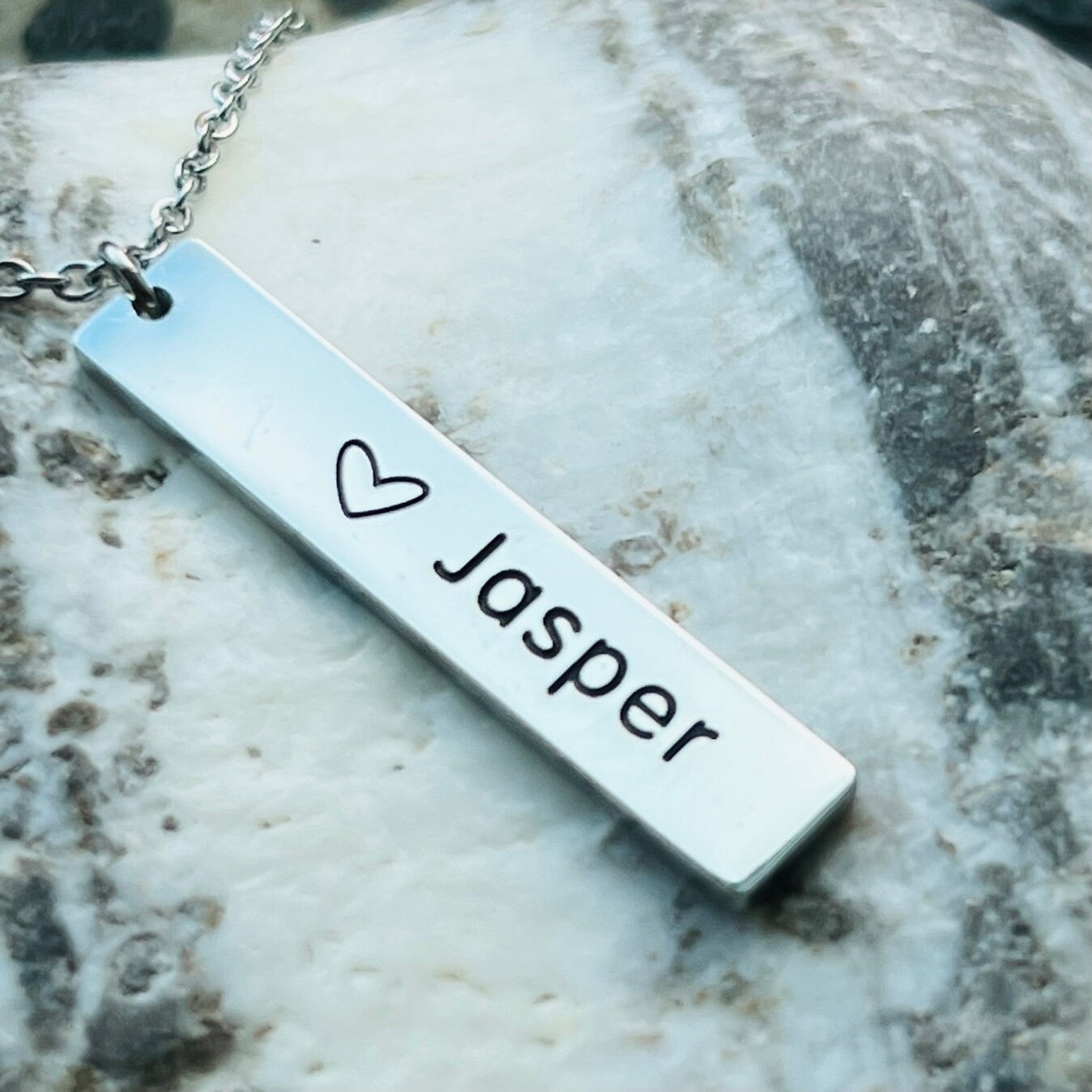 This beautiful stainless steel necklace is stamped with a heart and Jasper. If your heart is in the mountains this keepsake necklace is the perfect one to help you express it. The chain comes with an adjuster so it can be worn from 15” choker length to 18” mid chest. This necklace is non tarnish and hypoallergenic. The pendant is 1.25” by .25”.
