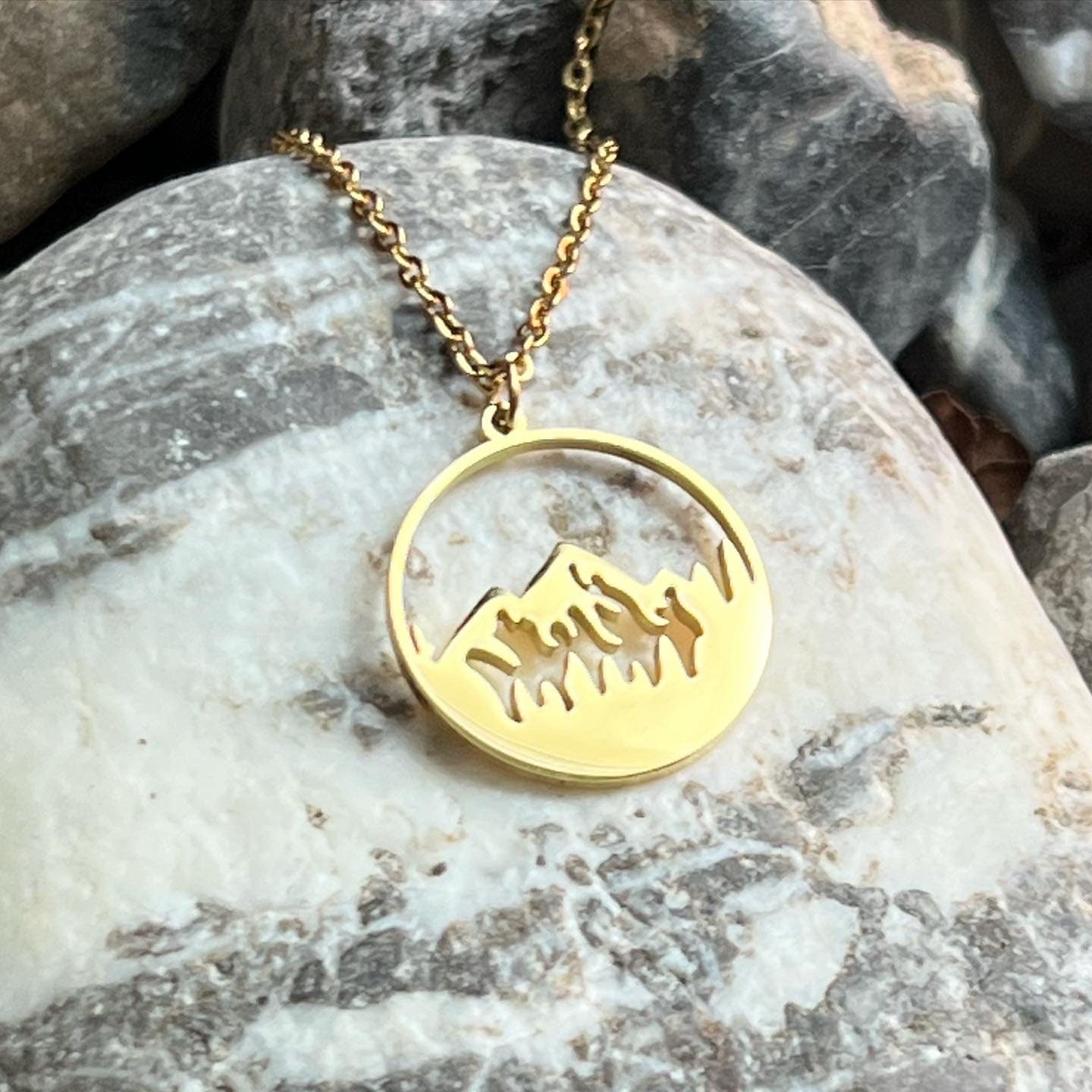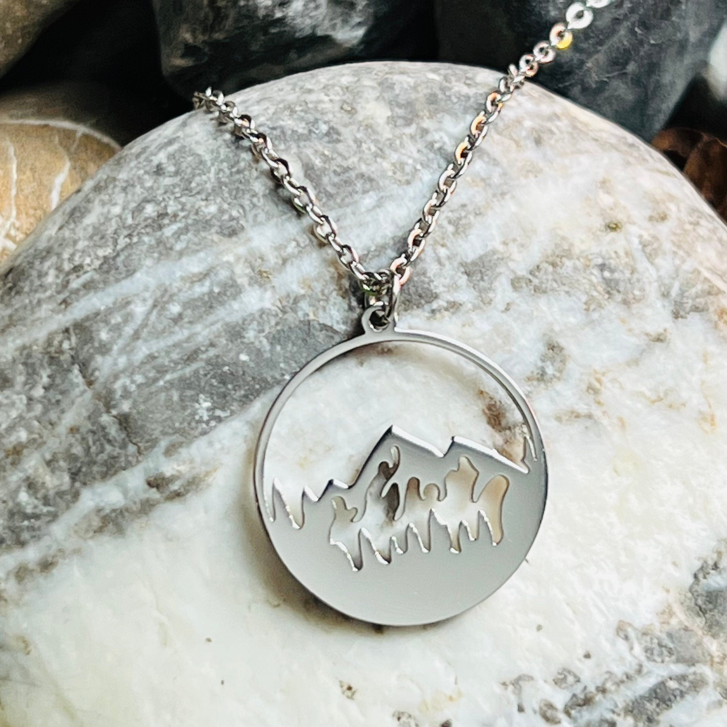 This lovely circle stainless steel mountain scape necklace features a beautiful openwork design. It is available in gold or silver. It is a good choice for everyday wear. It is non corrosive and non tarnish. It is also hypoallergenic and can be worn by most people. It makes a perfect gift for yourself or a friend. The strong chain makes it a good choice for active lifestyles. It has an 18” link chain.