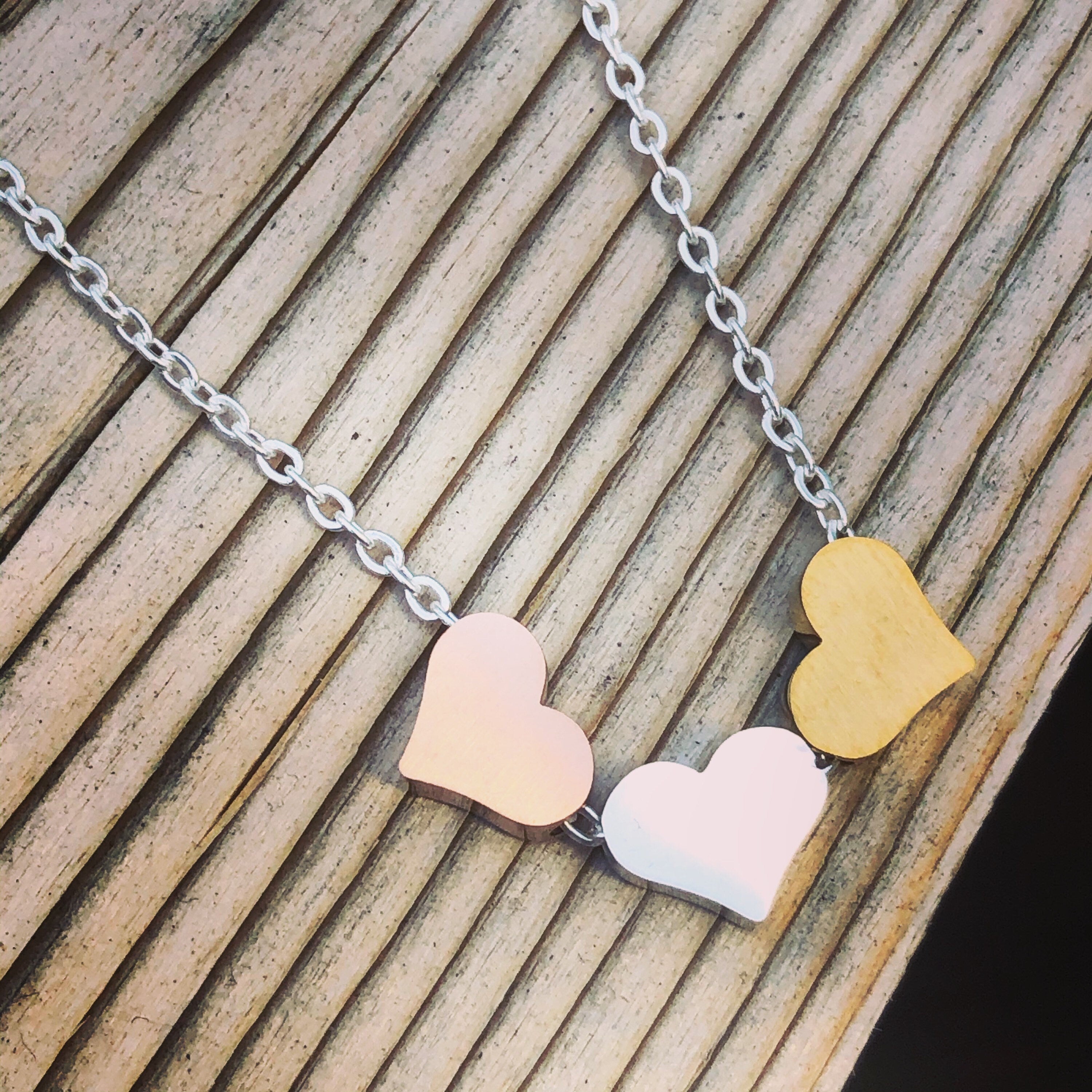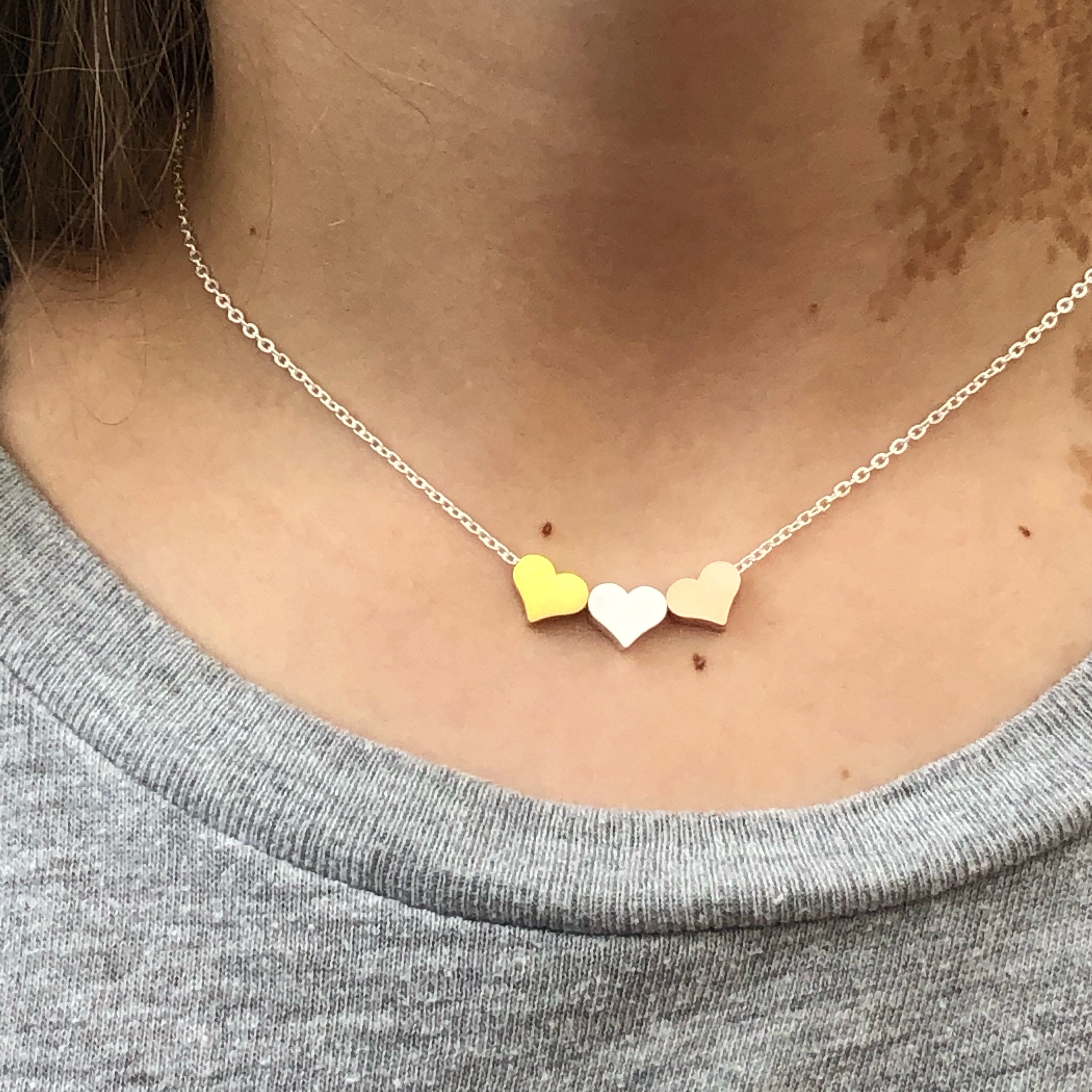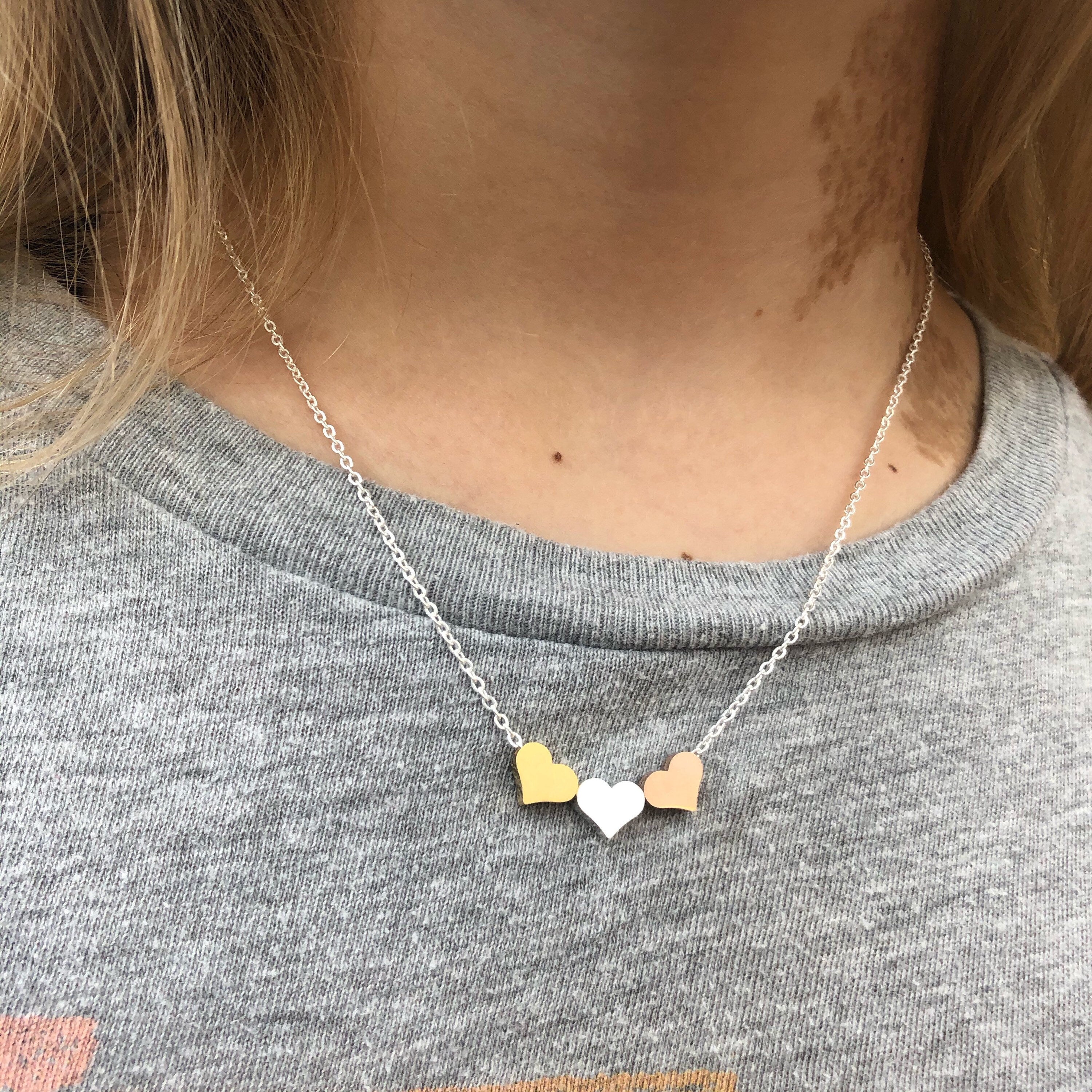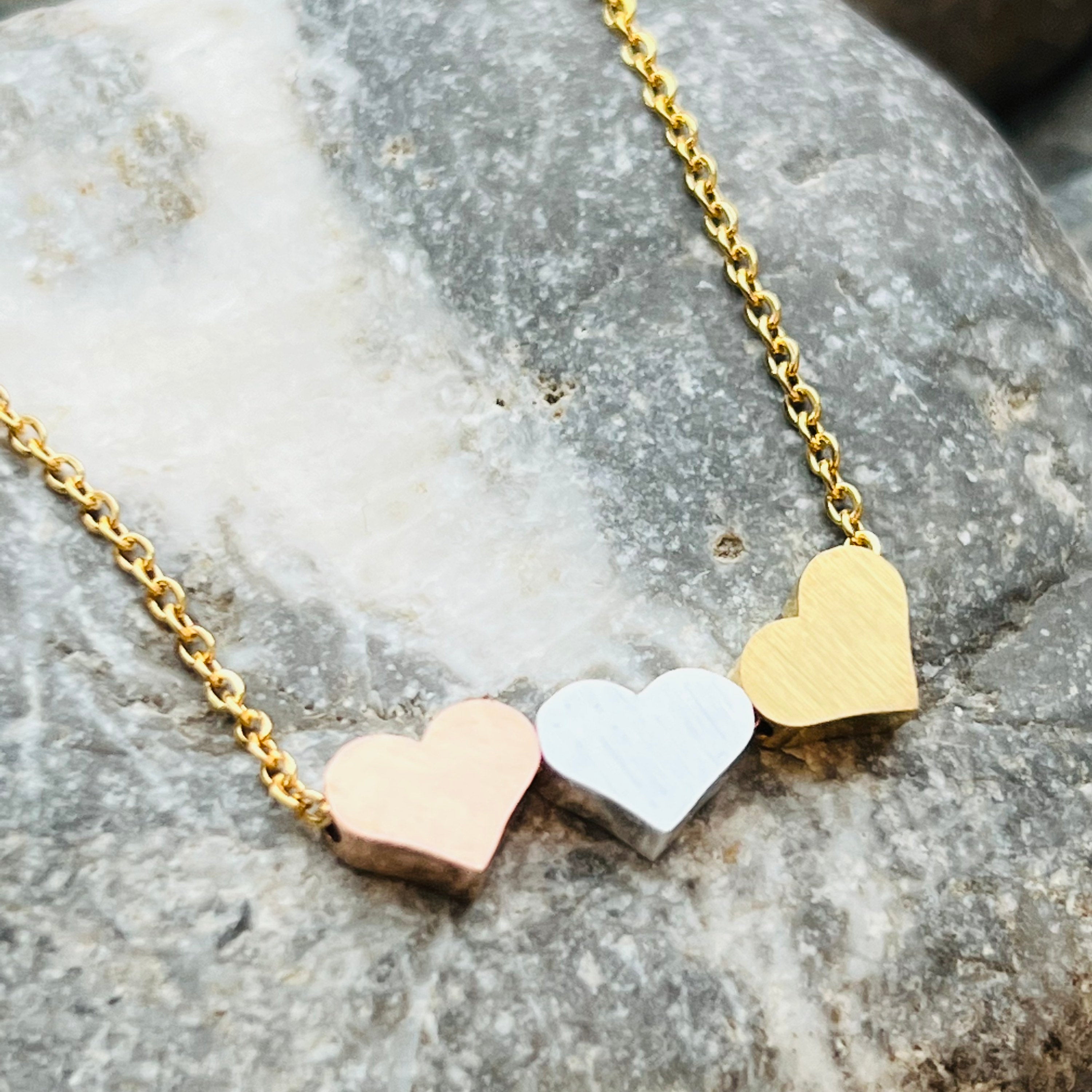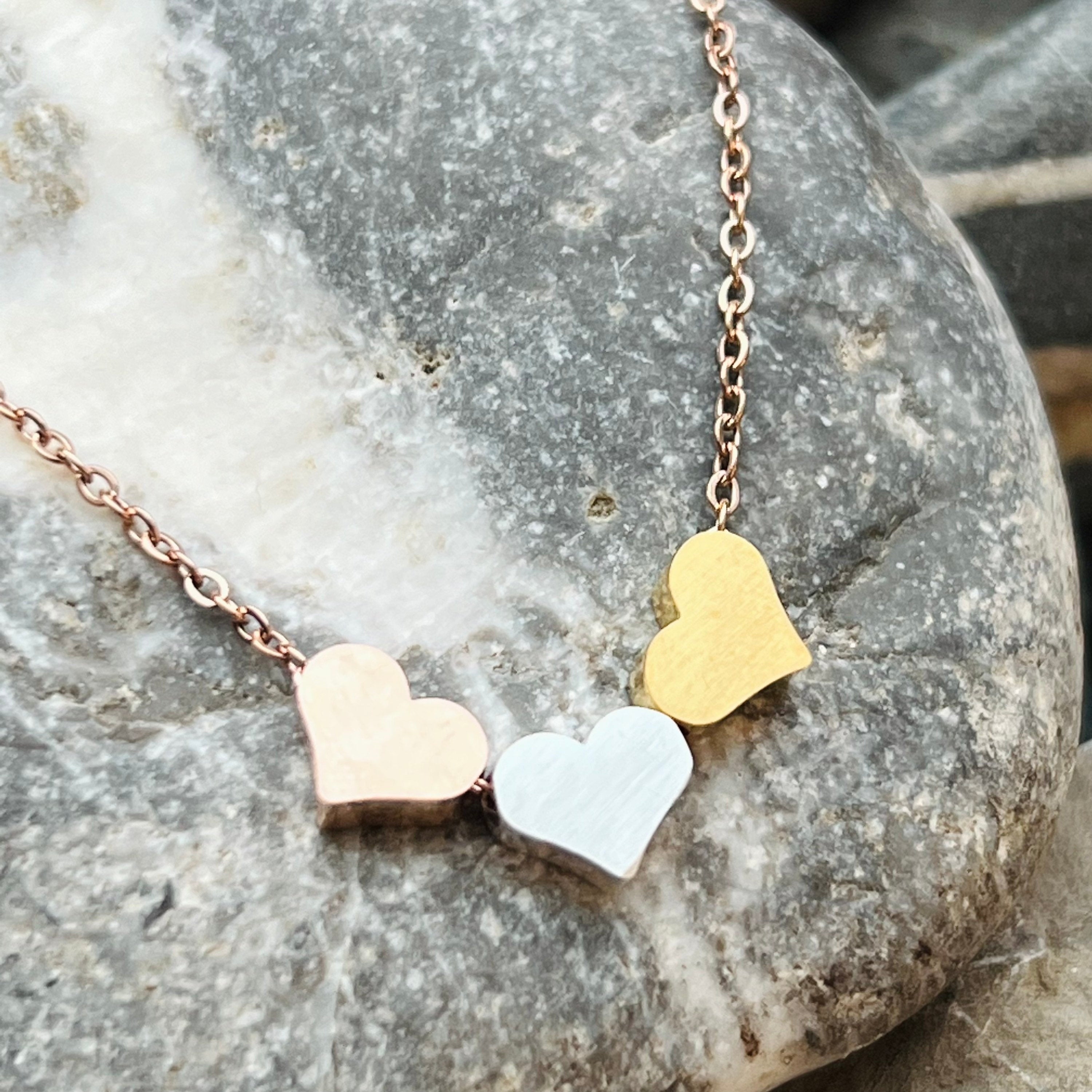 This lovely stainless steel three hearts necklace features a beautiful floating hearts design. The hearts are gold silver and rose gold stainless. This is a good choice for everyday wear. It is non corrosive and non tarnish. It is also hypoallergenic and can be worn by most people. It makes a perfect gift for yourself or a friend. The strong chain makes it a good choice for active lifestyles. It has an 18” link chain with extender that can be worn from 15”- 18”. The chain is available on three colours; silver, gold or rose gold. Please select the one you prefer.