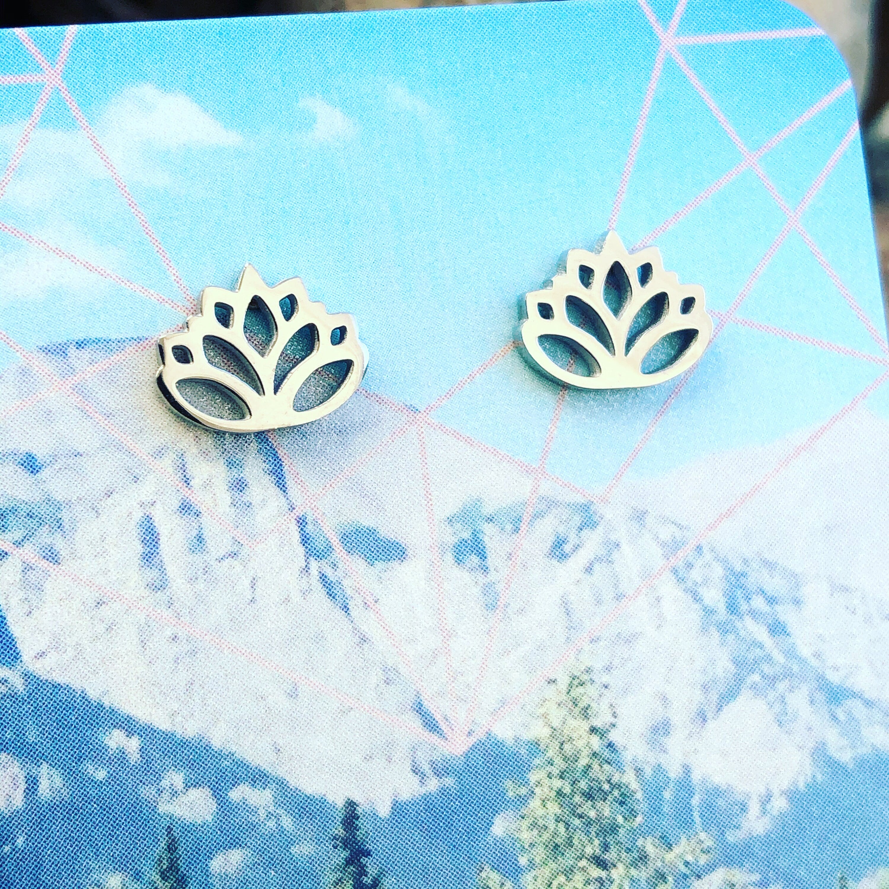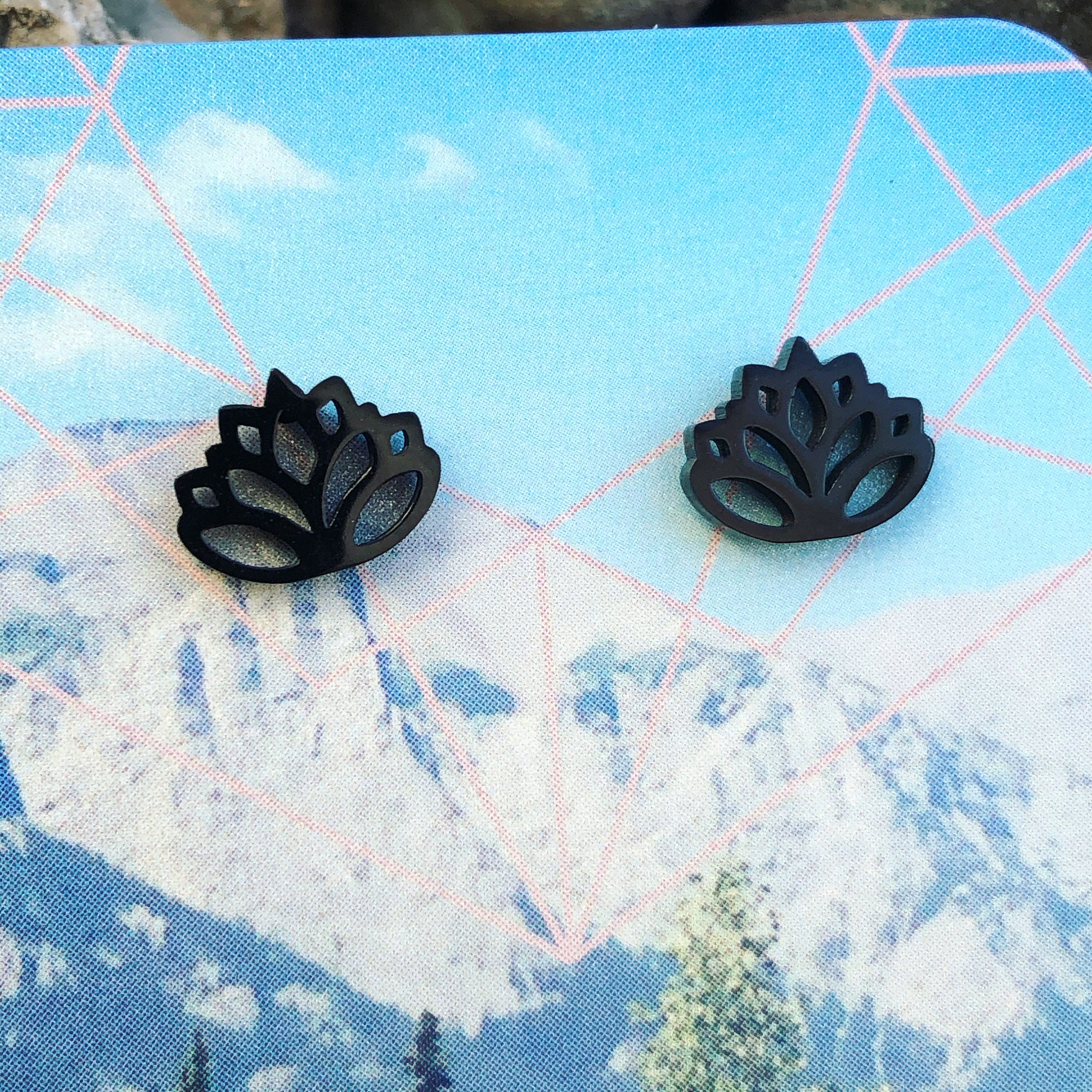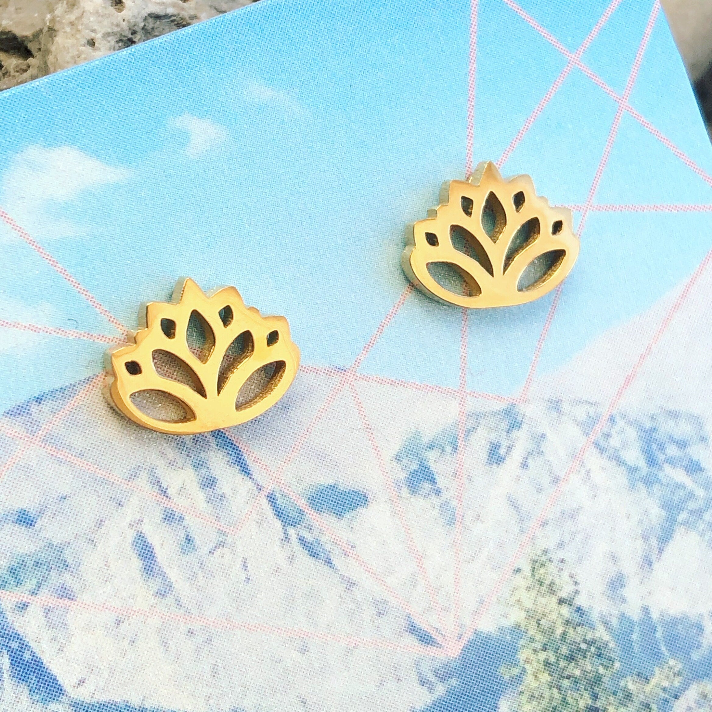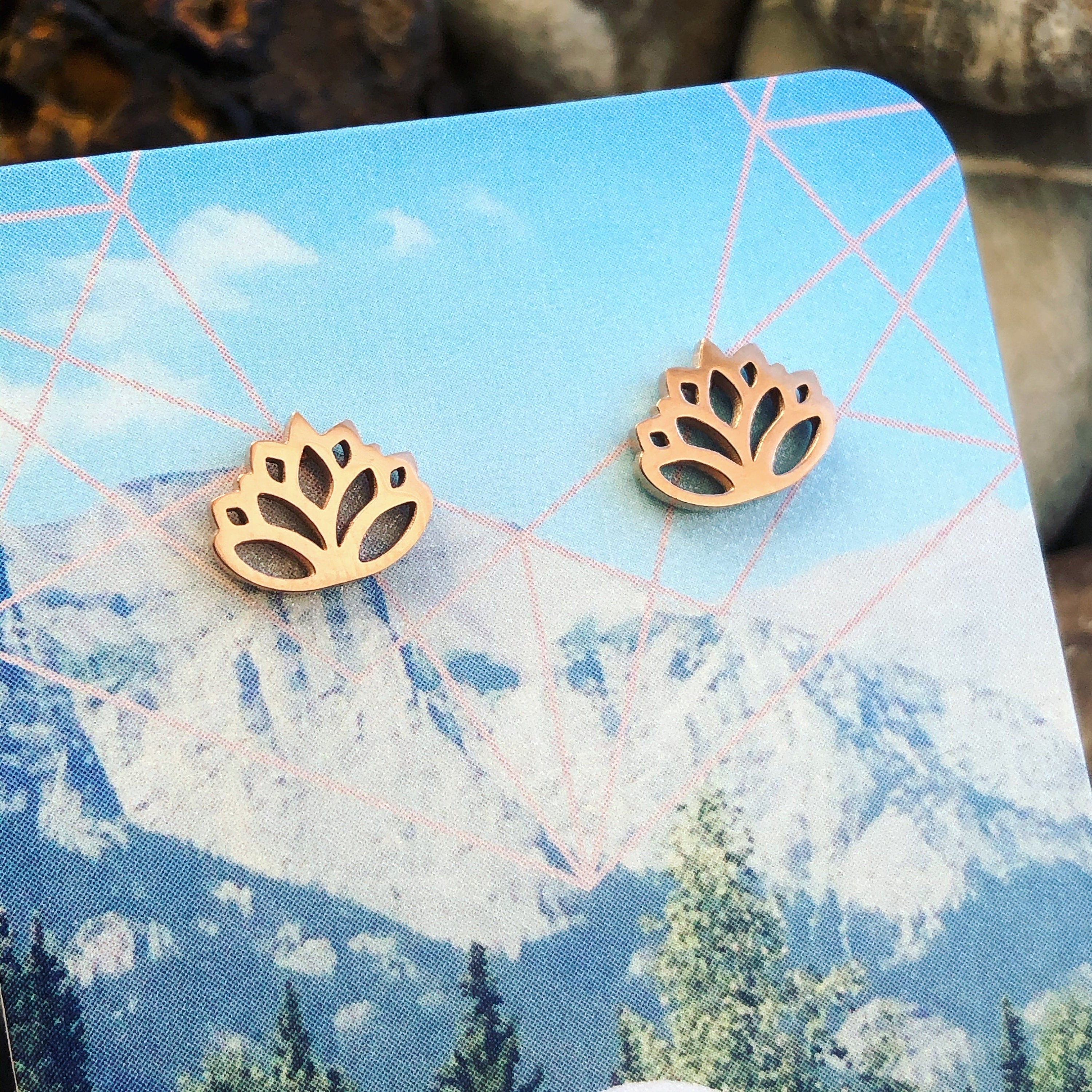 These cute lotus flower stud earrings are available in black, gold, rose gold or silver. The earring, post, and back see all stainless steel. They are a good choice for everyday wear. They are non corrosive and non tarnish. They are also hypoallergenic and can be worn by most people.